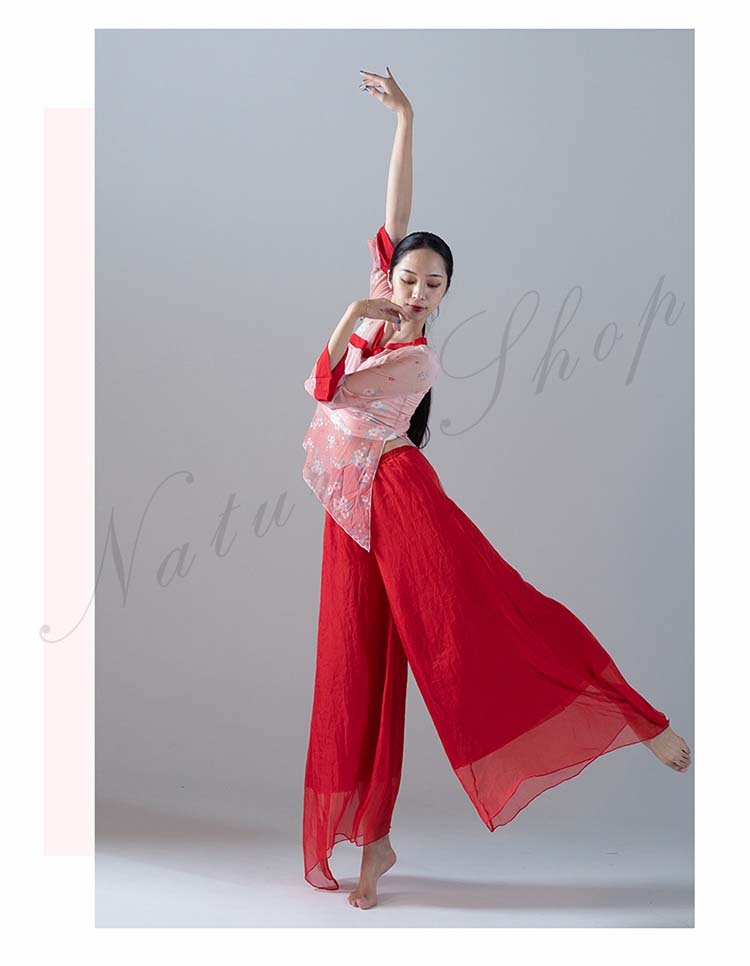 長袖 スリット ガウチョパンツ 練習着 M レッスンウェア ブラウス ピンク バレエ 不規則裾 衣装 民舞 ダンス ワイドパンツ 飄逸 中国風民族ダンス シフォン L シック 花柄 傘 S