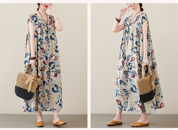 商品名 柄ワンピース ロングワンピース フレンチスリーブ レディース 花柄 夏 薄手 ワンピース 母の日 ギフト 綿 麻 夏服 ゆったり ビッグシルエット ロング丈 マキシ丈 プレゼント ママ カジュアル おしゃれ 可愛い きれいめ 夏物 普段着 30代 40代 50代 フリー 旅行 プリント