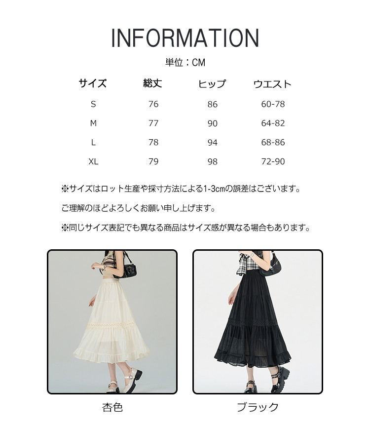 ※お取り扱い前に、商品付属タグの記載もご確認下さい。商品情報商品名 スカート レディース ボトムス ティアードスカート 裏地あり ウエストゴム ミモレ丈 可愛い カジュアル 夏素材 ポリエステルカラー ブラック|杏色サイズ S|M|L|XL生産国 中国包装について 環境保護の観点から、「簡易包装」を推進しております明細書について 当店ではエコロジーと個人情報流出防止のため、ご指示の無い限り明細書を発行しておりません。