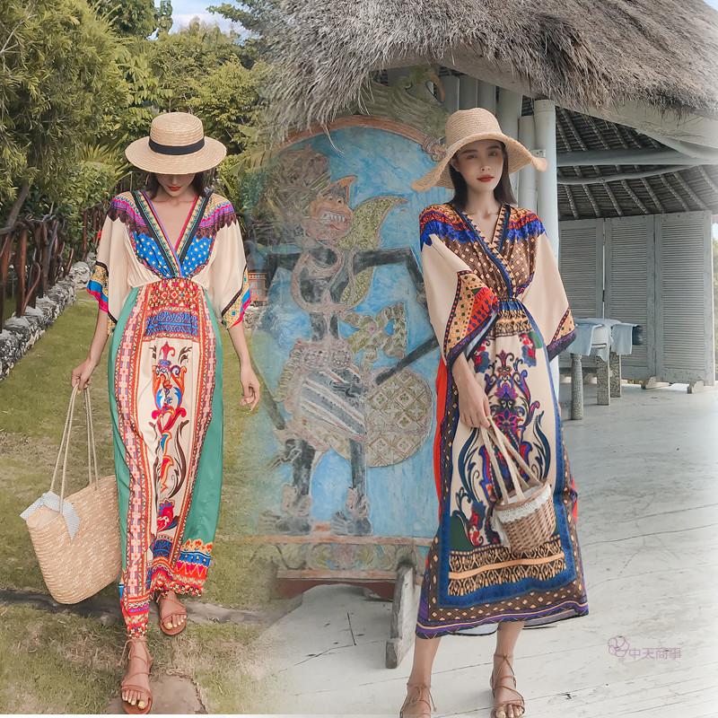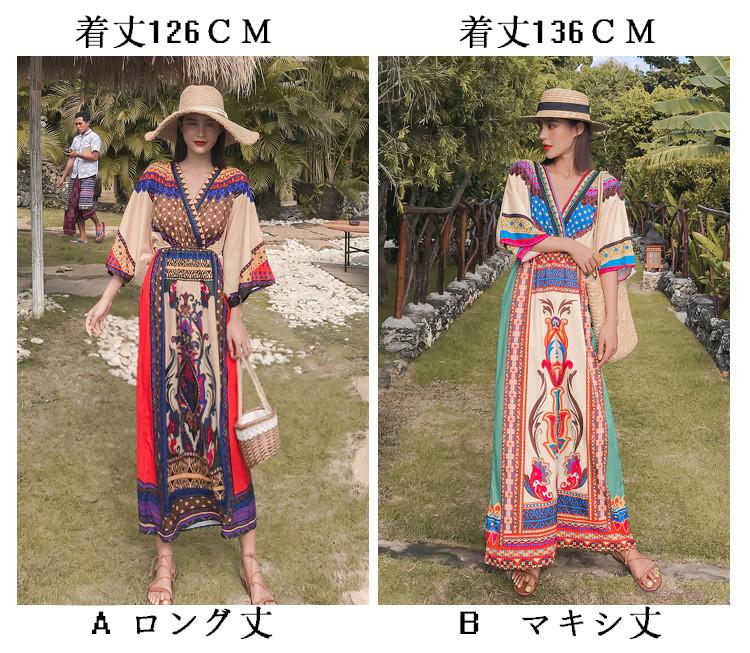 「送料無料」【chuutenn】リゾートワンピース Vネック ビーチ リゾート タイ 民族風 ロング丈 マキシワンピース 五分袖 ギャザー入り ウエストゴム 夏新作 エスニック マキシワンピース レディース ロング丈ワンピース カジュアル ワンピース キレイめ 大人 海 S/M/L/XL/XXL