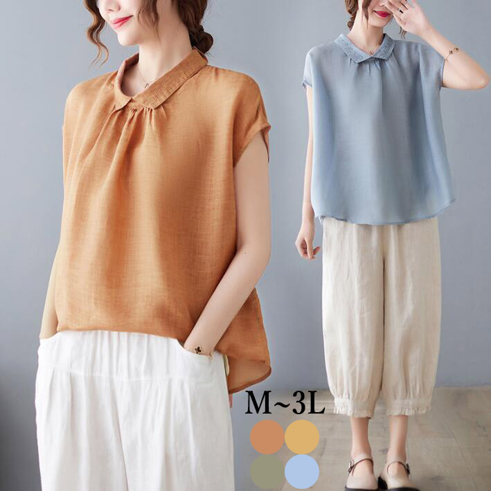 リネンブラウス レディース ブラウス 半袖 フレンチスリーブ トップス プルオーバー カジュアル シャツ