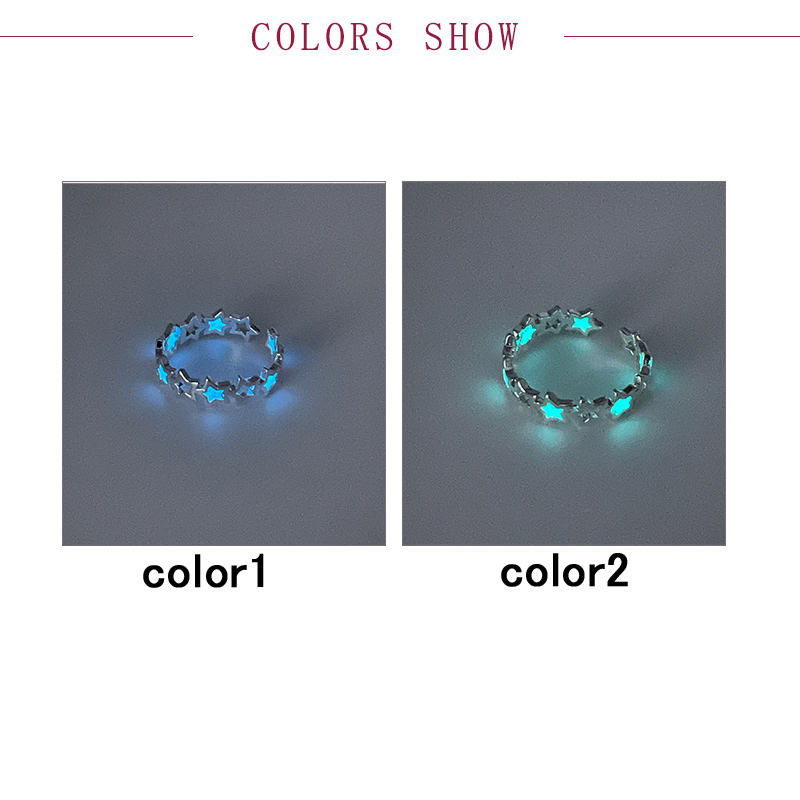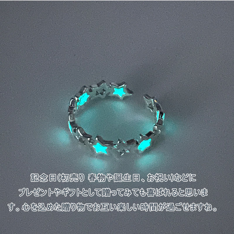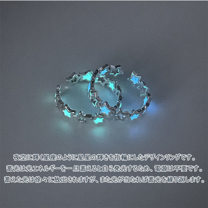 夜空に輝く星座のように星星の輝きを指輪にしたデザインリングです。蓄光は光エネルギーを一旦蓄えると自ら発光するため、電源は不要です。 蓄えた光は徐々に放出されますが、また光が当たれば蓄光を繰り返します。