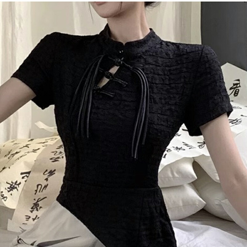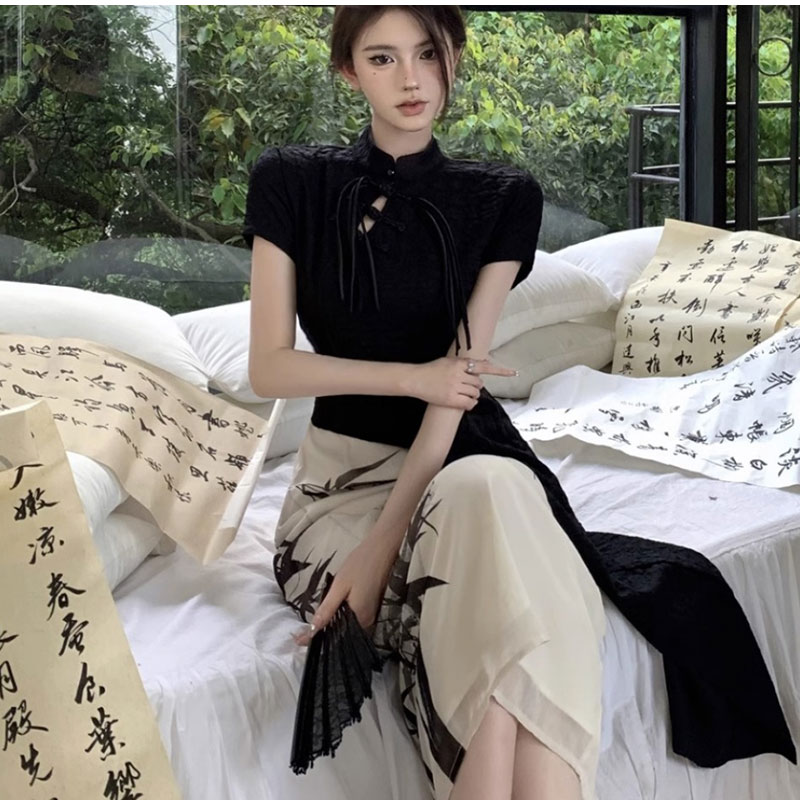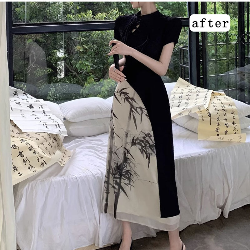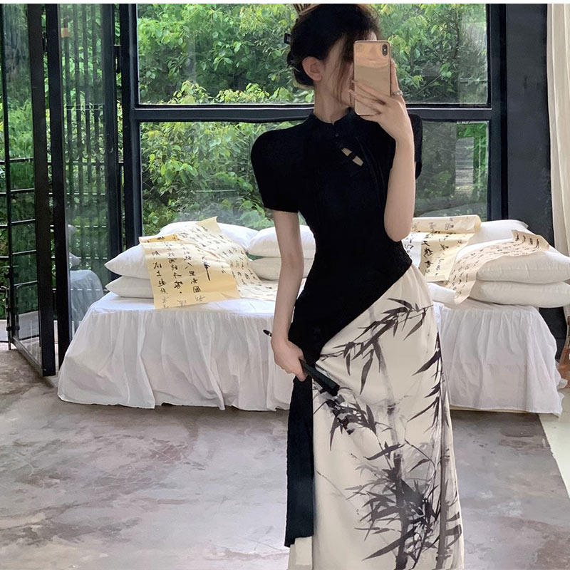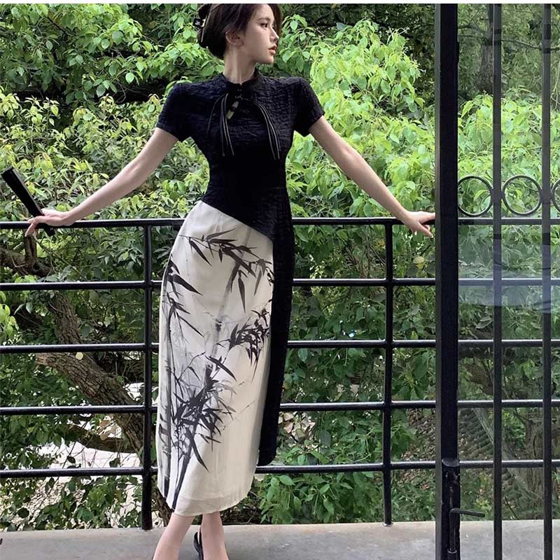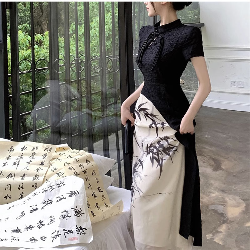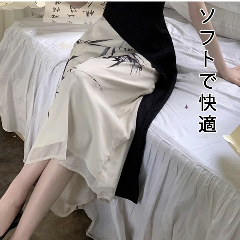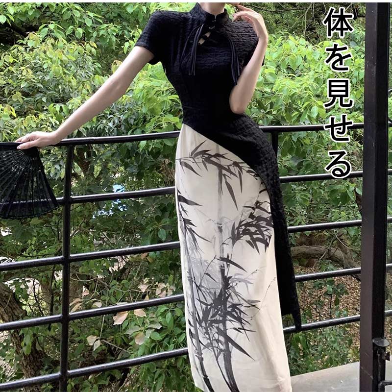 チャイナ服 水墨風花プリントロング中華