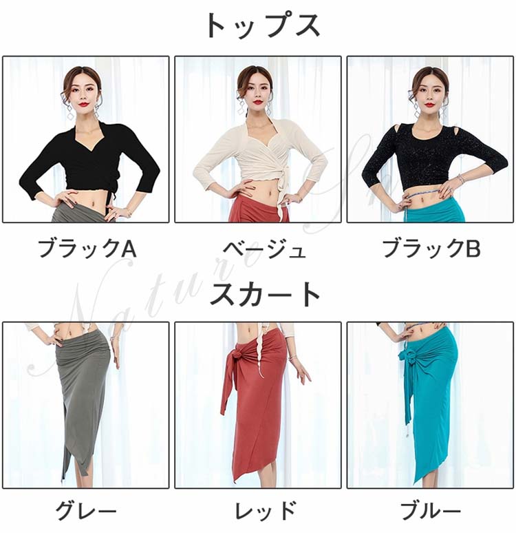 サイズ: トップス(黒A) トップス(ベージュ) トップス(黒B) スカート(灰) スカート(赤) スカート(青)