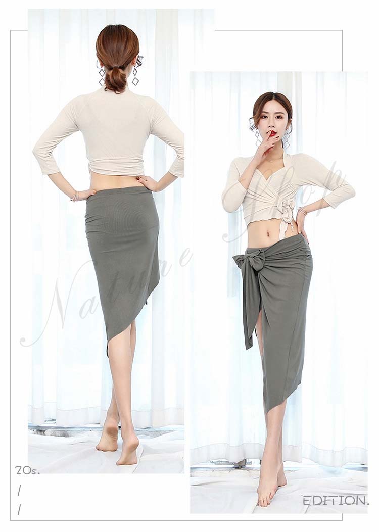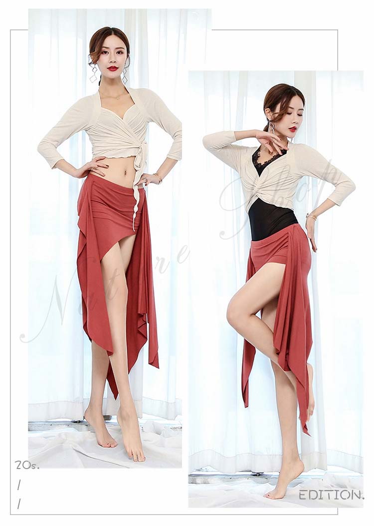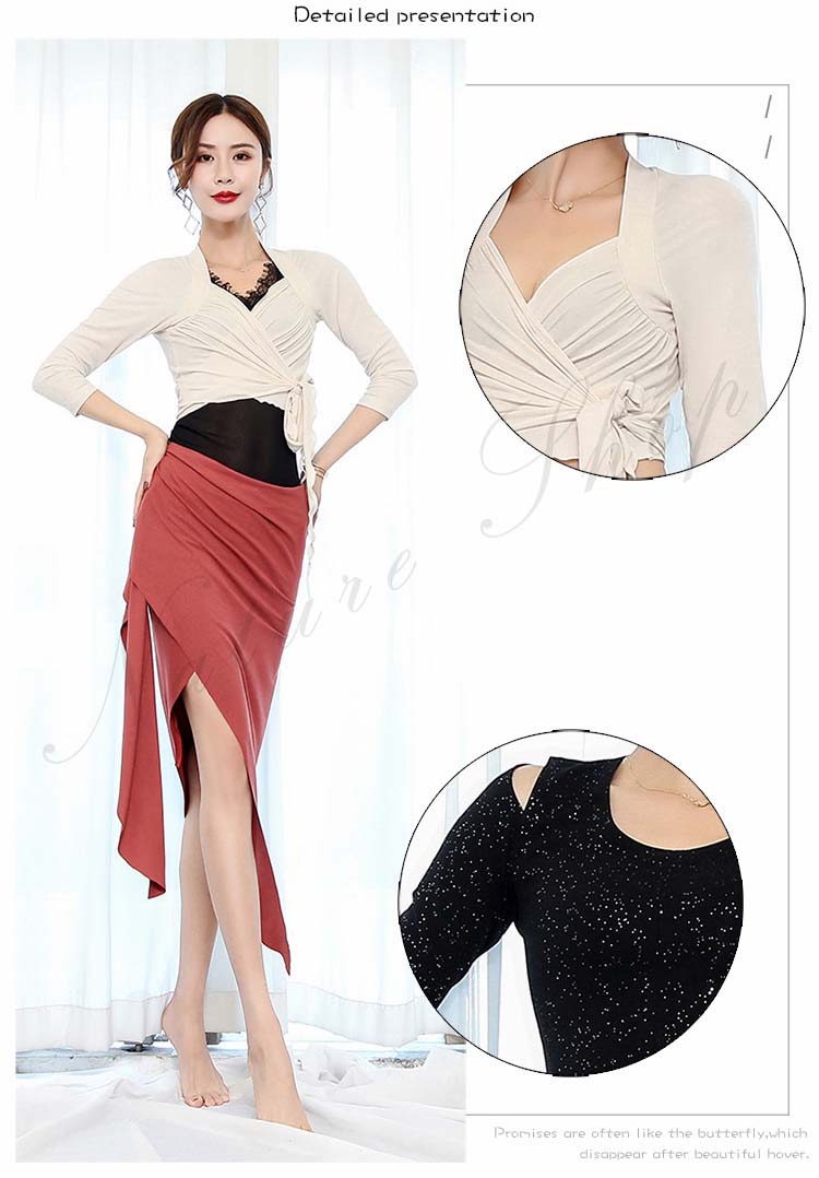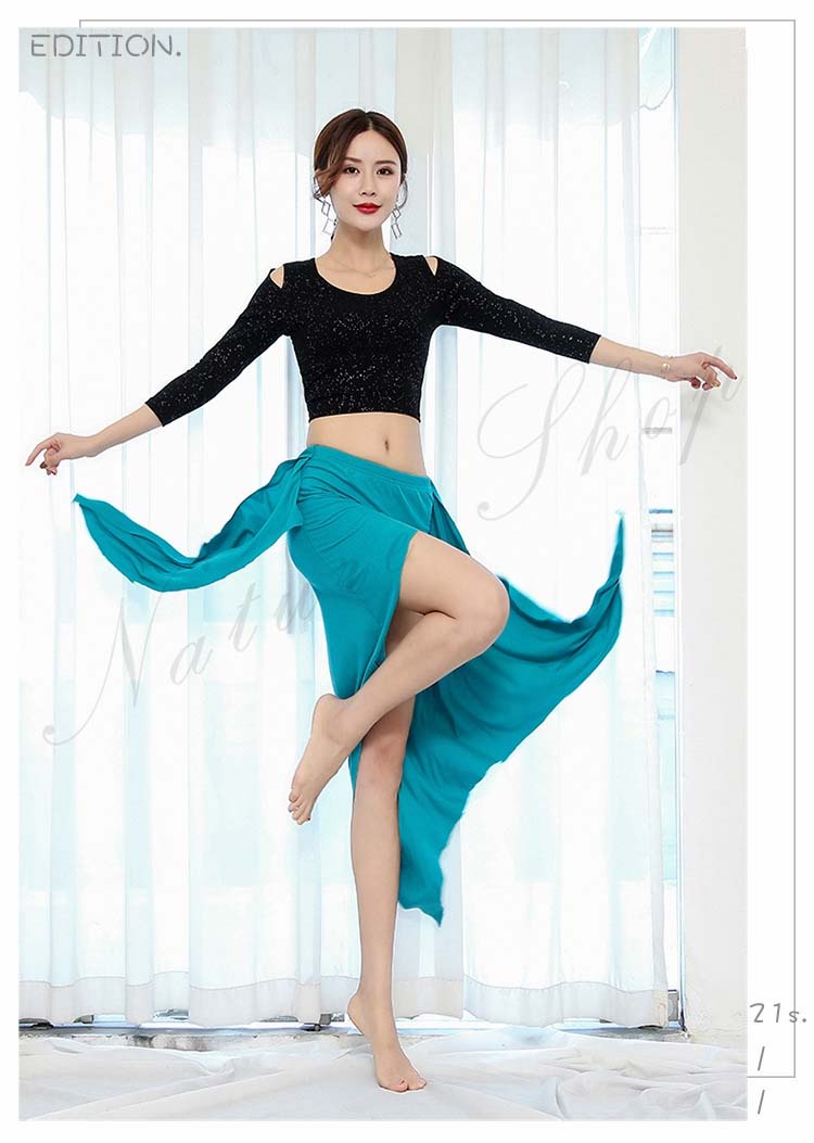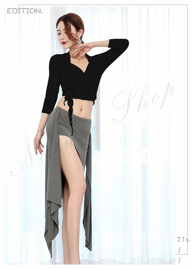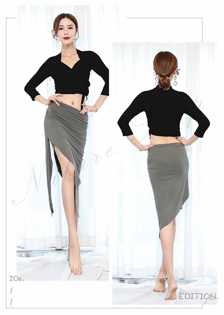 ベリーダンス 衣装 レッスン着 長袖 トップス ロング丈スカート 白 黒 Vネック 前クロス 無地 黒 肩出し 丸襟 キラキラ 2種類 自由に選べる セットアップ ラテンダンス