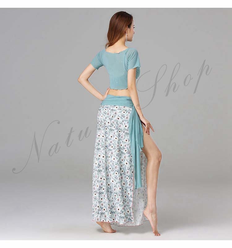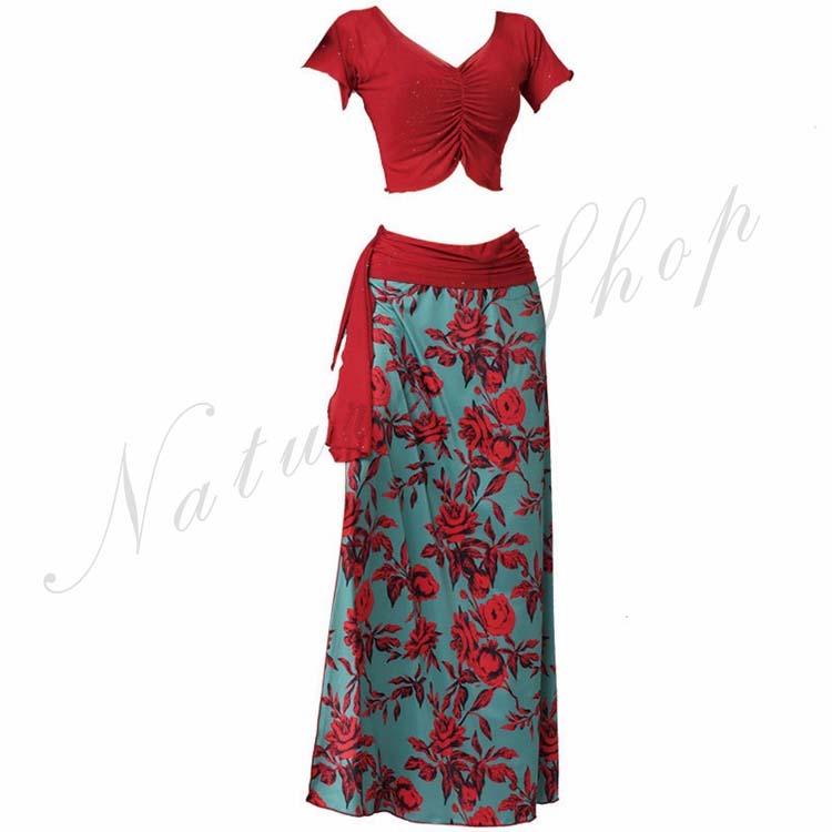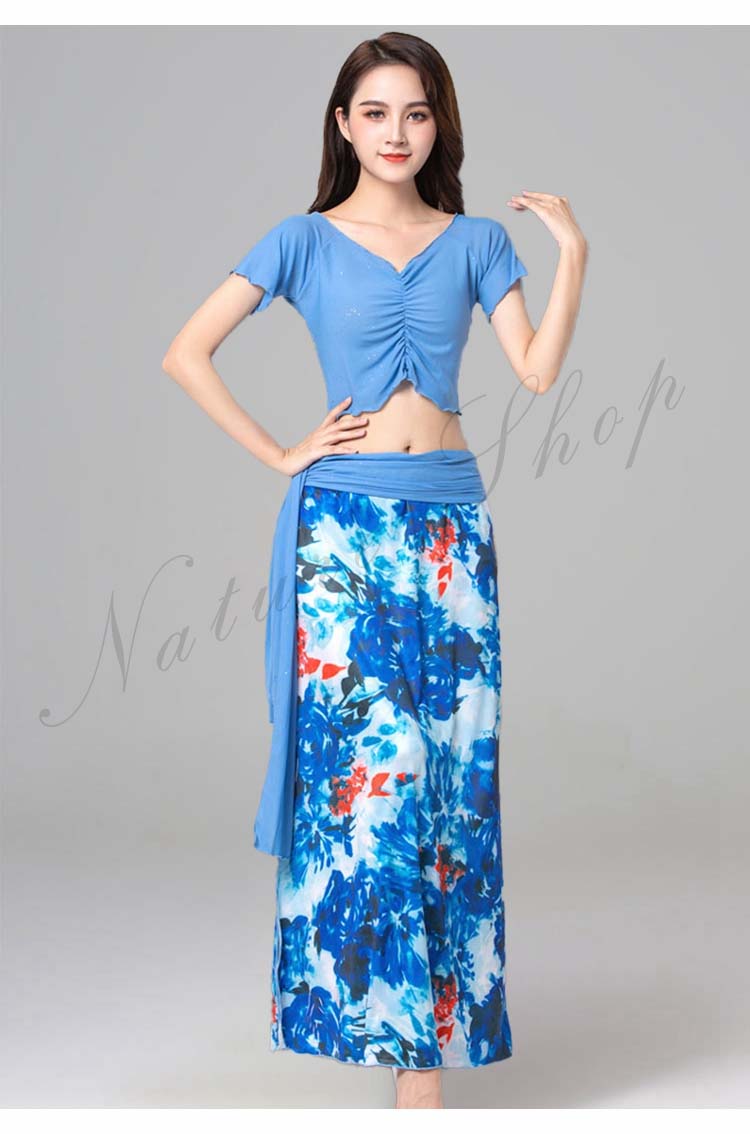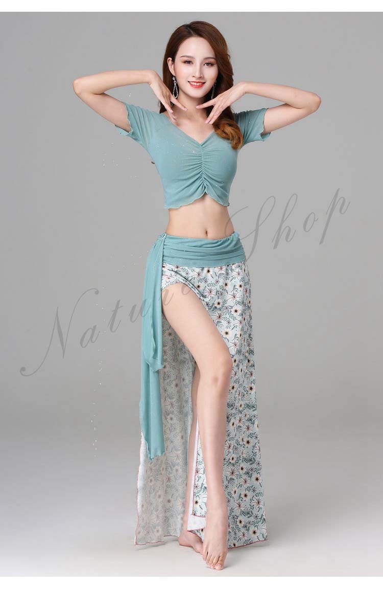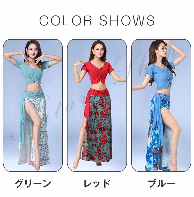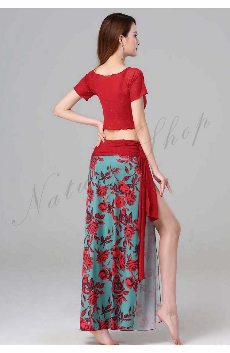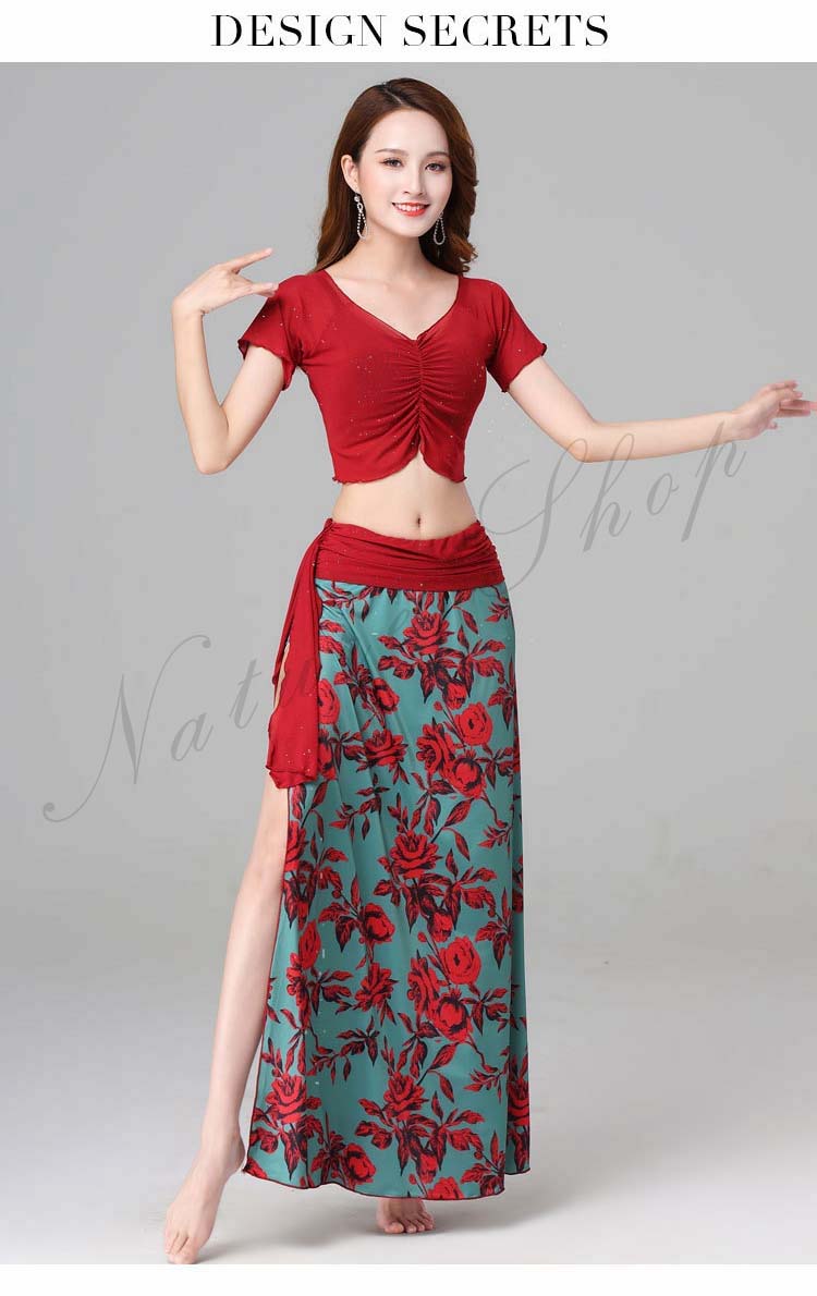 ベリーダンス レッスン着 セットアップ 衣装セット トップス スカート Vネック 半袖 ロング丈 2点セット 夏 赤 青 花柄 ロングスカート 上質 セクシー ラテンダンス