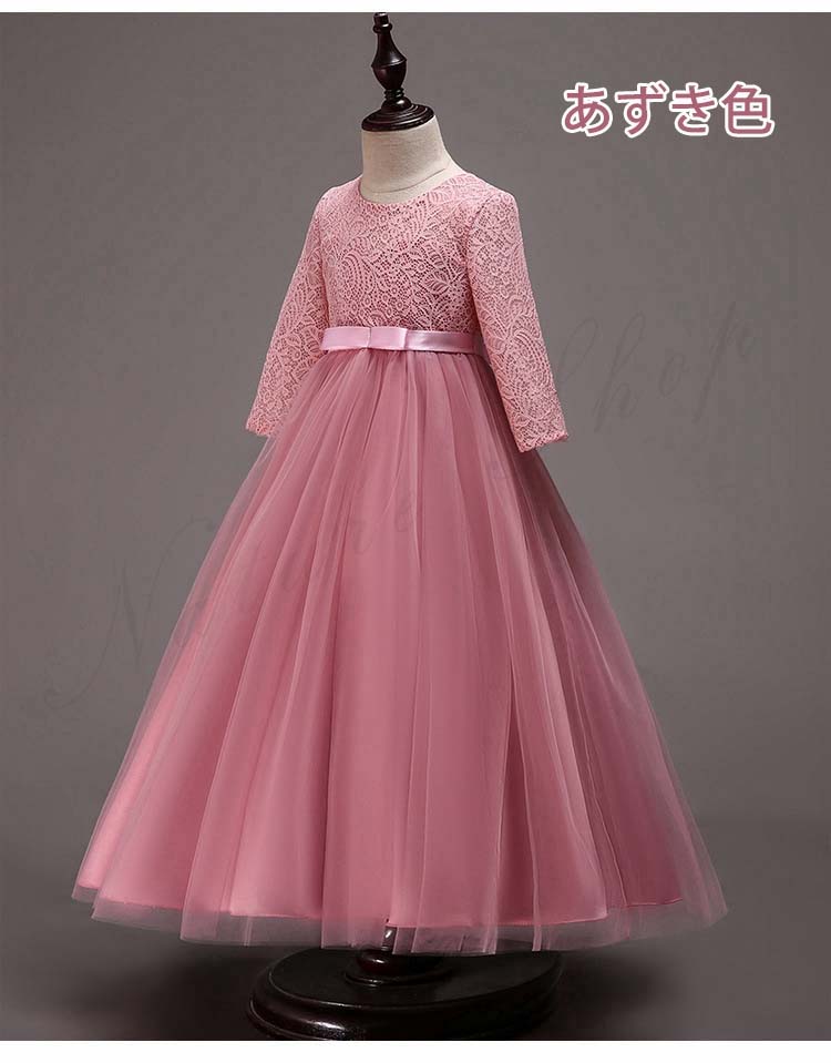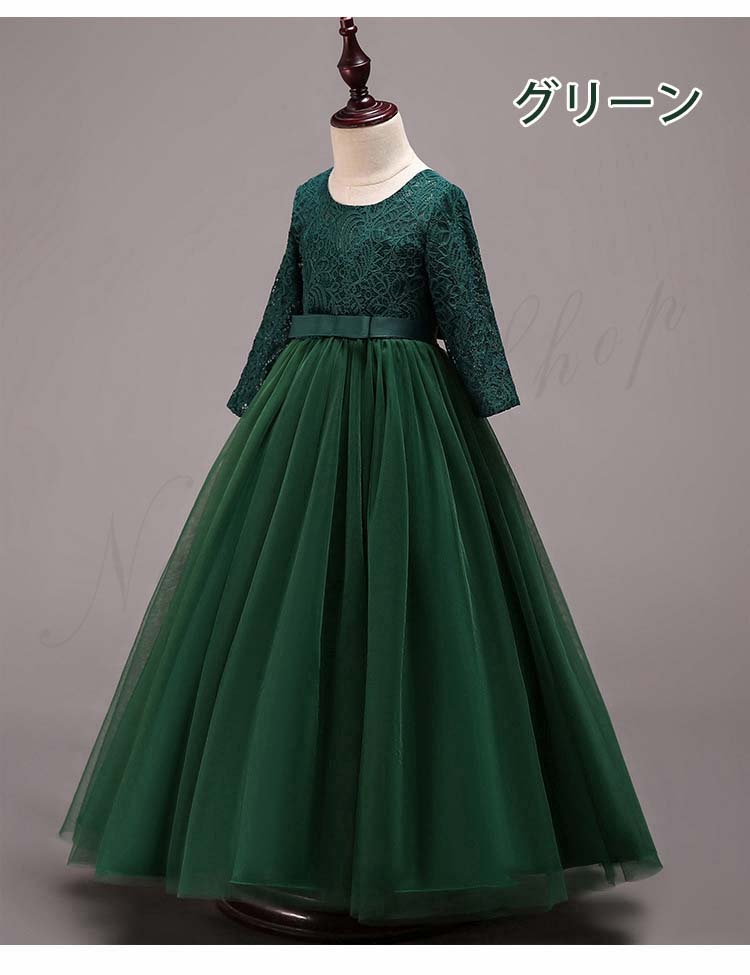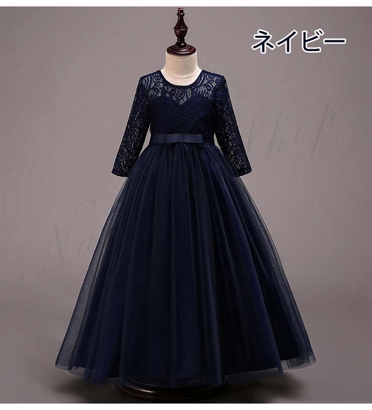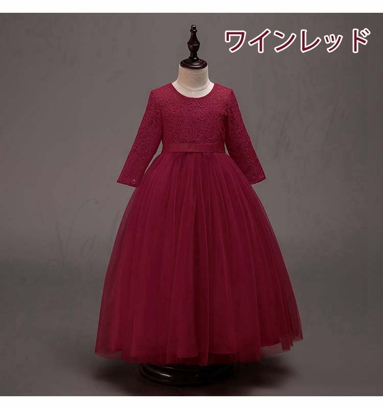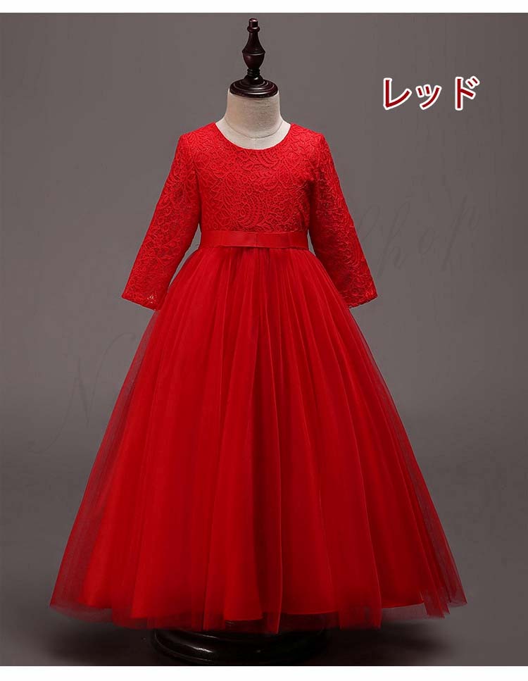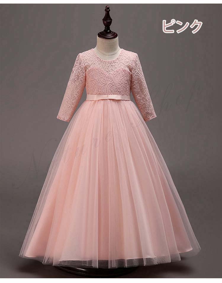 ウェディングドレス ジュニア コンクール ドレス 子供ドレス ピアノ 発表会 ワンピース 長袖 ロング 無地 総レース バックジッパー リボン チュールスカート 結婚式