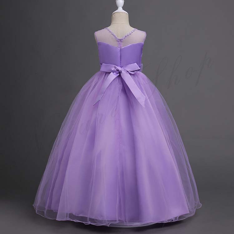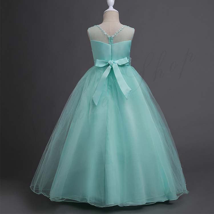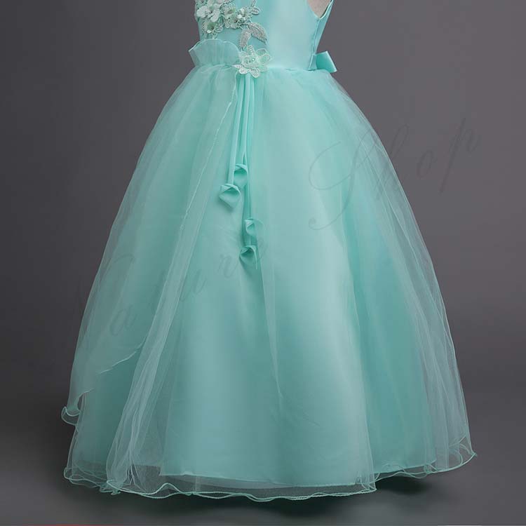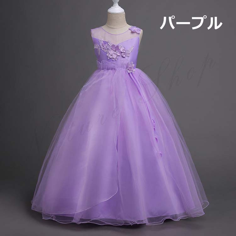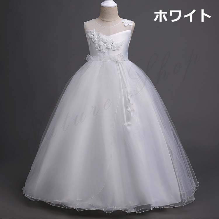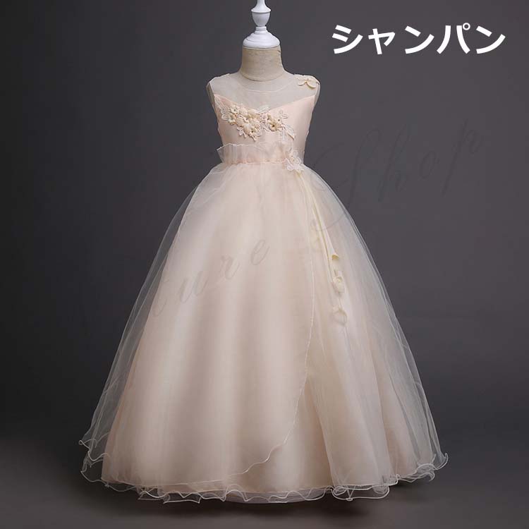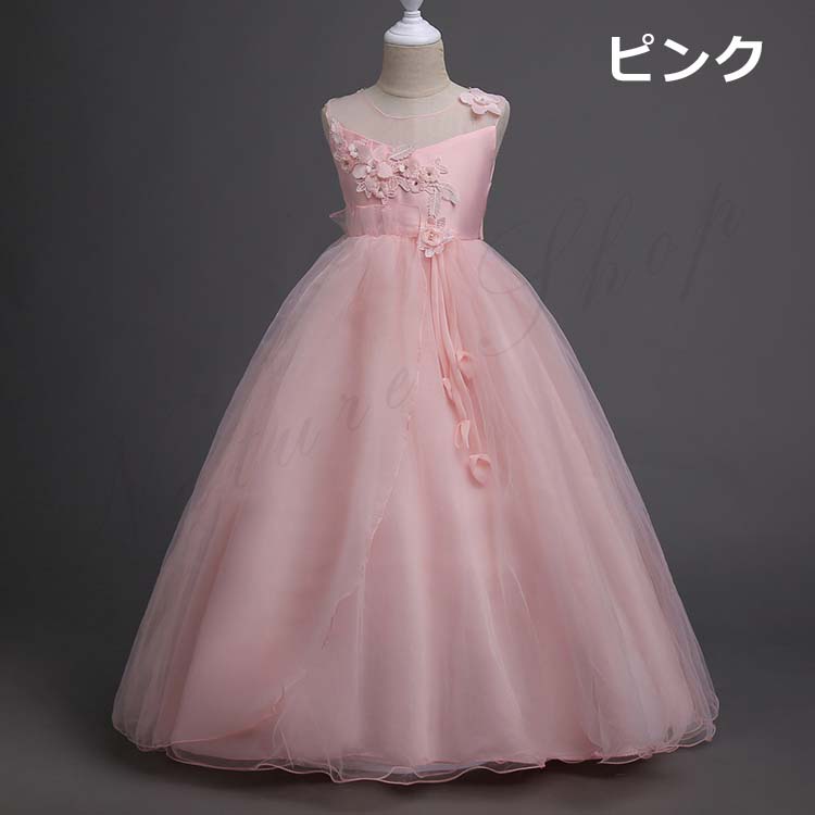 ドレス 子供 ピアノ 発表会 コンクール 紗 チュールスカート キッズ 袖なし ノースリーブ かな飾り 葉柄 ファッション ロングドレス チュール ロング ワンピース 夏