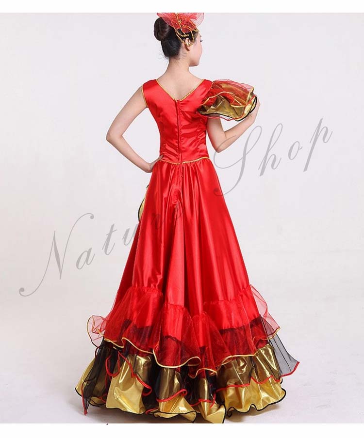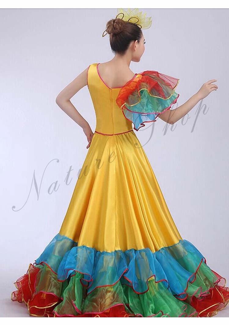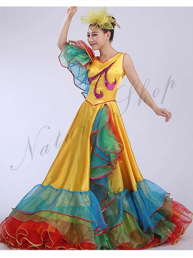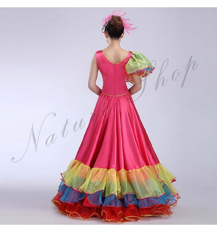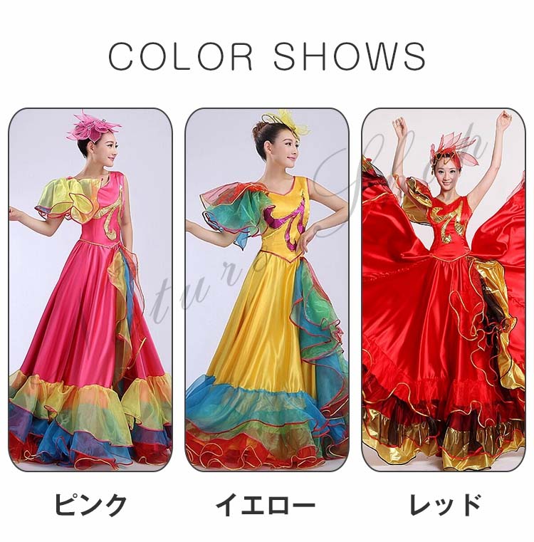 フラメンコワンピース イベント団体ステージダンス衣装 パーティー モダンドレス タンゴ ワルツ大型舞台ステージ衣装 合唱団社交ラテンダンス衣装 華やか舞台ダンスフレアワンピース