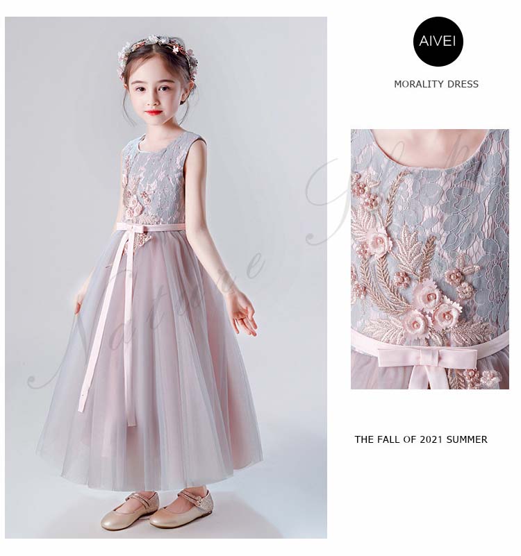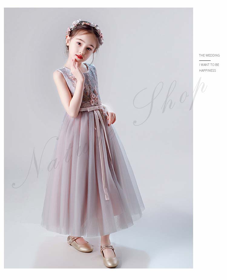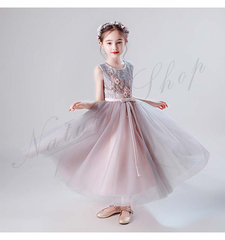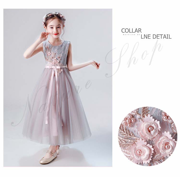 子供 ドレス 発表会 ロング 120 袖なし ノースリーブ ワンピース 夏 レディース きれいめ ドレス 子供 ピアノ 発表会 花柄 花飾り 刺繍 チュールスカート キッズ 七五三