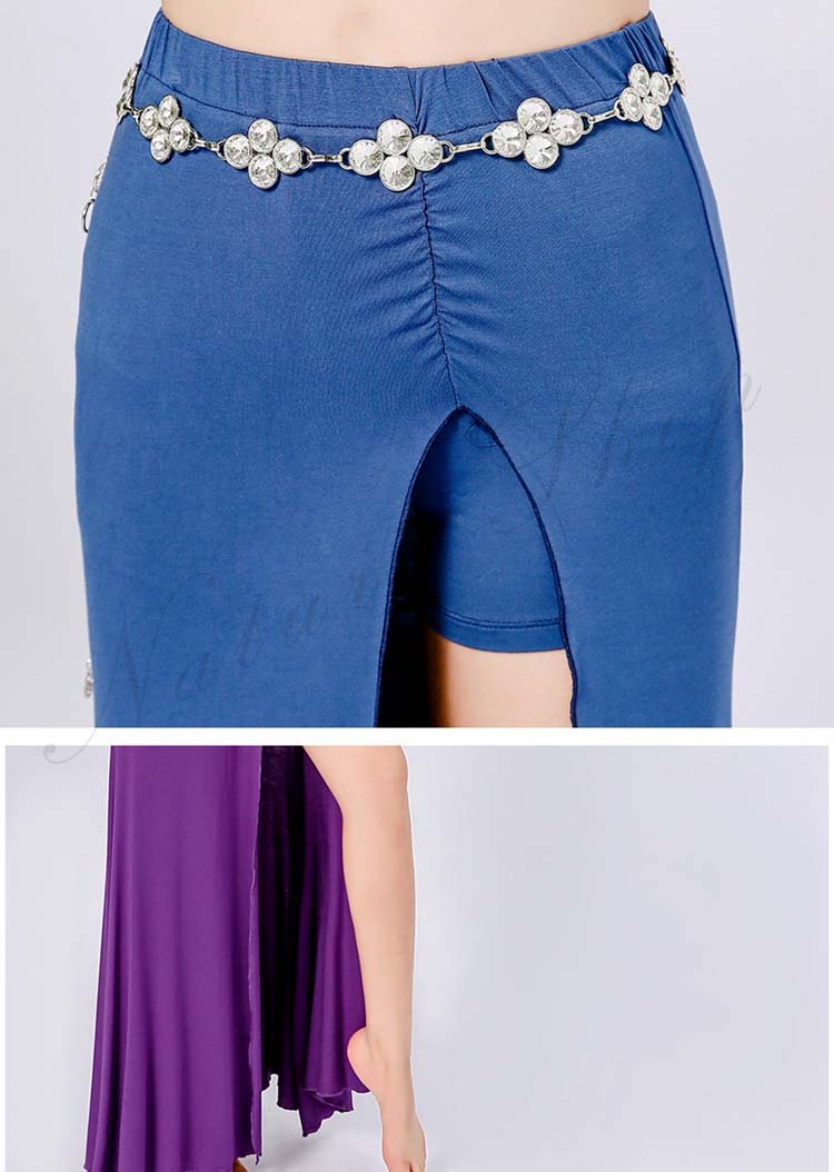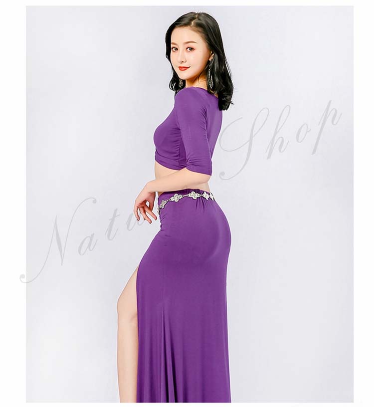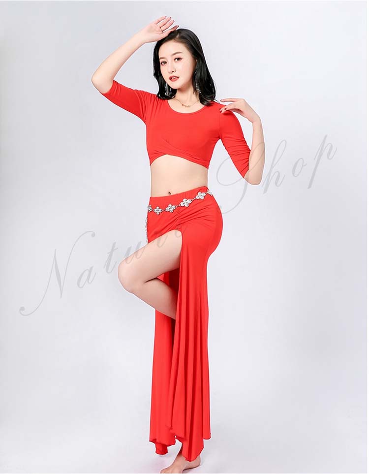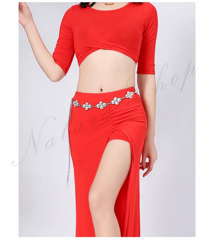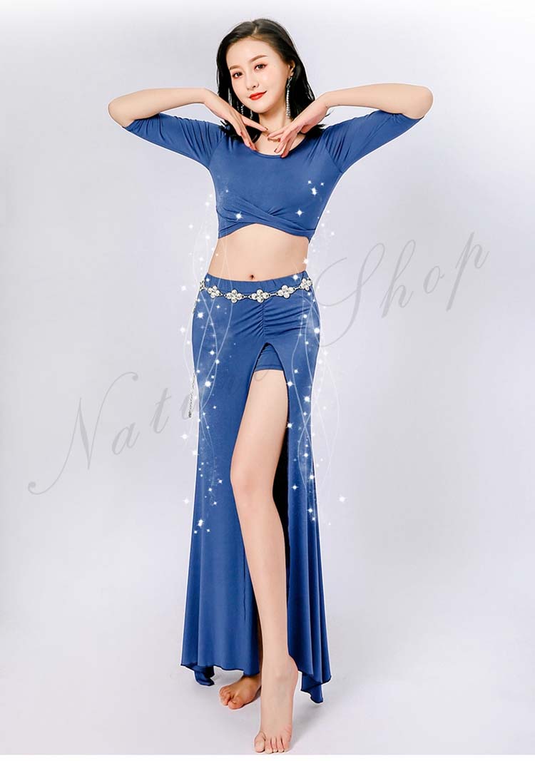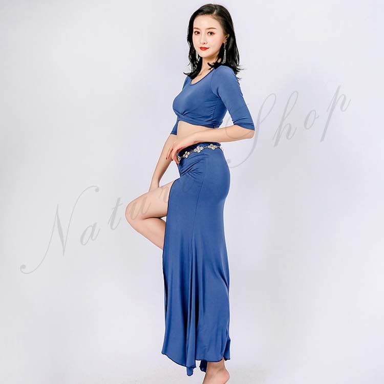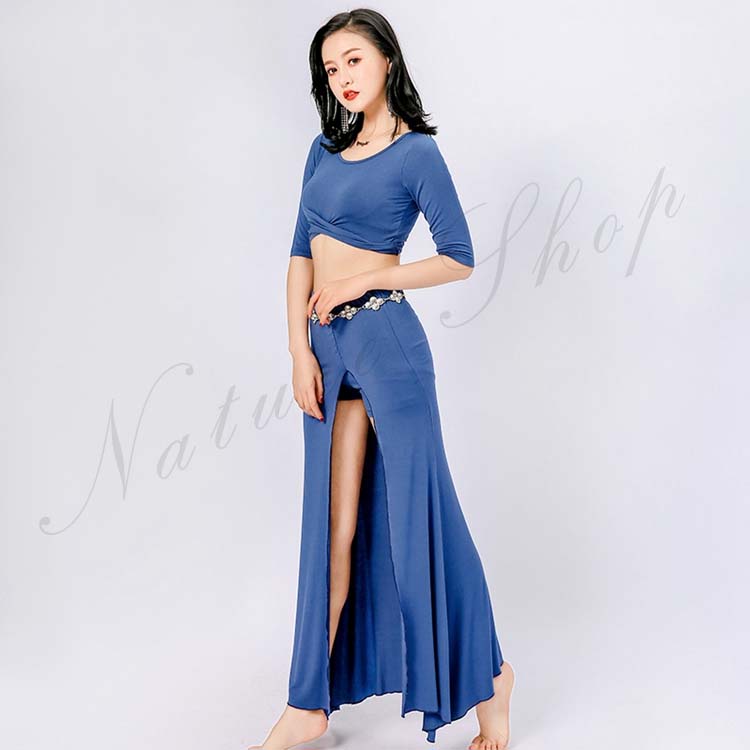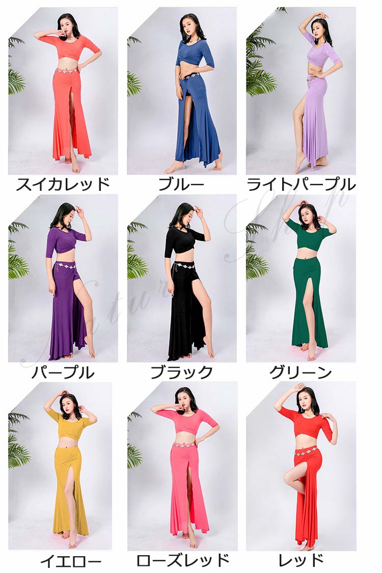 ベリーダンス レッスン着 セットアップ 衣装 セット 半袖 トップス 単品 ロング丈 スカート 2点セット 五分袖 前クロス お腹出し ベリーダンス衣装 無地 9color M L XL