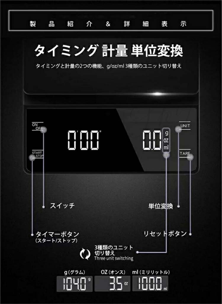 計り電子秤 測定重量 単位変更 計量器 キッチンスケール コーヒー 電子スケール 3kg 0.1g 軽量 食品 デジタルスケール キッチン 高品質 バランス 多機能 LED液晶付き