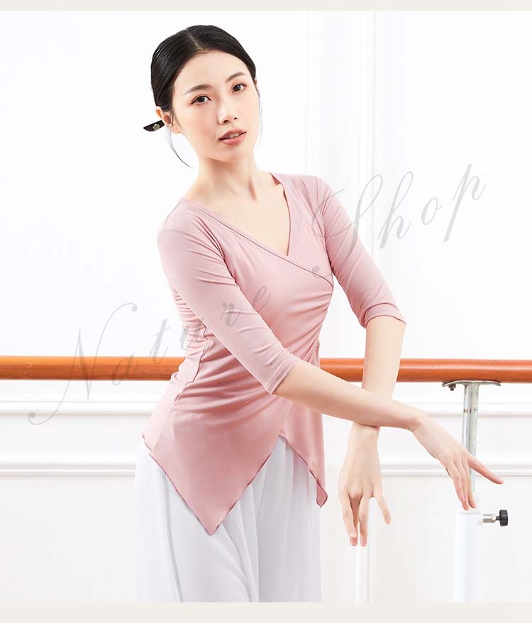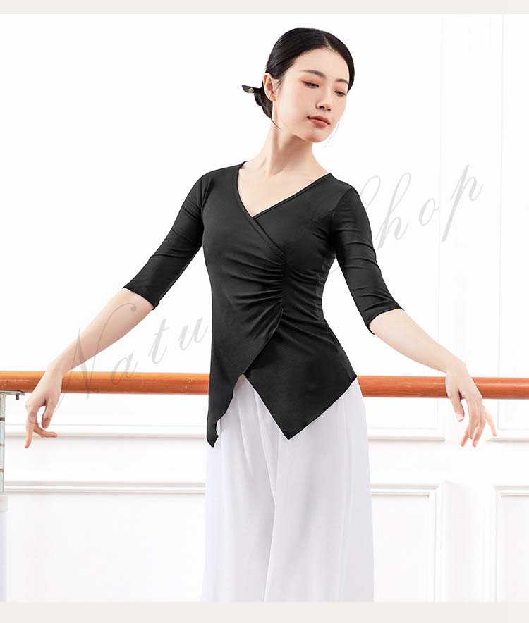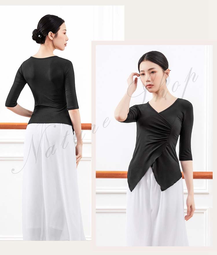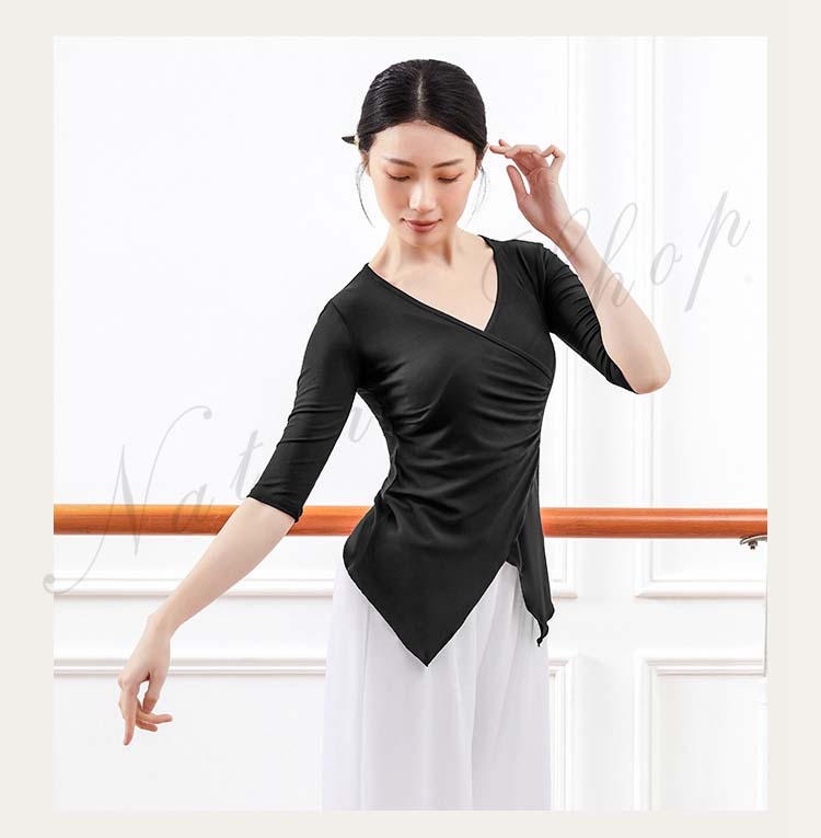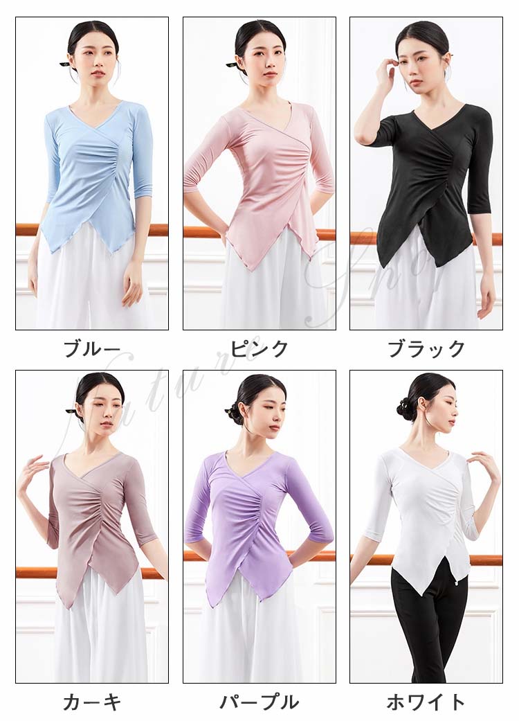 レディース Vネック 練習着 春夏新作 黒 ピンク 五分袖 紫 衣装 Tシャツ バレエ 社交ダンス ダンスウェア レッスン着 大人 エレガント ベリーダンス S アシンメトリー トップス