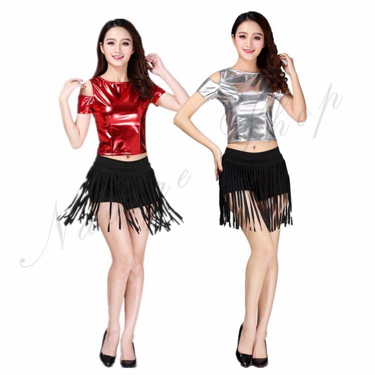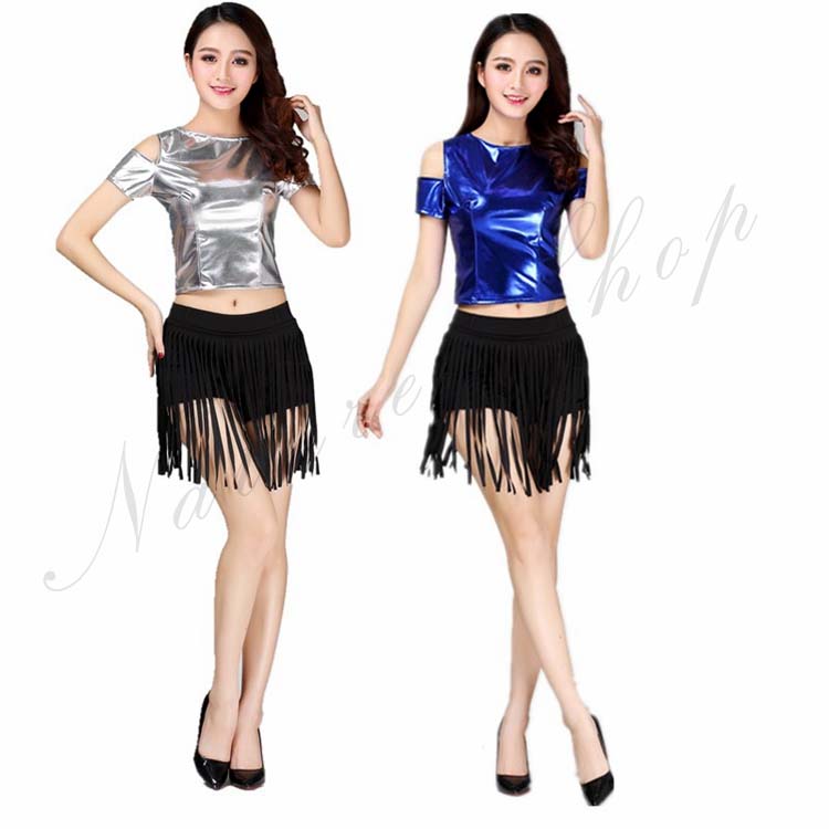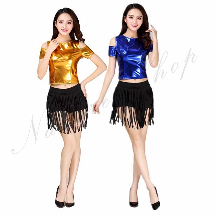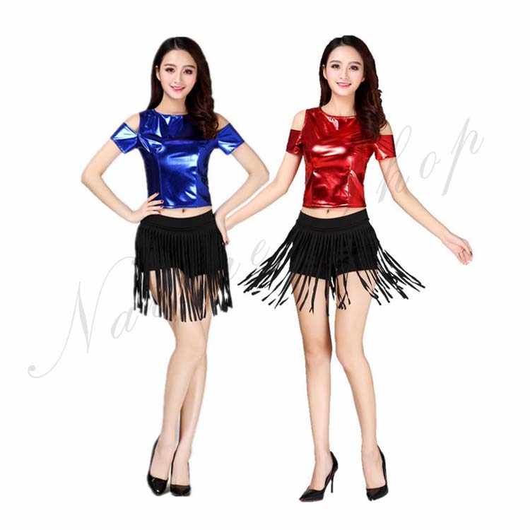 合皮 ショートパンツ 公演服 金 2XL S 半袖 M ダンス衣装 Tシャツ+フリンジ付き ダンスウェア メタリック 青 演出服 銀 チアリーディング ステージ衣装 3XL ジャズ 光沢