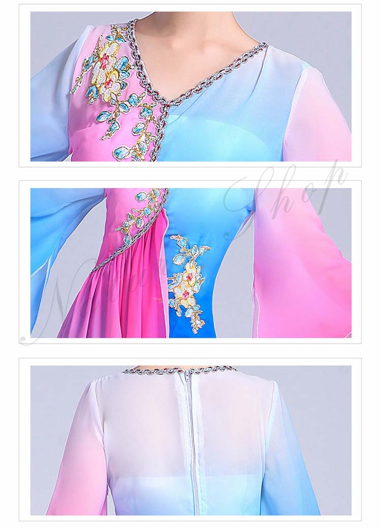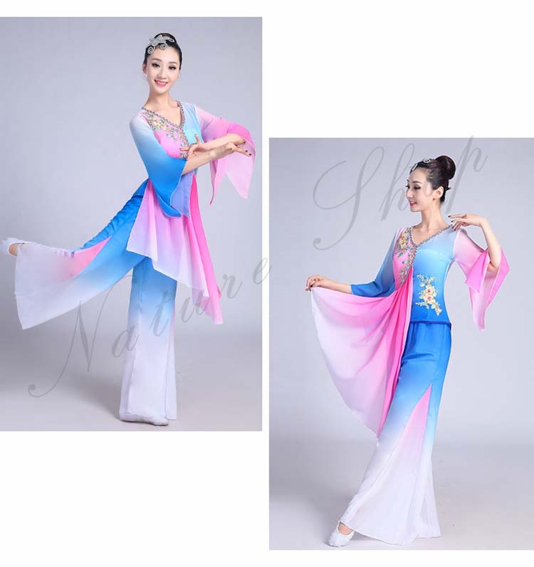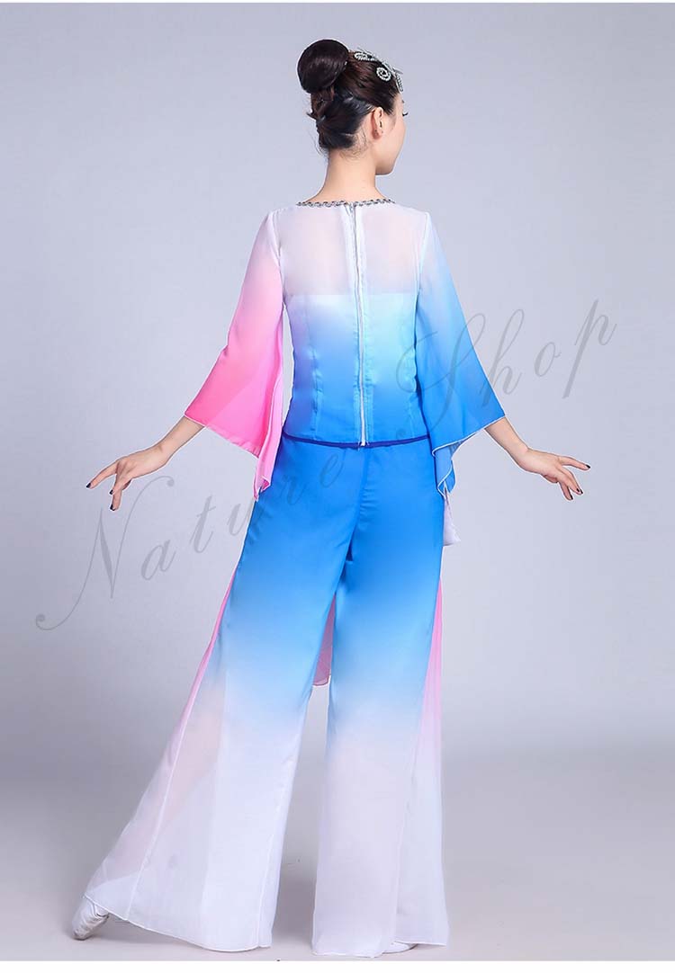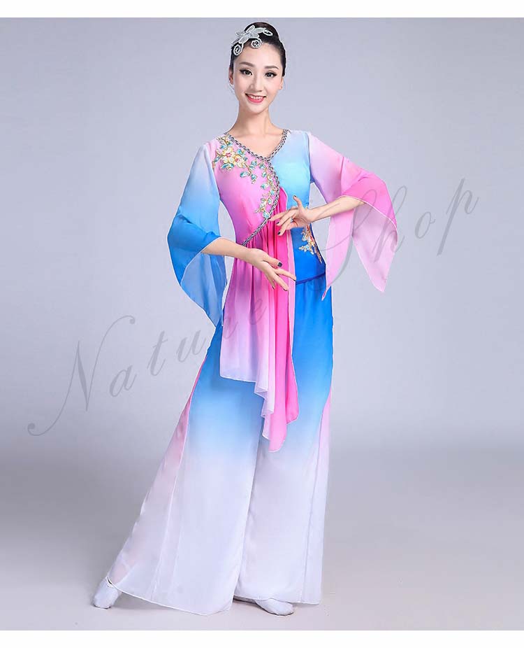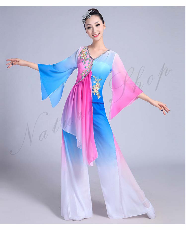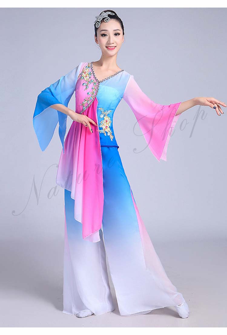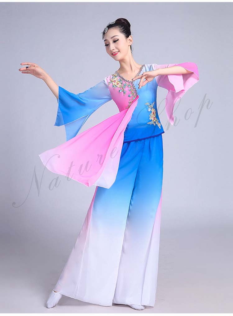 古典舞踊 エスニック 花 レディース 大人用 民族ダンス XS~3XL セット 衣装 水袖トップス ワイドパンツ エレガント チャイナ風舞台衣装 演出衣装 スリット 飄逸 配色 チャイナ風
