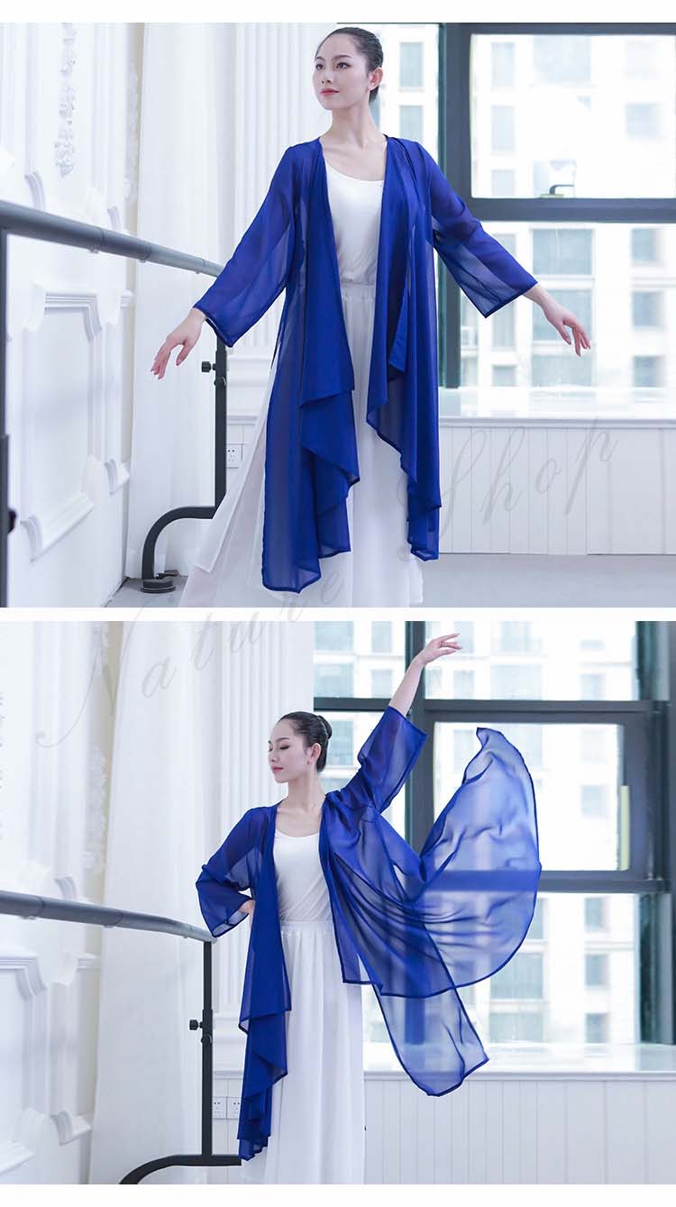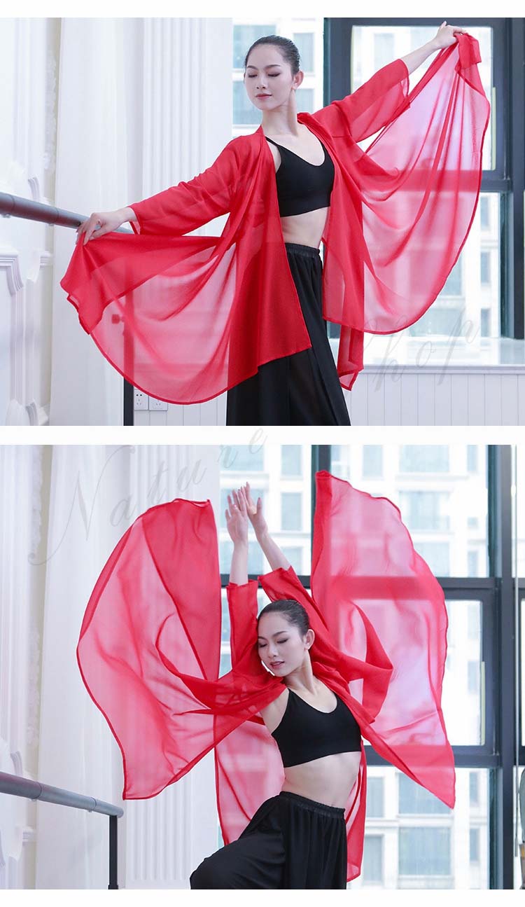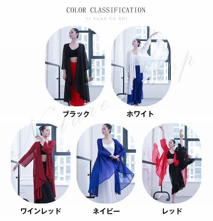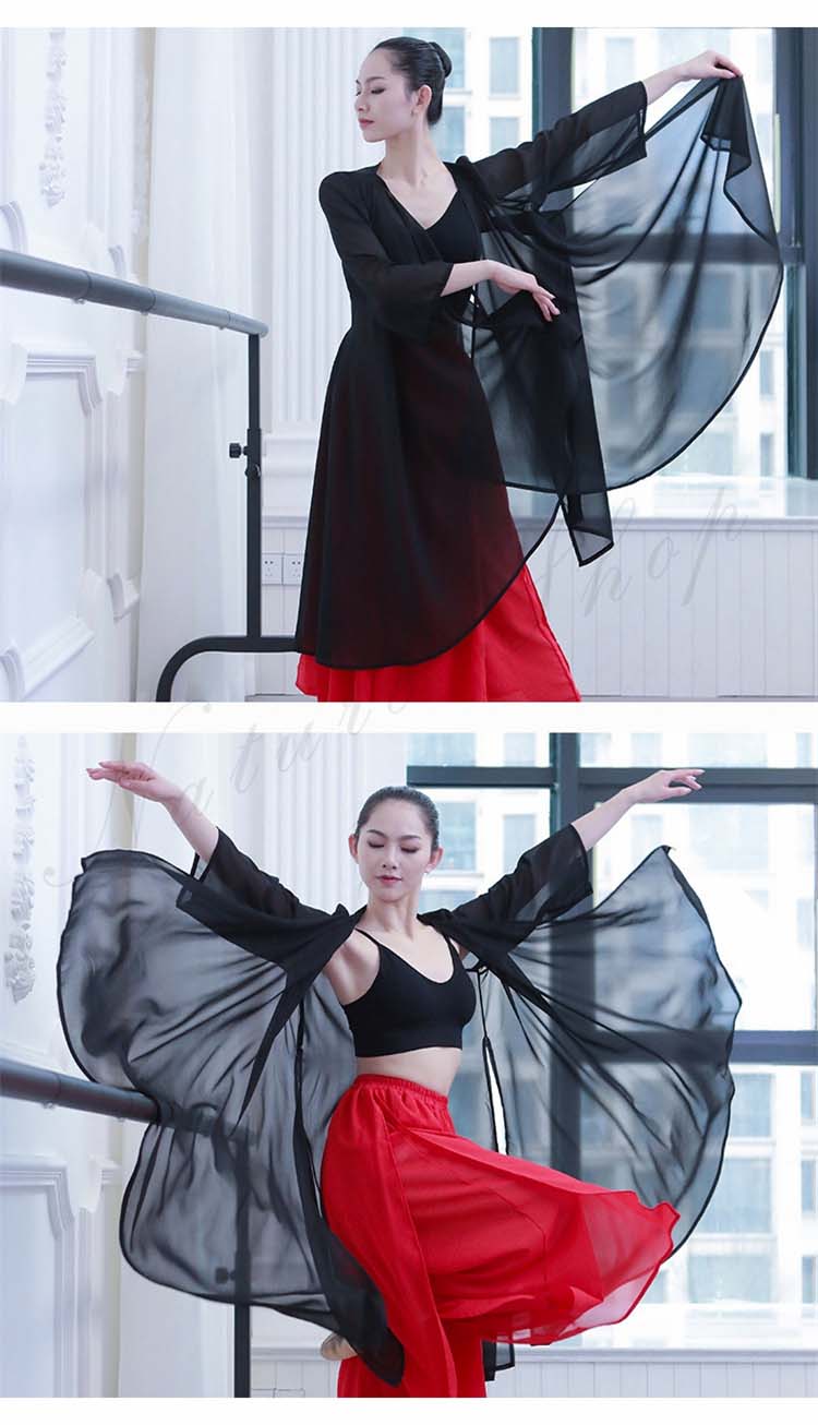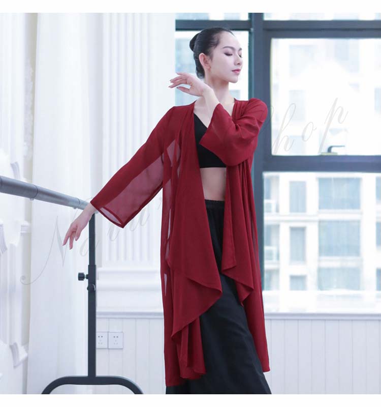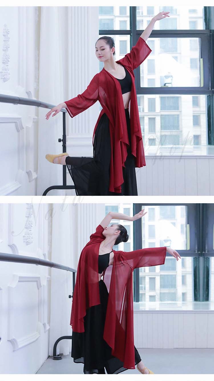 レッスン着 チャイナ服 レディース用古典舞踊ダンス衣装 前開き ブラウズ ロング羽織 オーバー羽織コート ロングシフォン羽織 中国民族ダンス衣装 紗 サイドスリット 大きめ