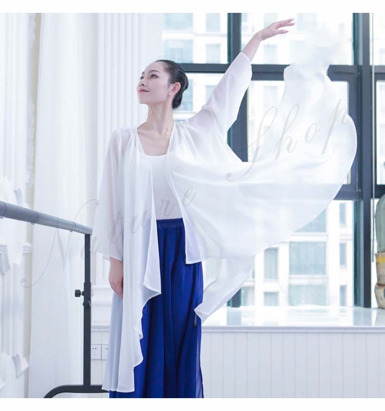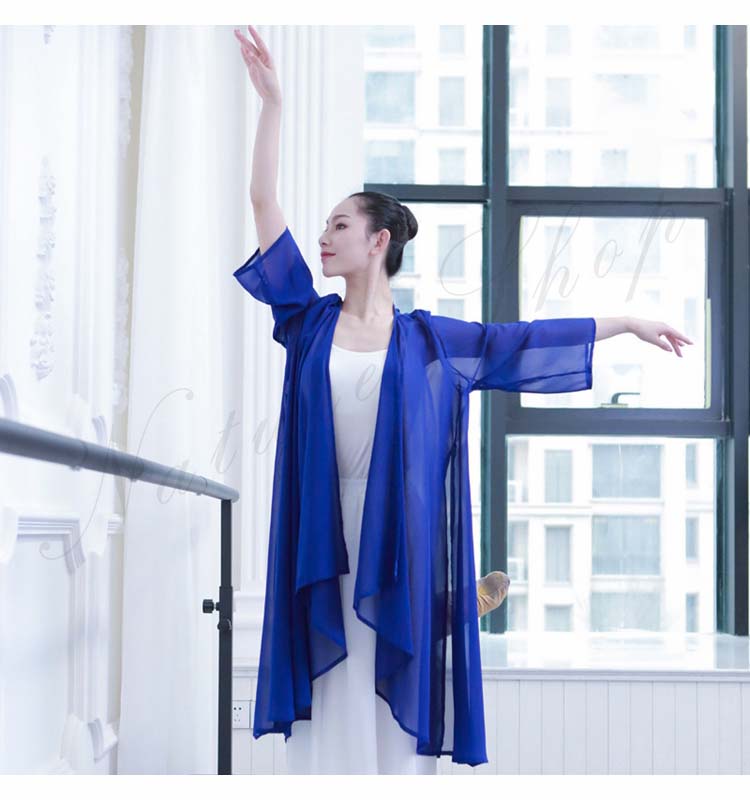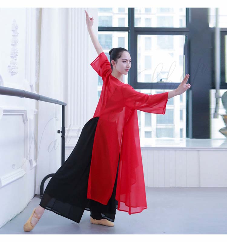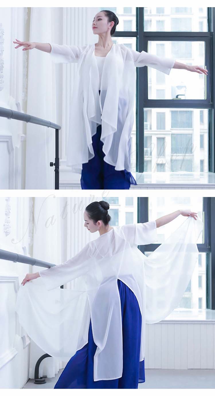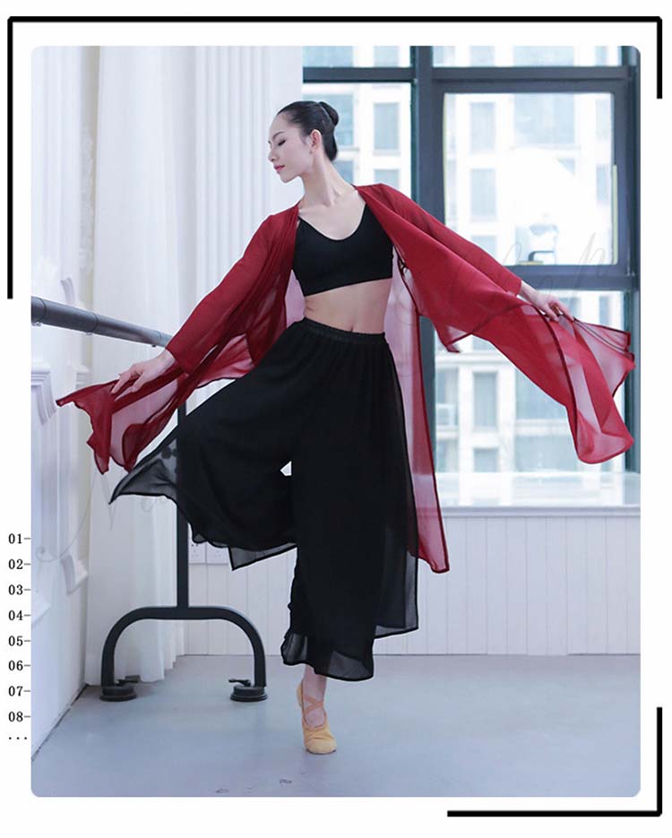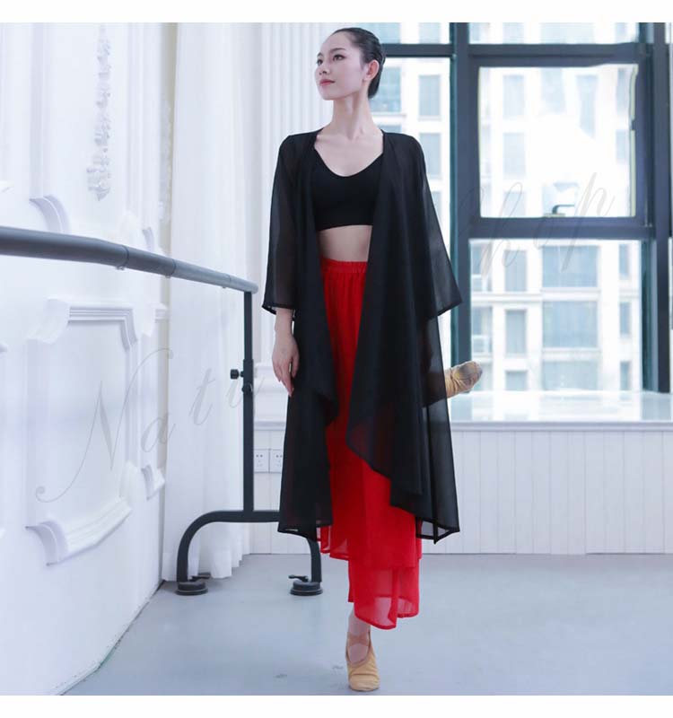 レッスン着 チャイナ服 レディース用古典舞踊ダンス衣装 前開き ブラウズ ロング羽織 オーバー羽織コート ロングシフォン羽織 中国民族ダンス衣装 紗 サイドスリット 大きめ
