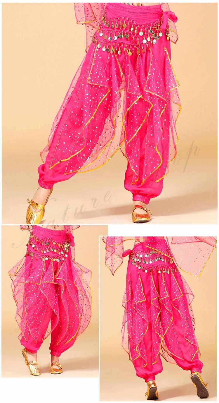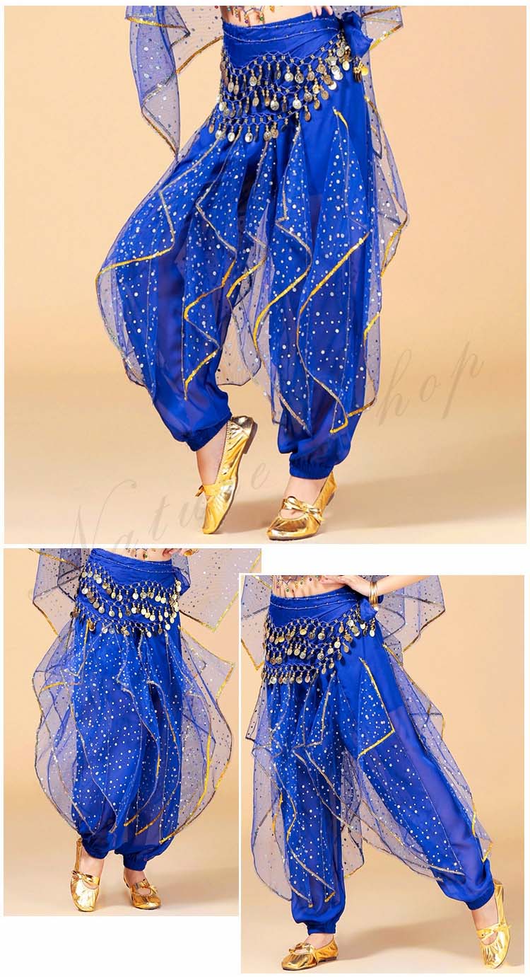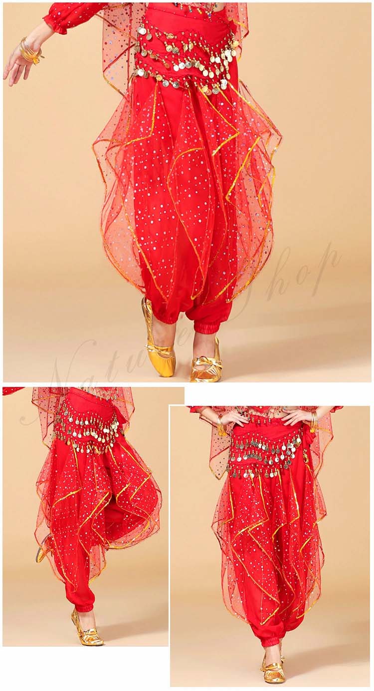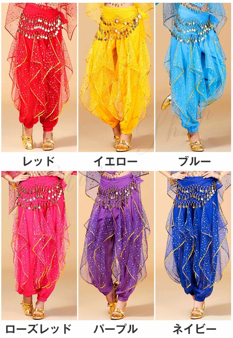 可愛い社交ダンスパンツ ボトムス ズボン+ヒップスカーフ リボン スパンコール レディース大人用 ベリーダンス ジプシー練習レッスン着 7色 ひらひら アラビアンダンスパンツ