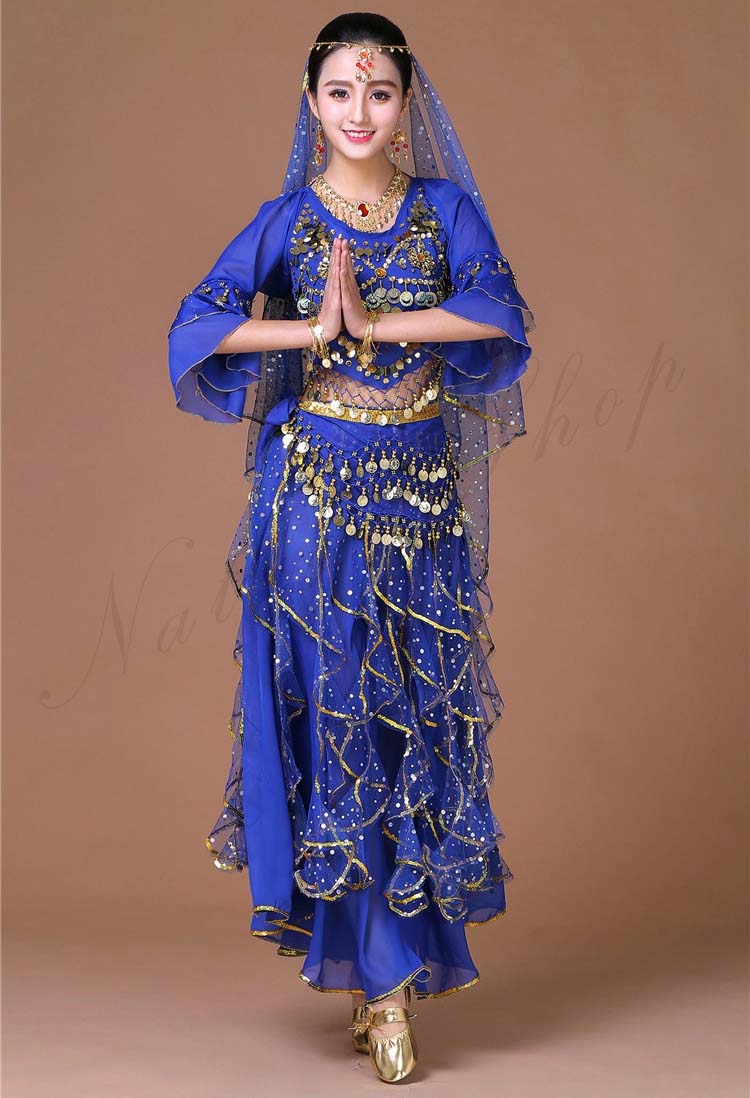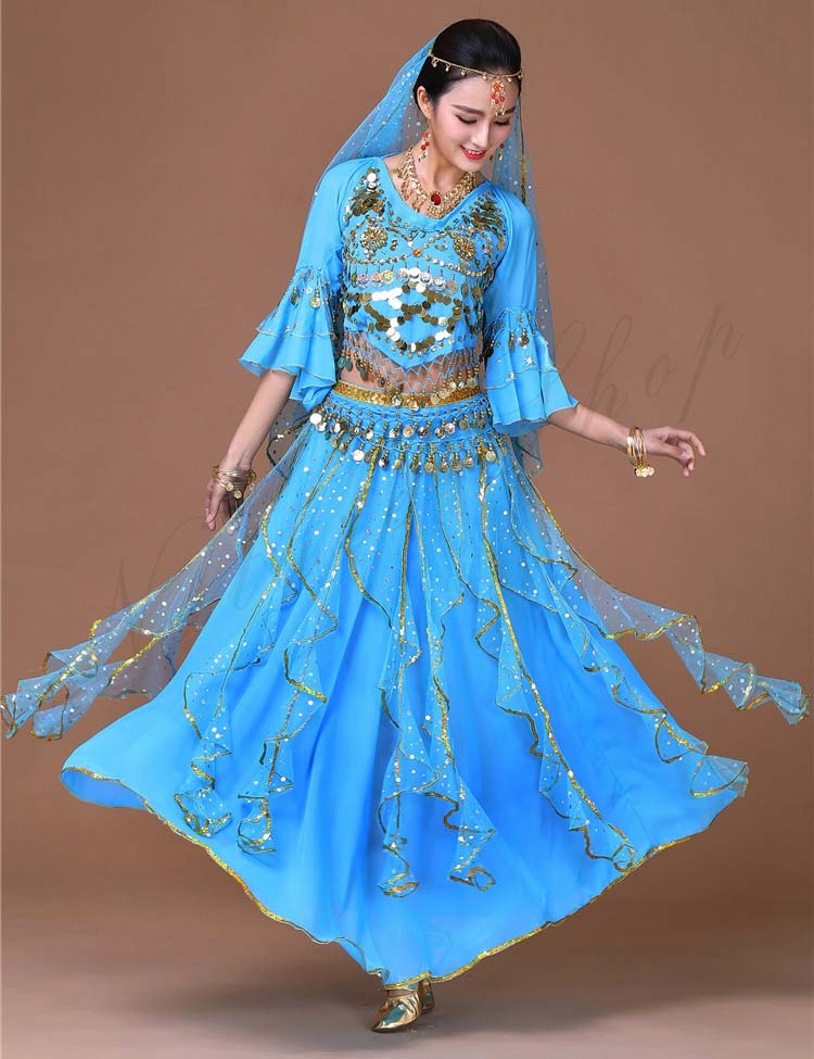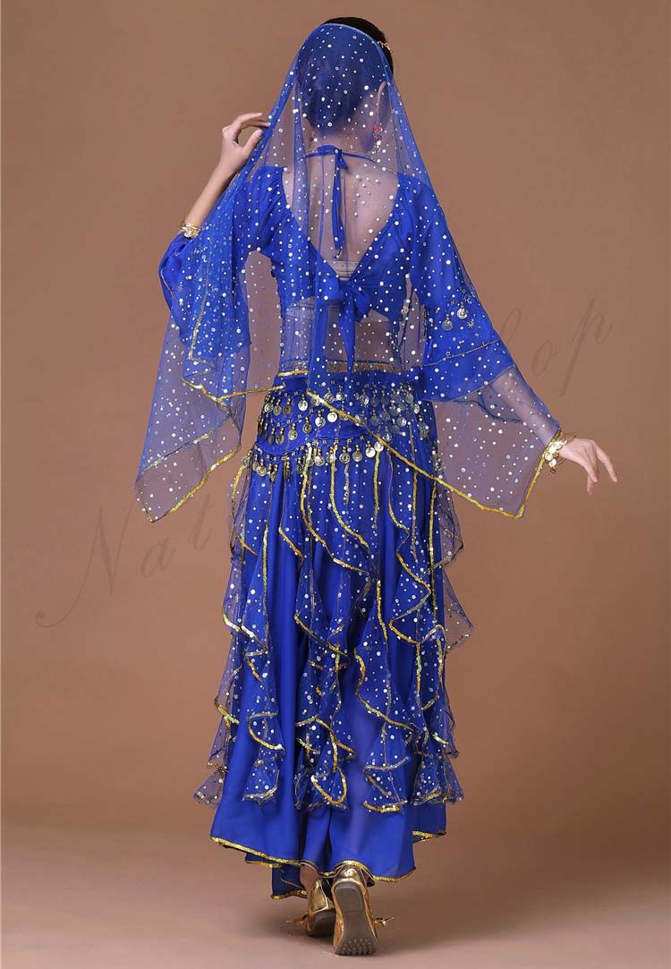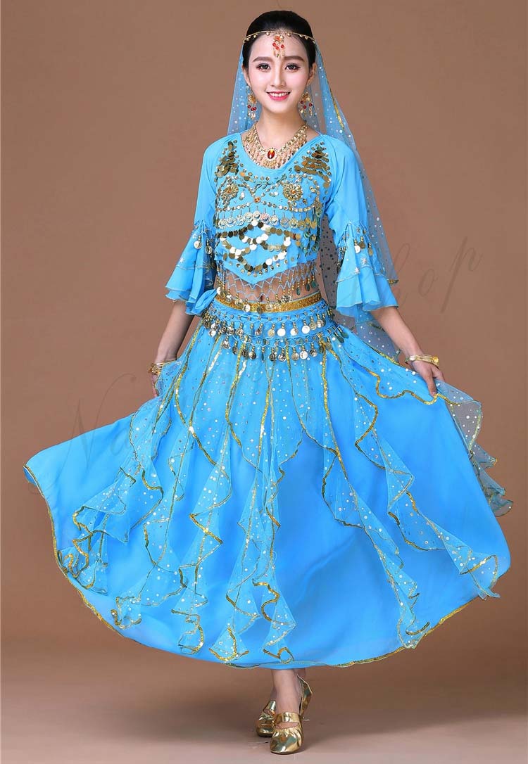スカーフも対応可 6色 レディース舞台ダンスウエア ブラウス+スカート 上下セット コスプレ 大人ベリーダンス衣装 リボン可愛い舞台ステージ服 ベール スパンコールきらきら社交