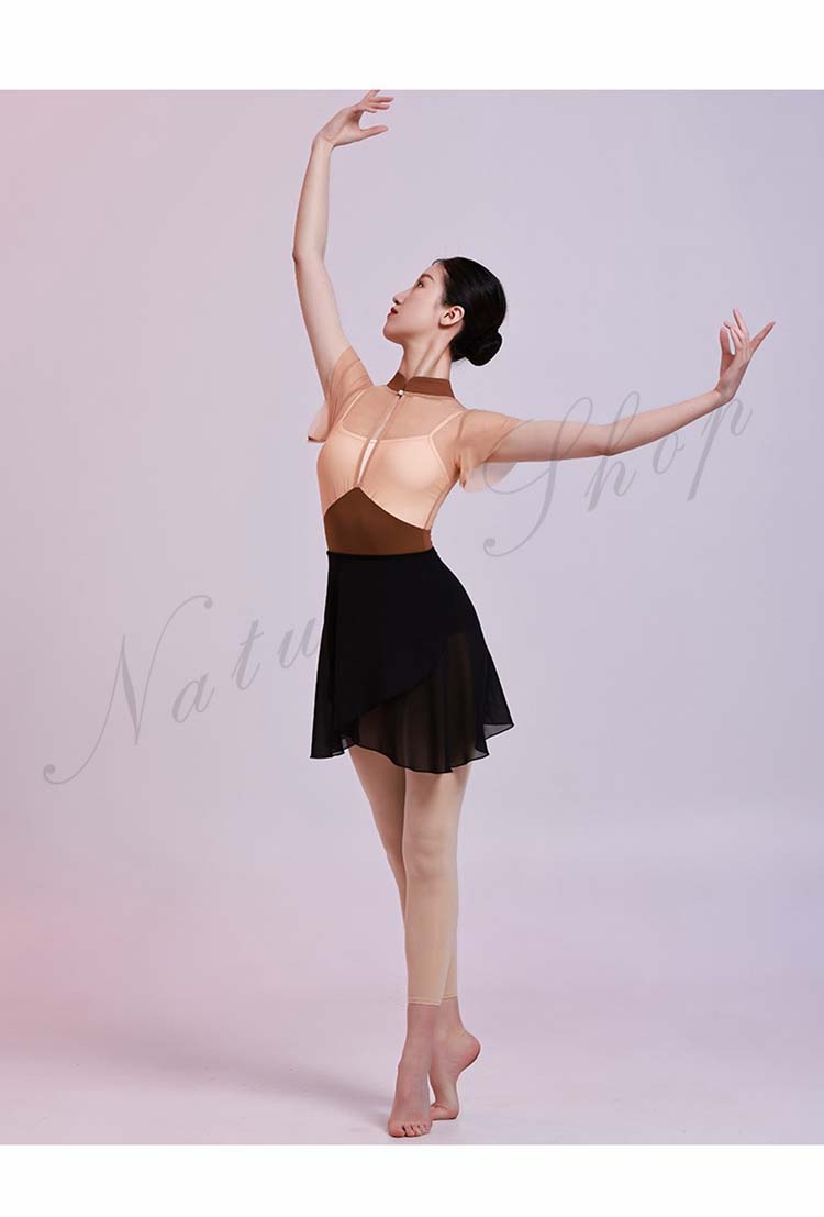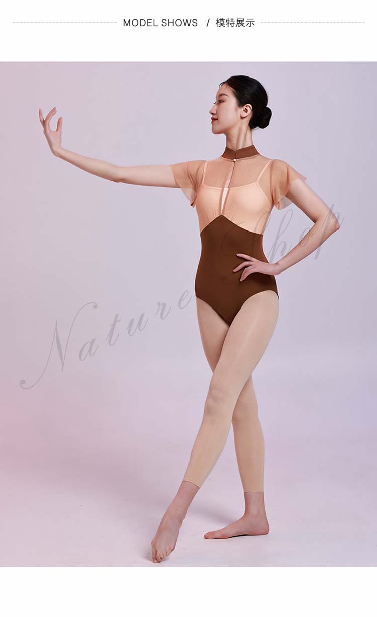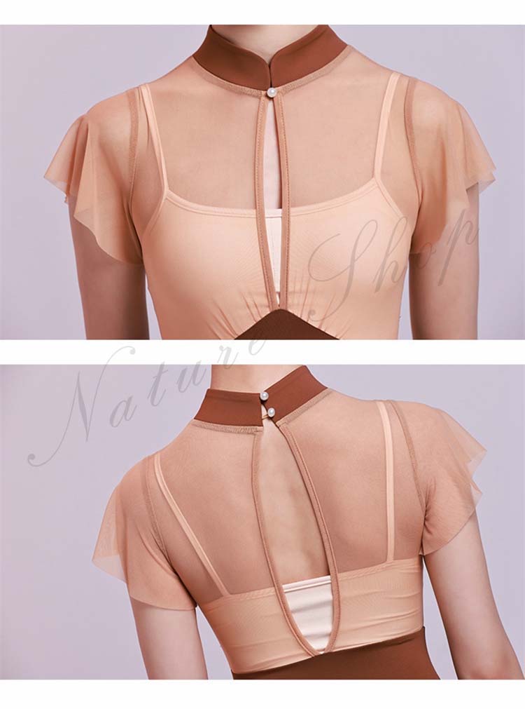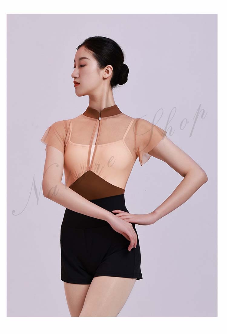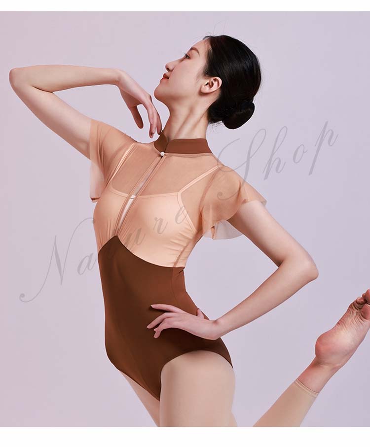 レッスン着 チャイナカラー ヨガ 大人用 ブラウンS 半袖 M レオタード フリル袖 インナー付き 大人 新作 体操 レッスンウェア 重ね着風 バレエ チェール切替 ダンス練習着