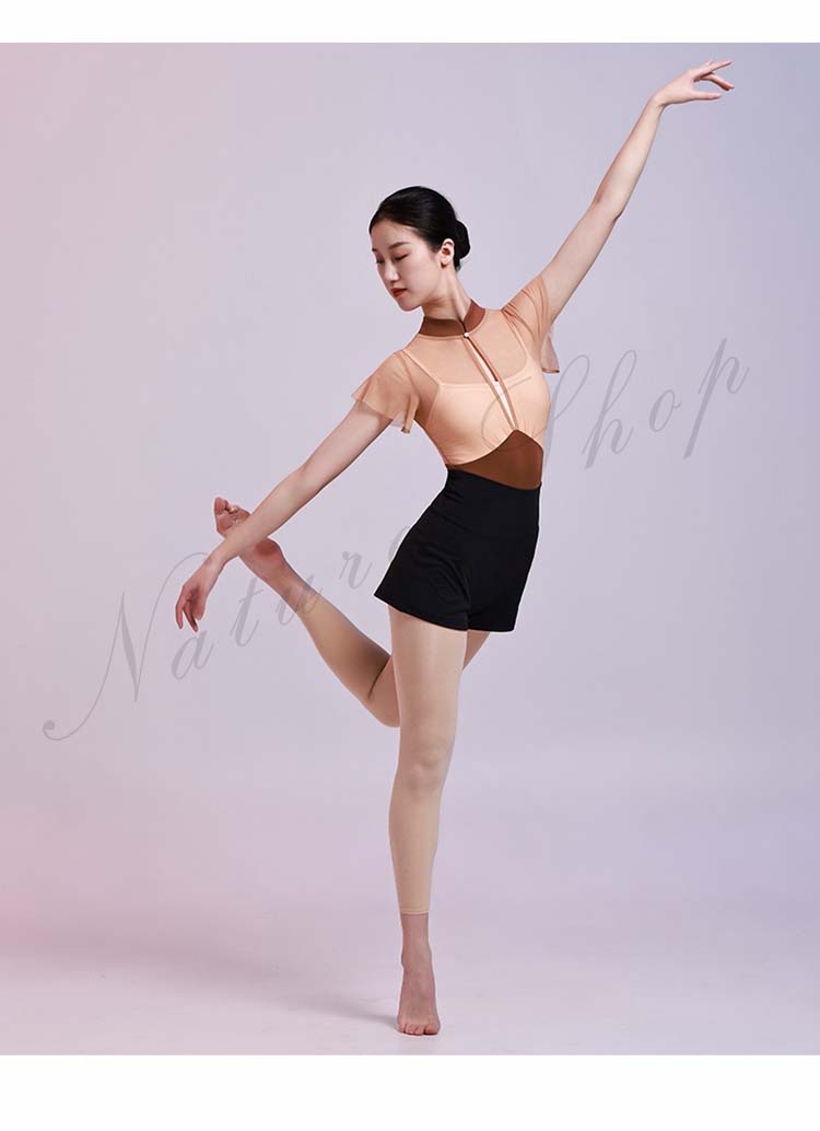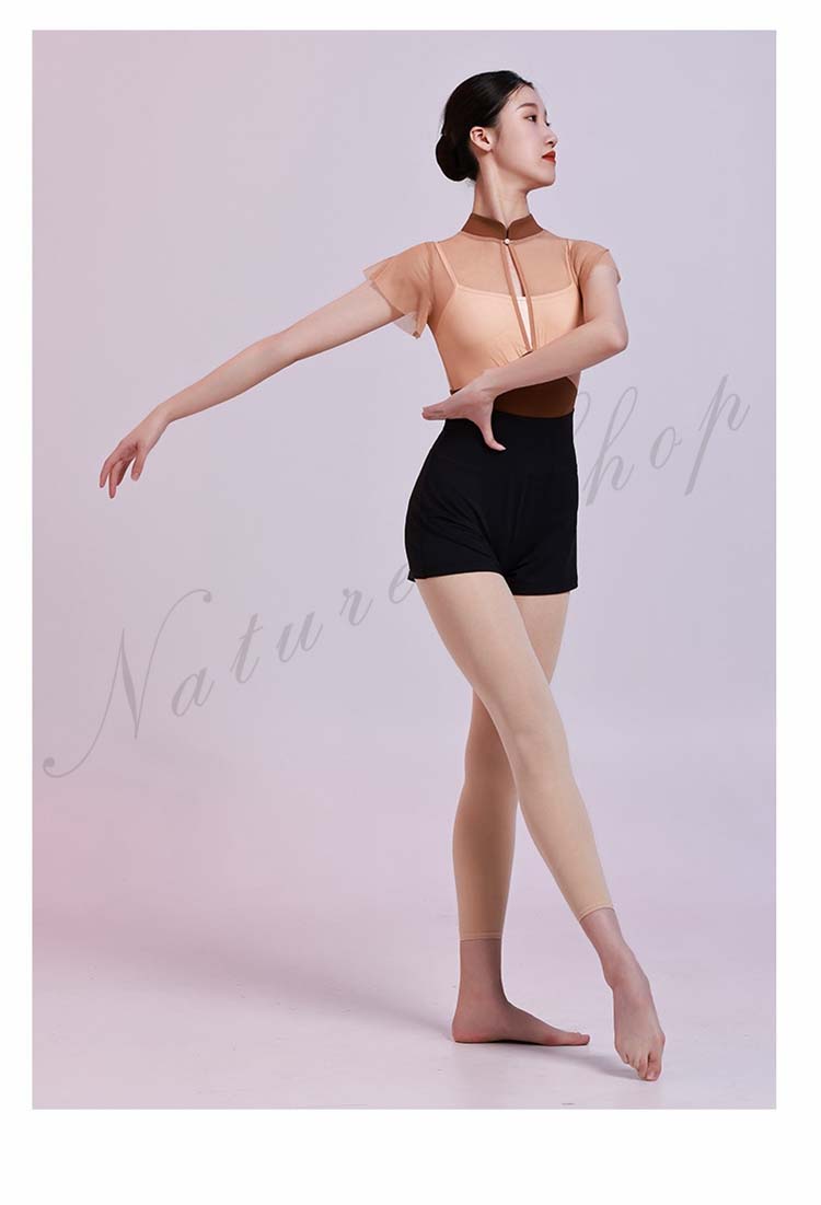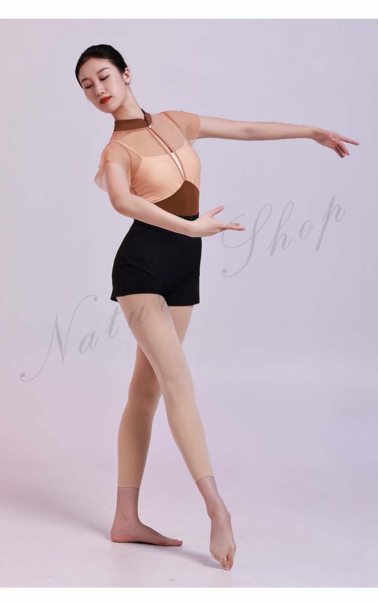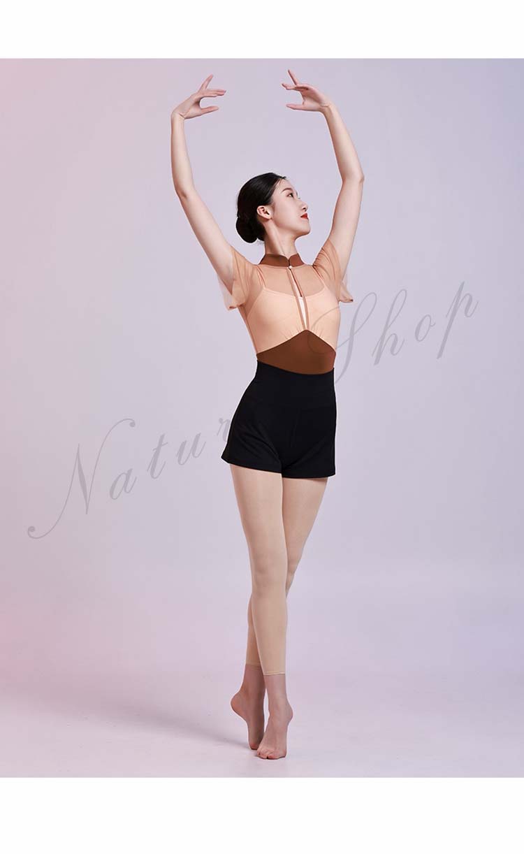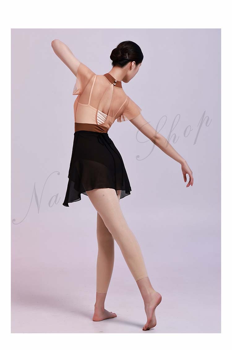 レッスン着 チャイナカラー ヨガ 大人用 ブラウンS 半袖 M レオタード フリル袖 インナー付き 大人 新作 体操 レッスンウェア 重ね着風 バレエ チェール切替 ダンス練習着