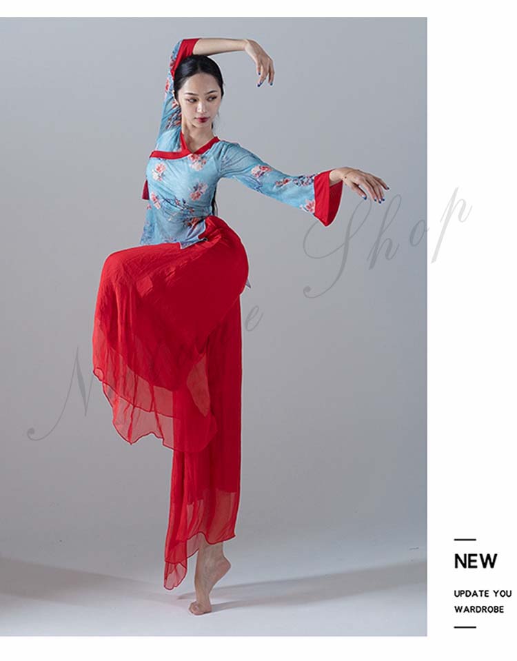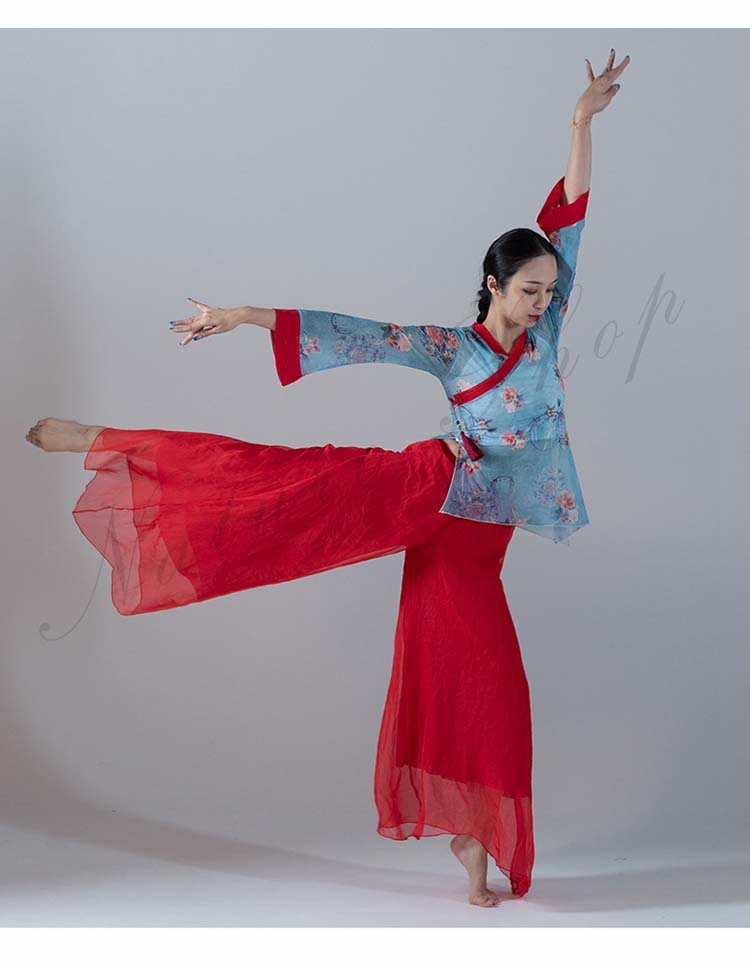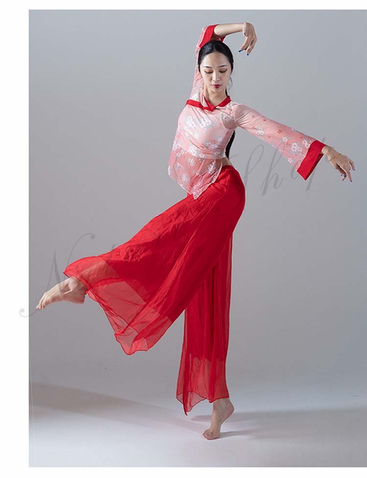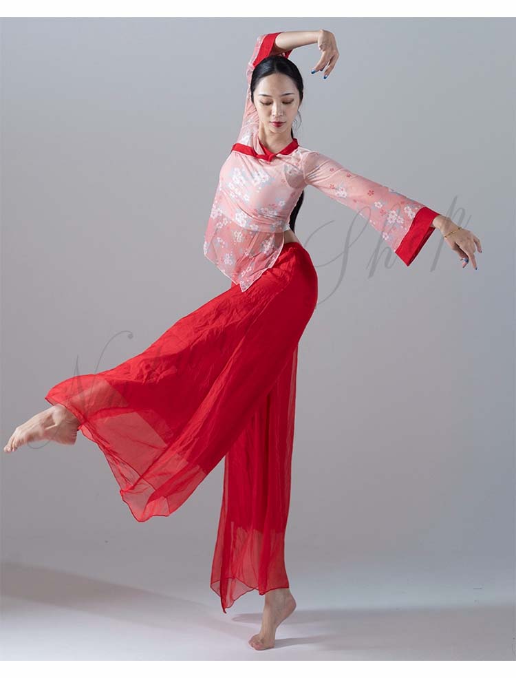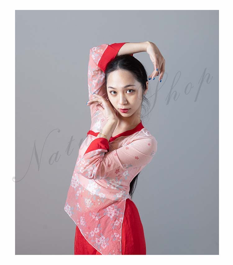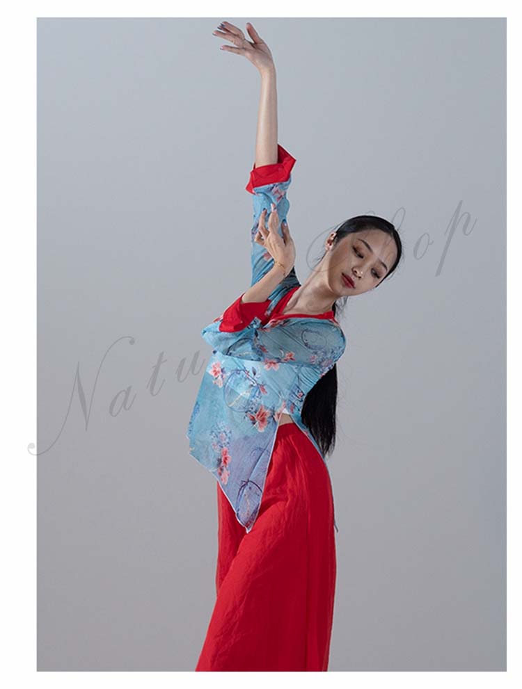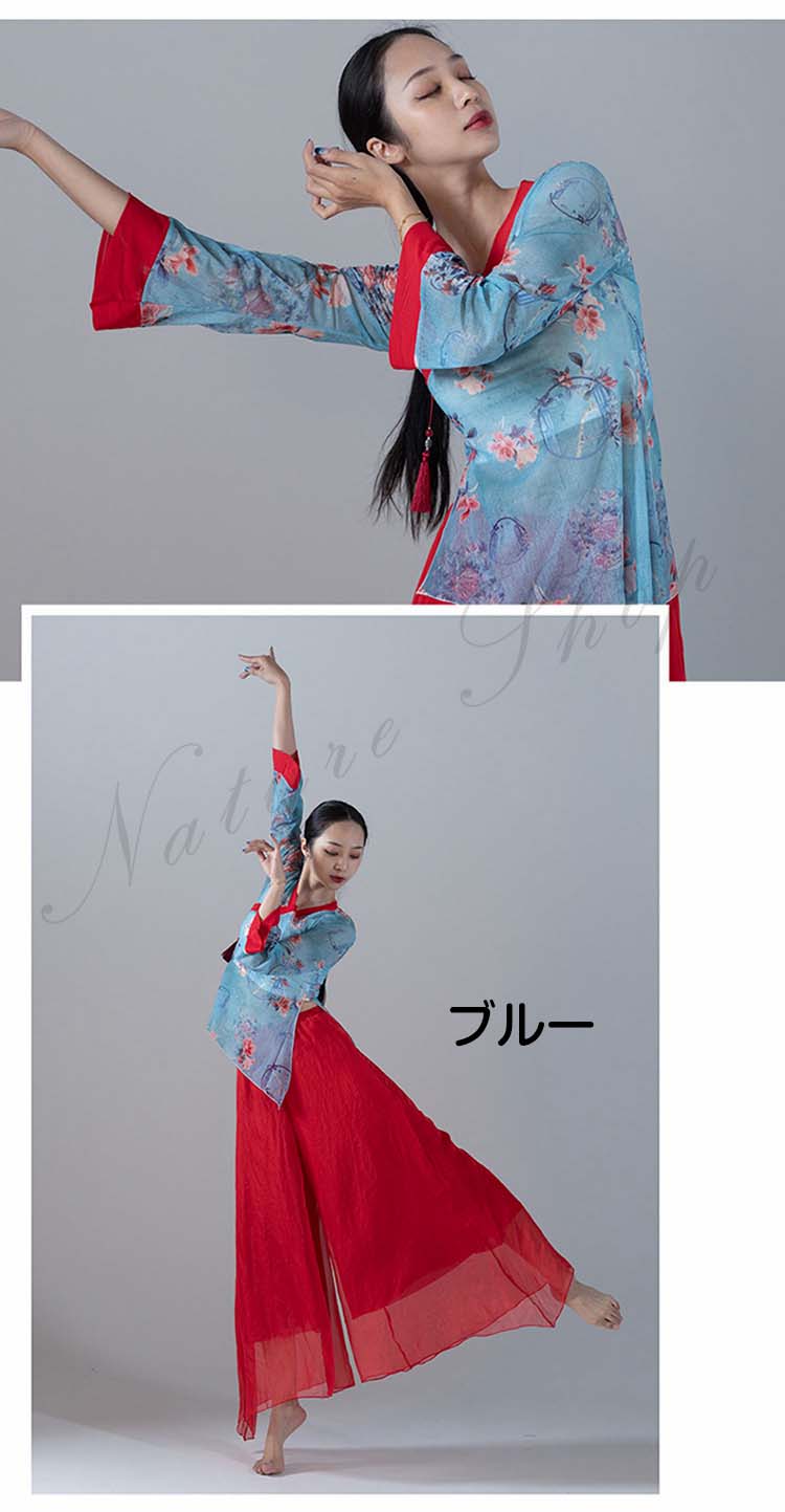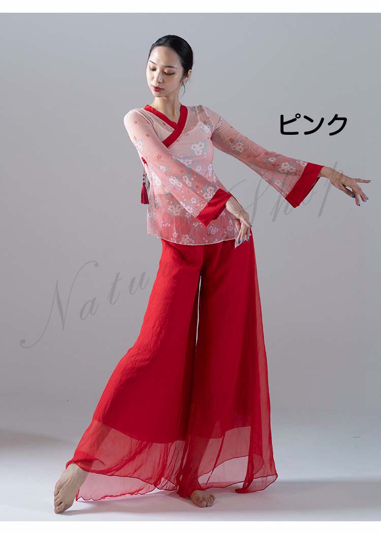 長袖 スリット ガウチョパンツ 練習着 M レッスンウェア ブラウス ピンク バレエ 不規則裾 衣装 民舞 ダンス ワイドパンツ 飄逸 中国風民族ダンス シフォン L シック 花柄 傘 S