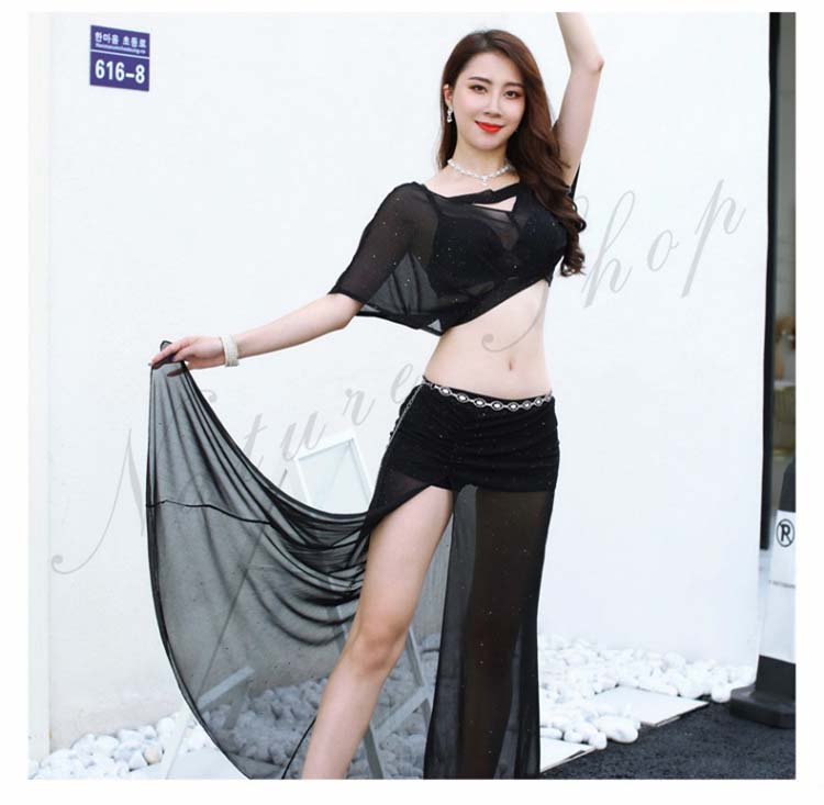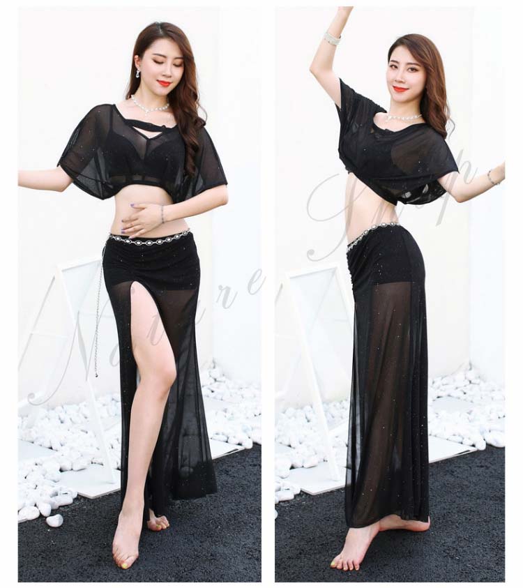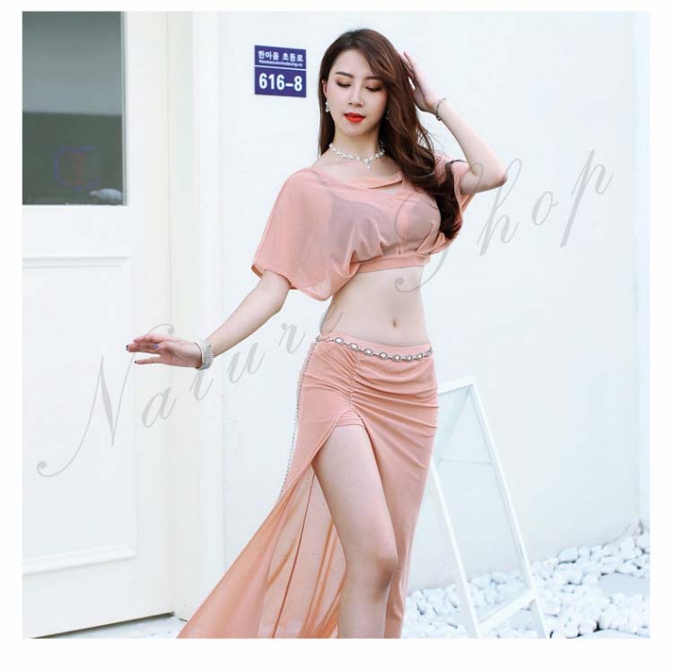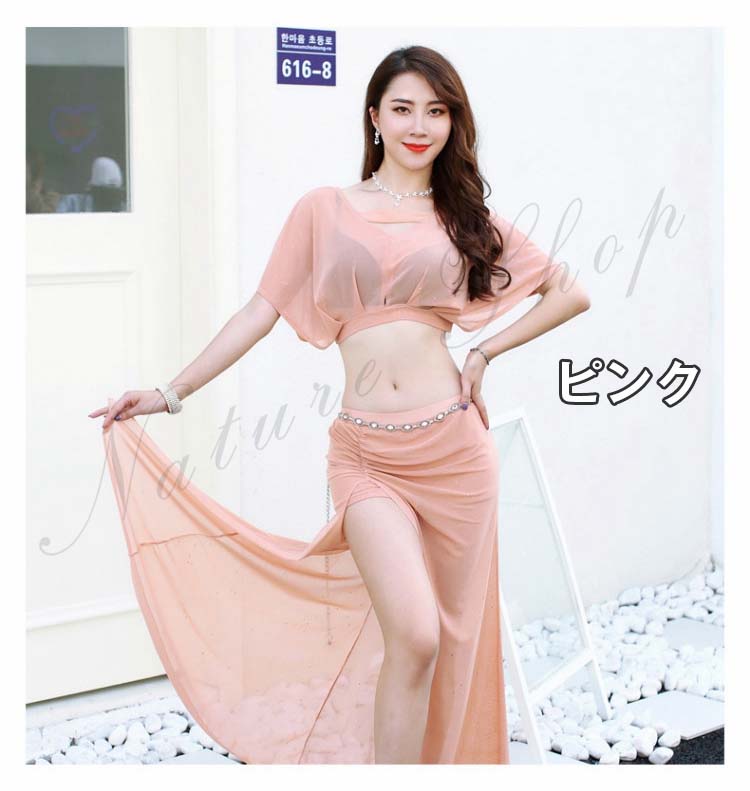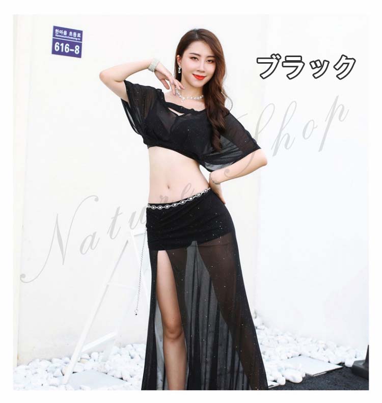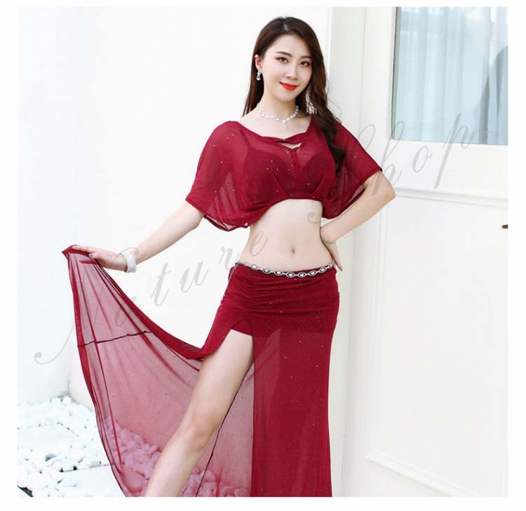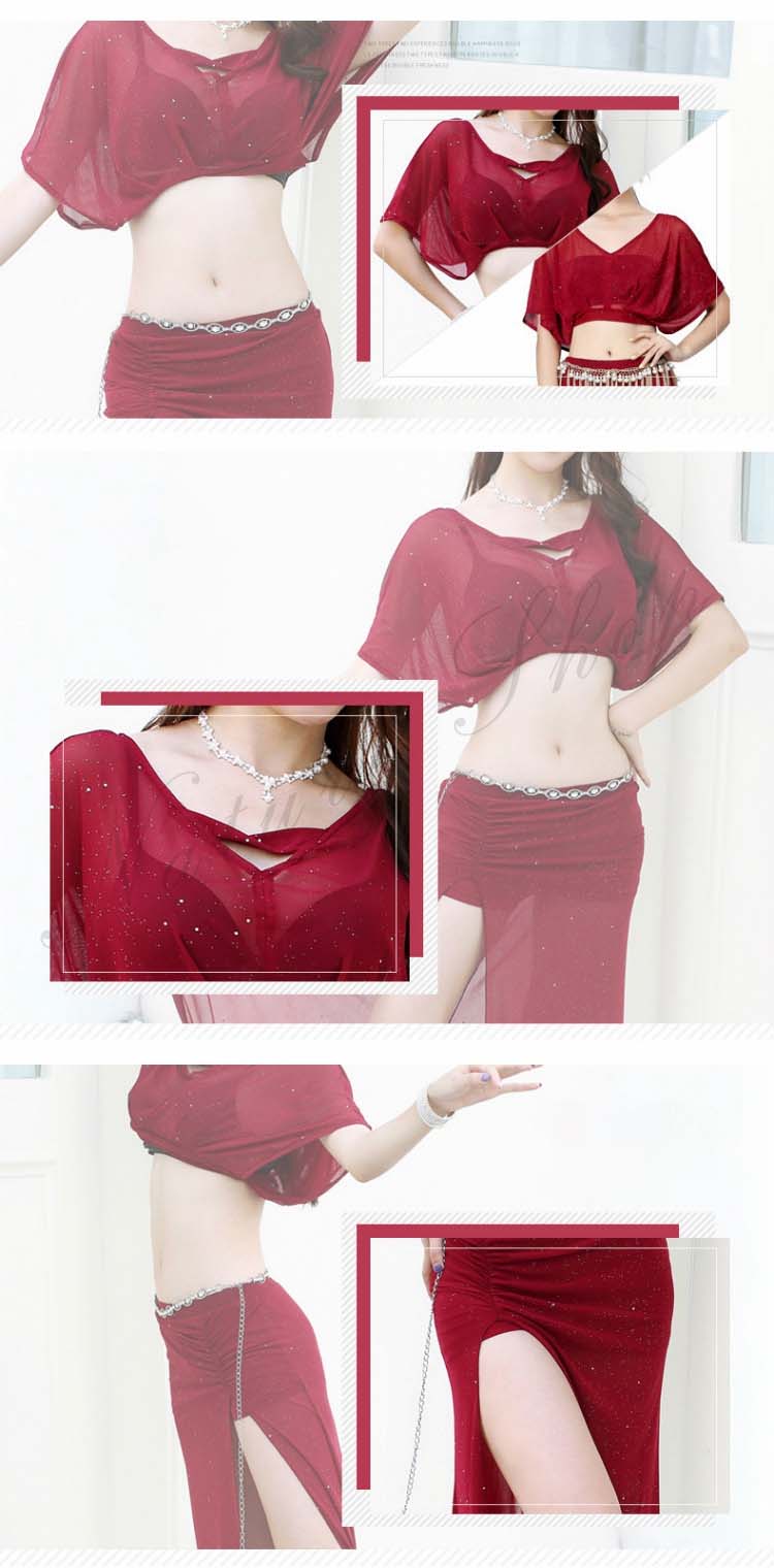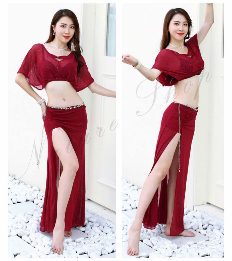 ショート丈トップス ロング丈スカート レッスン着 ワインレッド ピンク 半袖ドルマン 衣装セット へそ出し ベリー ピラティス 黒 レディース 見せパンツ付き セクシー 練習着 スリット