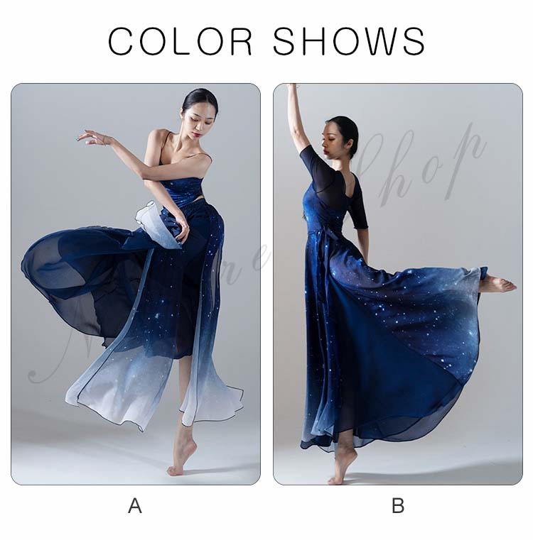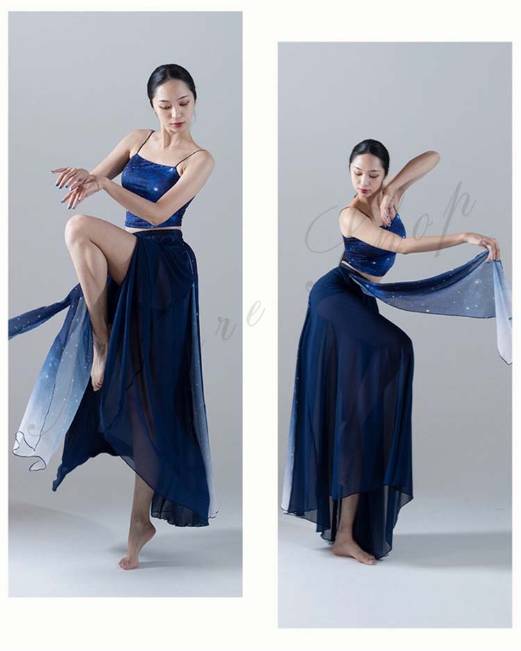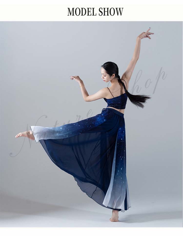 古典舞踊ダンス衣装 スリット レッスン着 L XL シフォン広がるスカート 夜空 大きい裾 モダンダンススカート 踊りやすい M 紺色系 新作 古典ダンス 練習着 リボン 星空 キャミソール