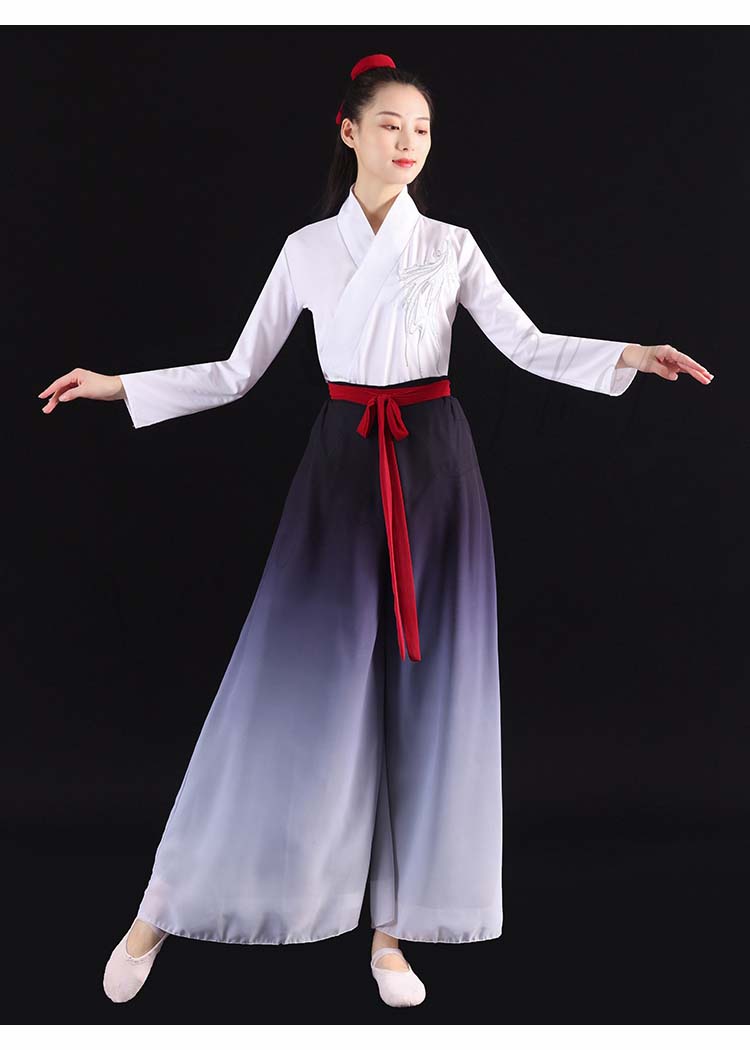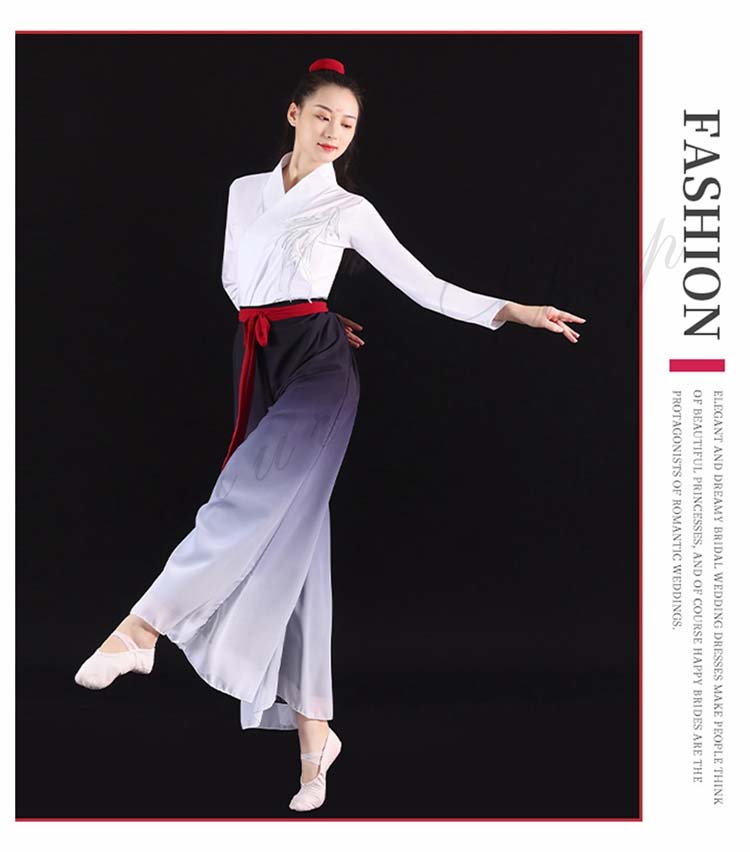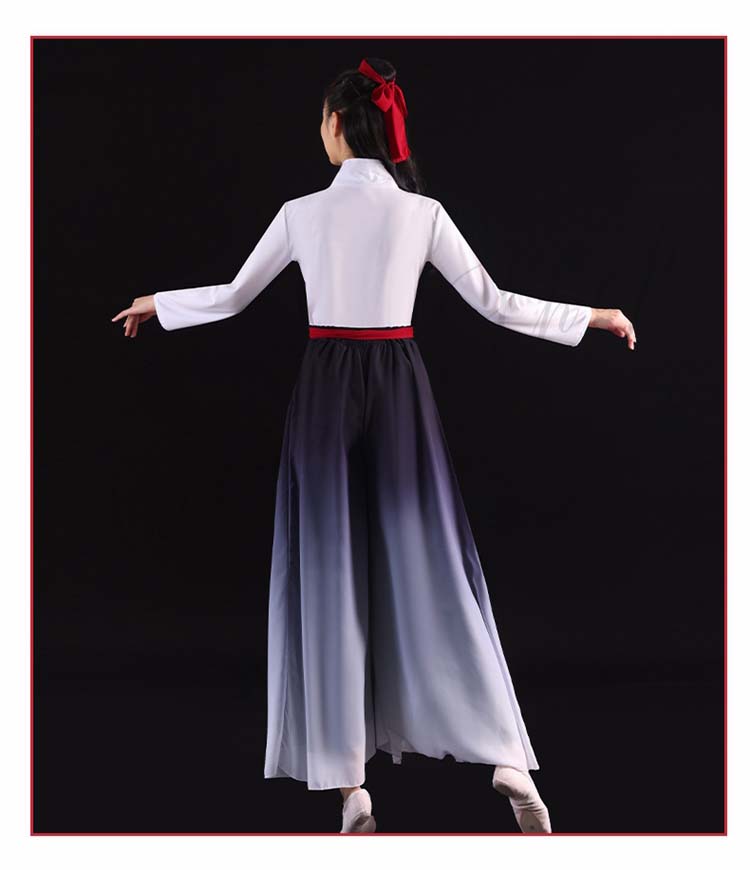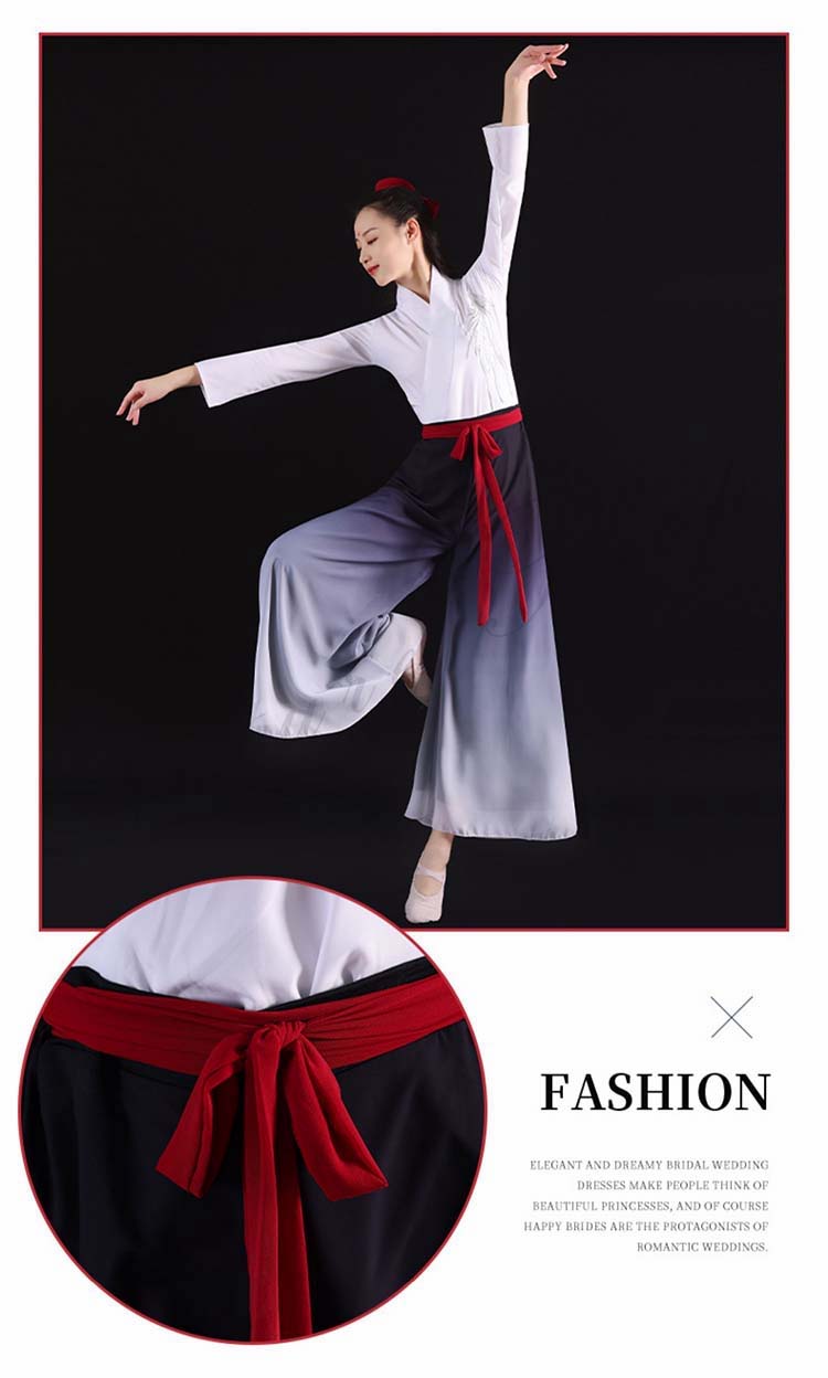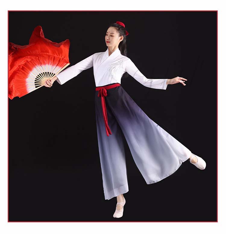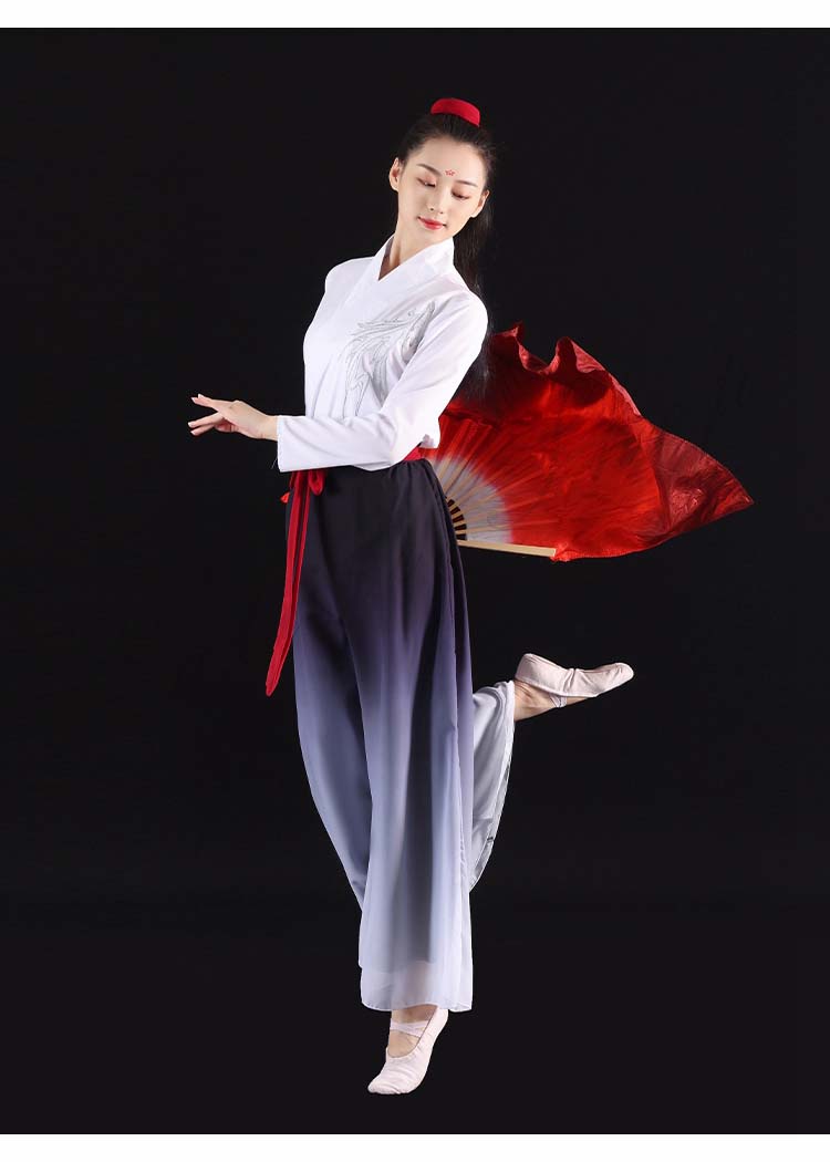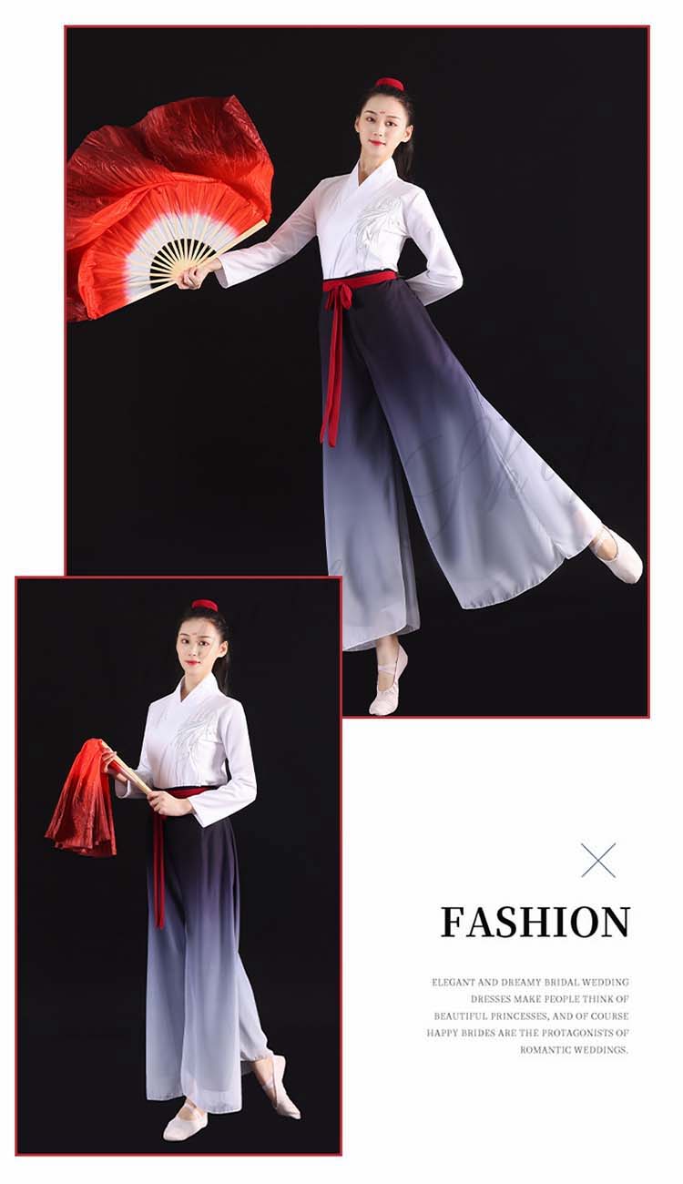 中国風モダンダンス衣装 交差ブラウス チャイナダンス 箏 演奏服 漢服 ハロウィン 中華ダンス 長袖 レディース 武術 二胡 衣装 古典 リボン付き 扇子 グラデーションワイドパンツ