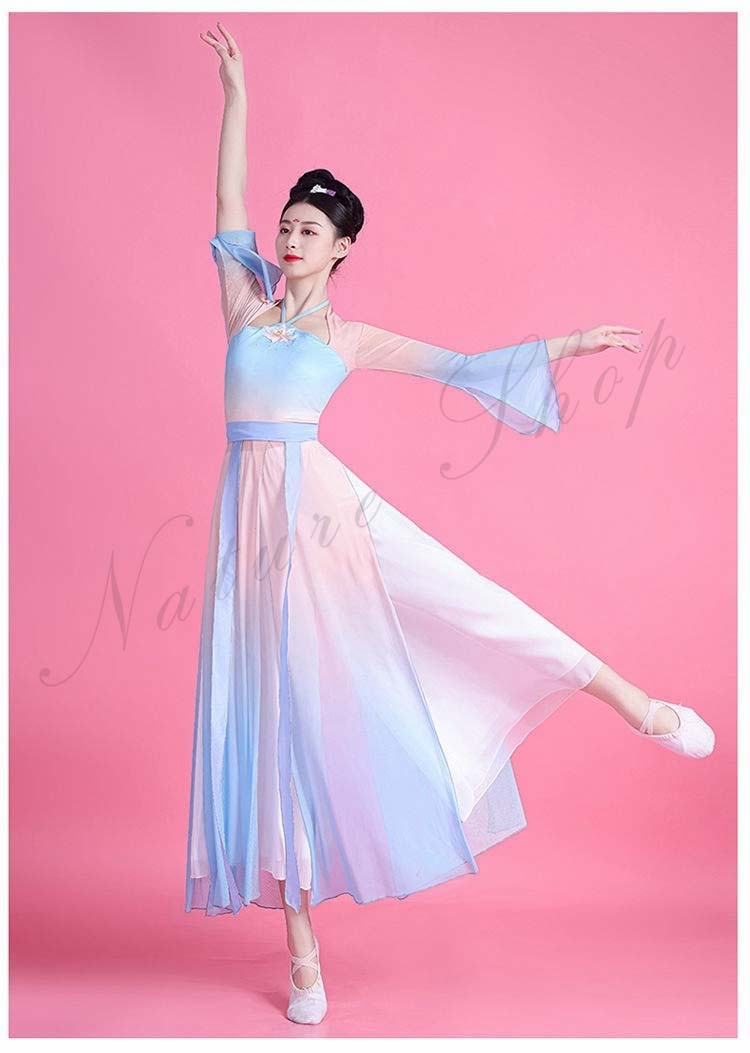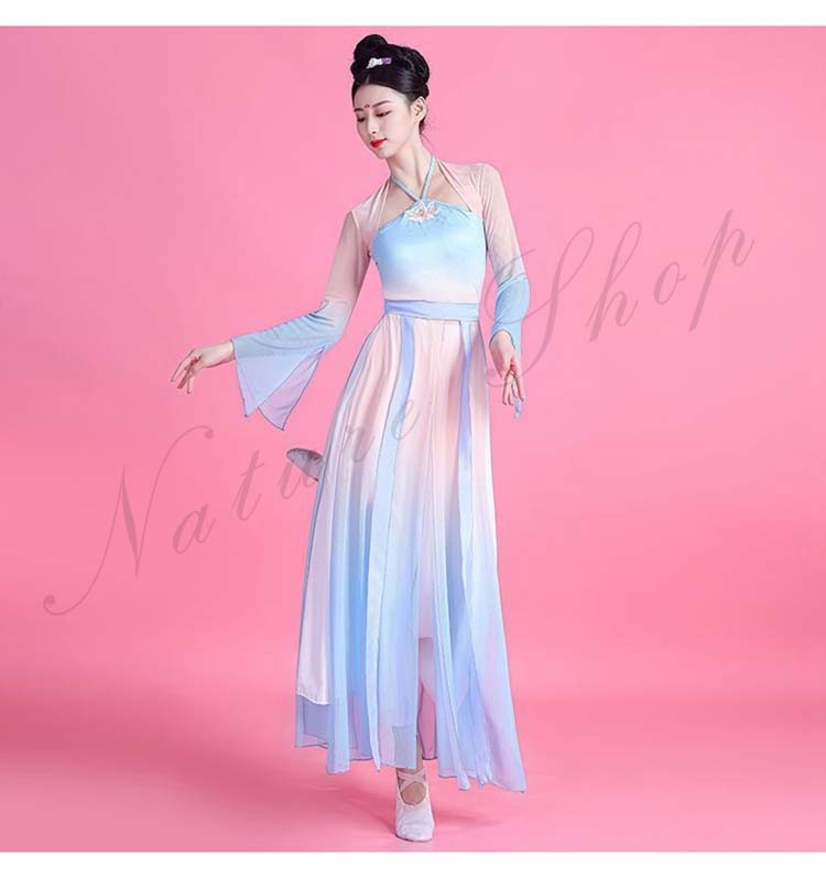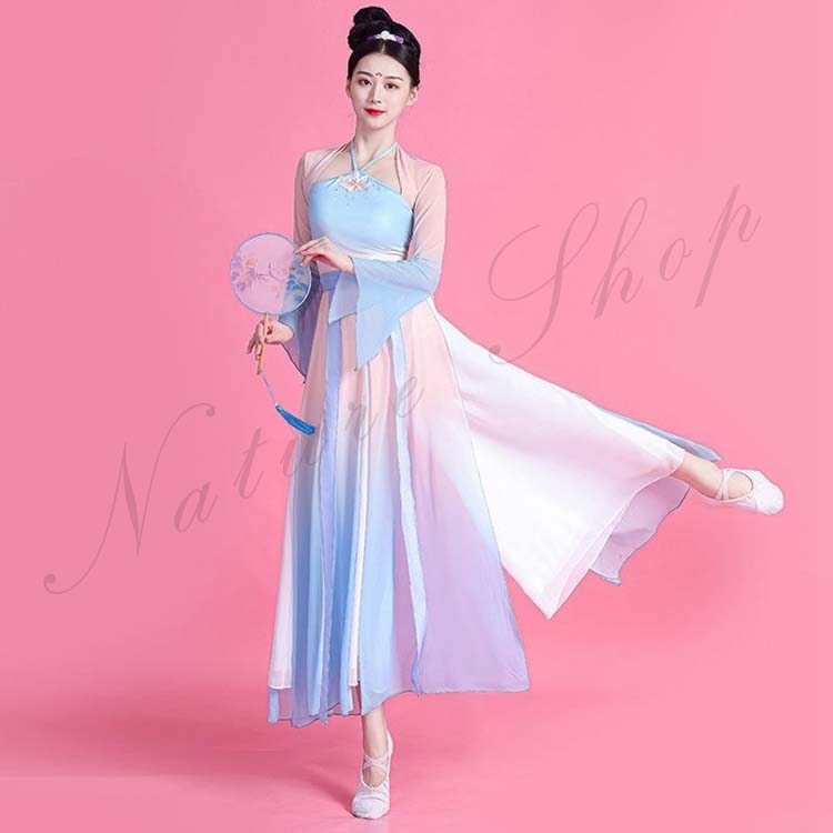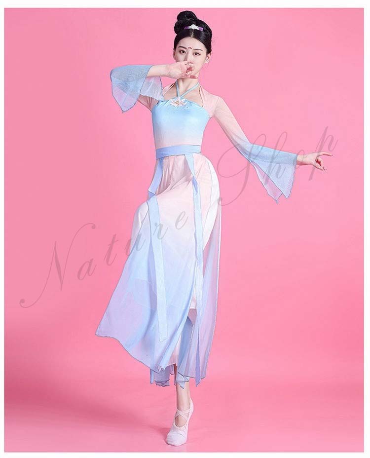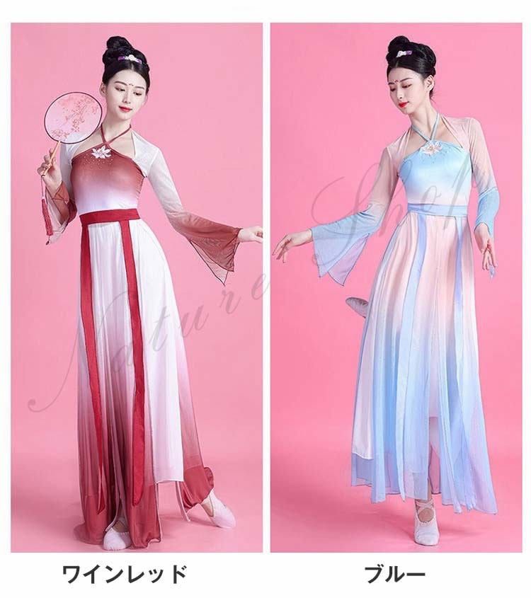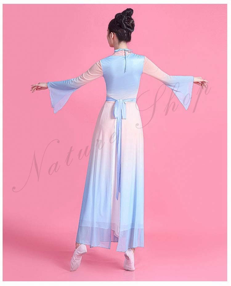 民族風 袖スリット リボン M L ワンピース XL レディース 中華ダンスウェア ダンス練習着 二胡 衣装S 飄逸 エレガント 古典踊り 可愛い 長袖 グラデーション中国古典舞踊ダンス衣装