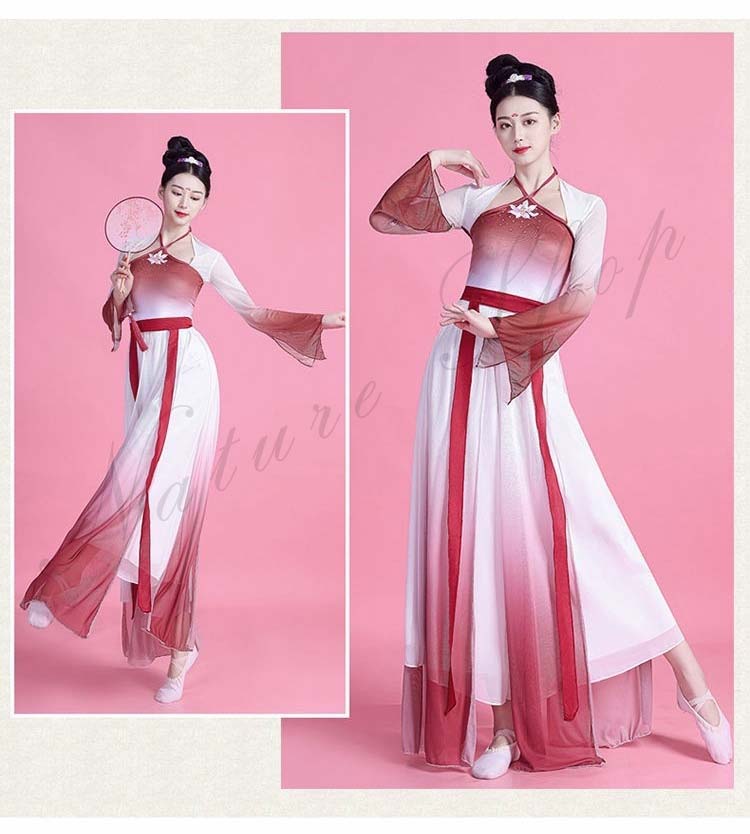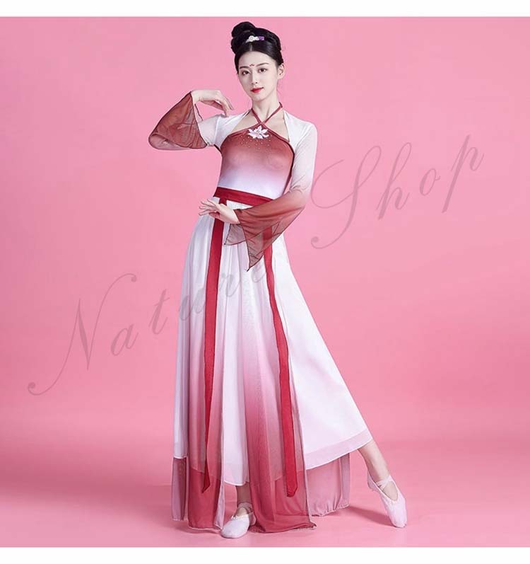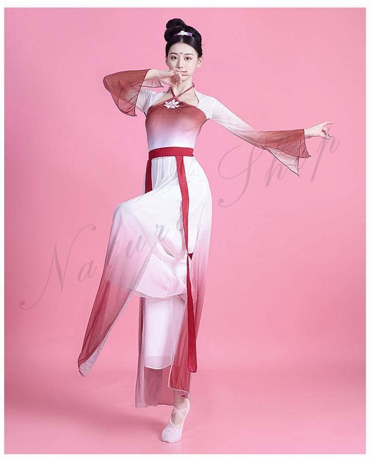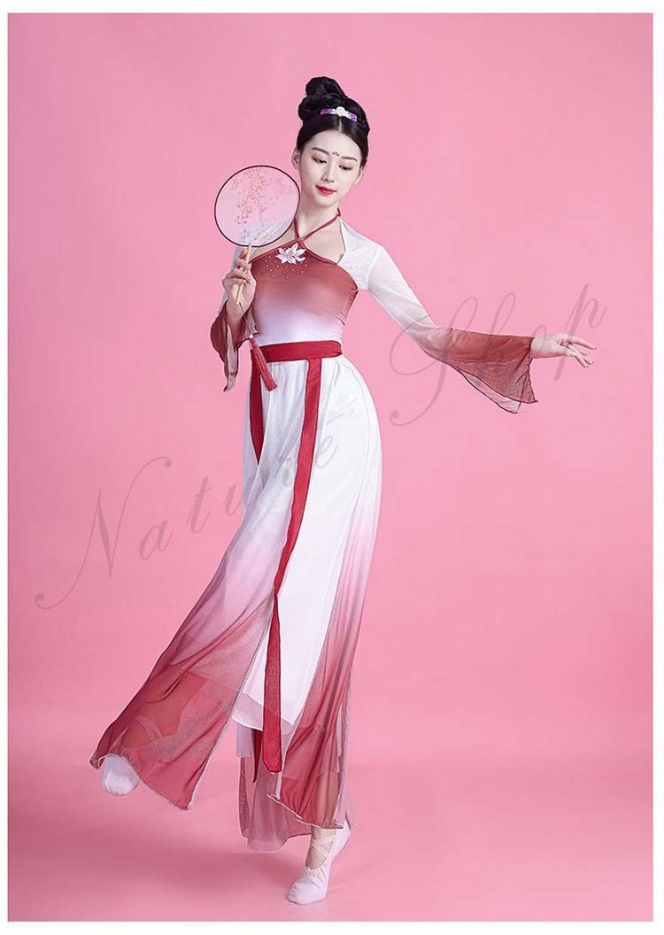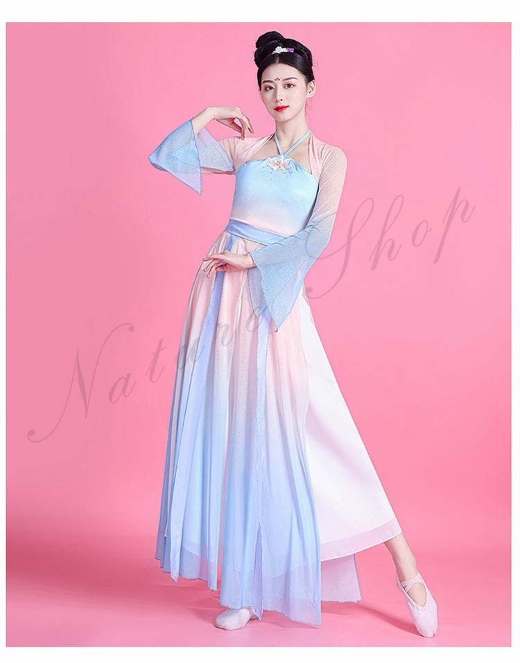 民族風 袖スリット リボン M L ワンピース XL レディース 中華ダンスウェア ダンス練習着 二胡 衣装S 飄逸 エレガント 古典踊り 可愛い 長袖 グラデーション中国古典舞踊ダンス衣装