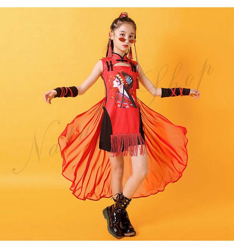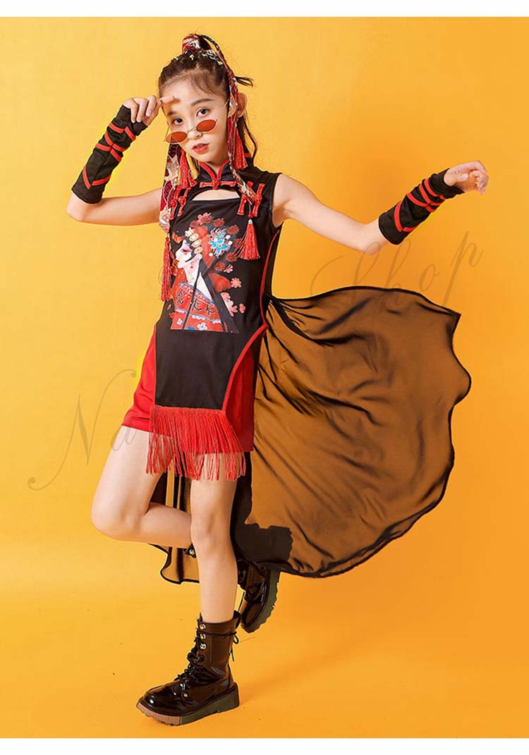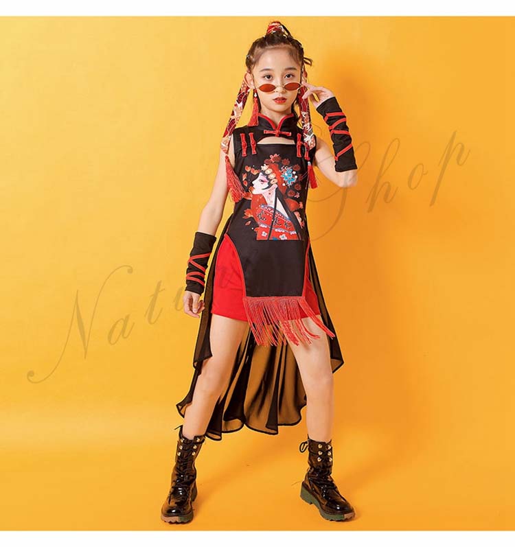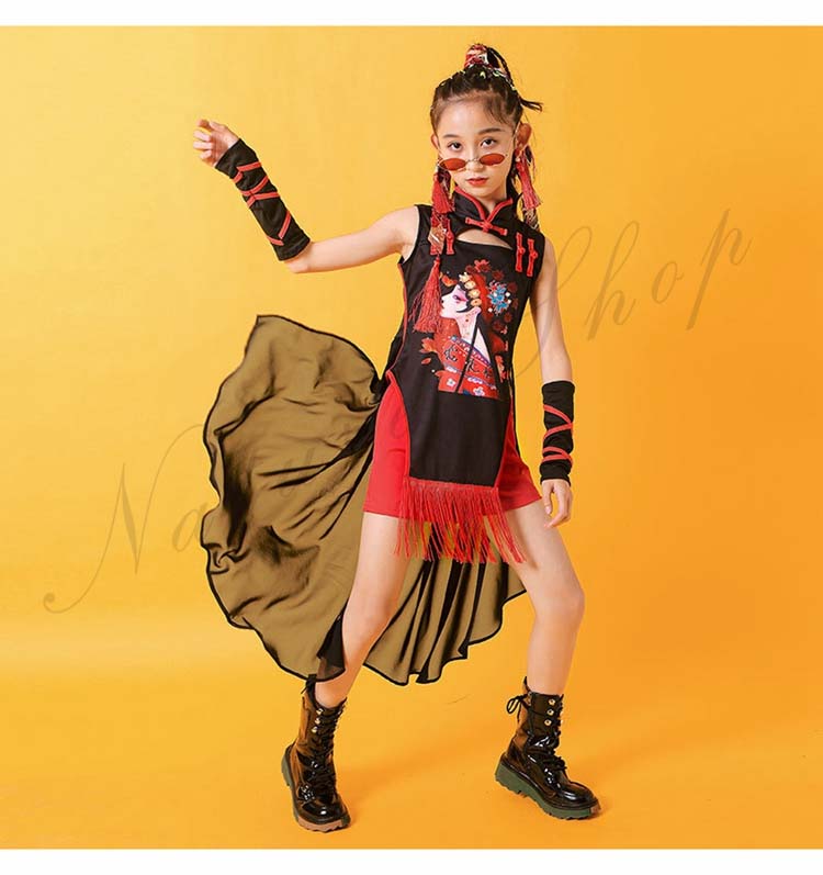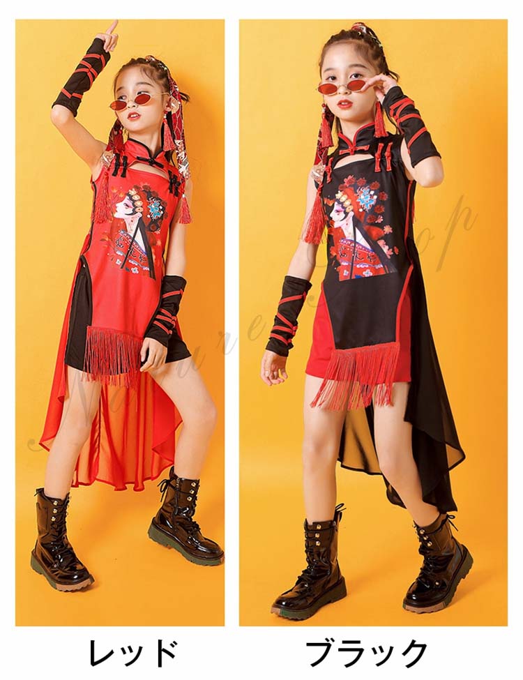 チャイナドレス2点セット ヒップホップ 華流 3点セット 中華 キッズチャイナ風ジャズ ショートパンツ 後ろフリルシフォン 黒120~170cm 舞台衣裳 ダンスウェア
