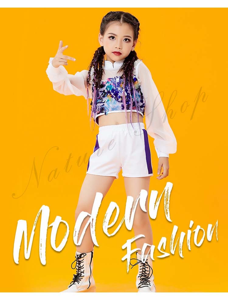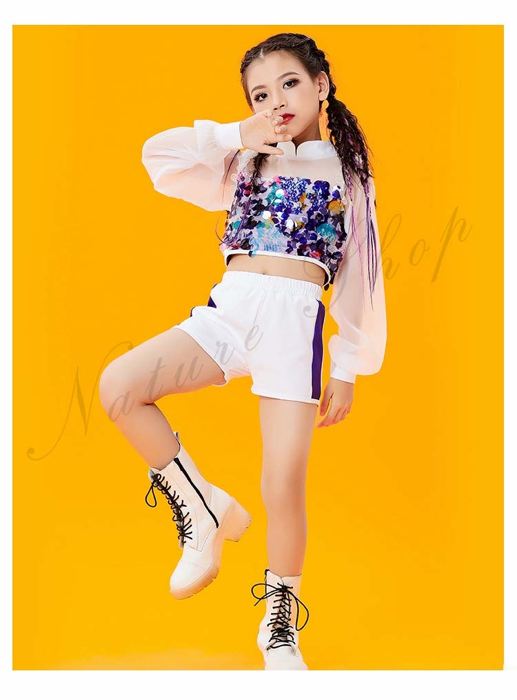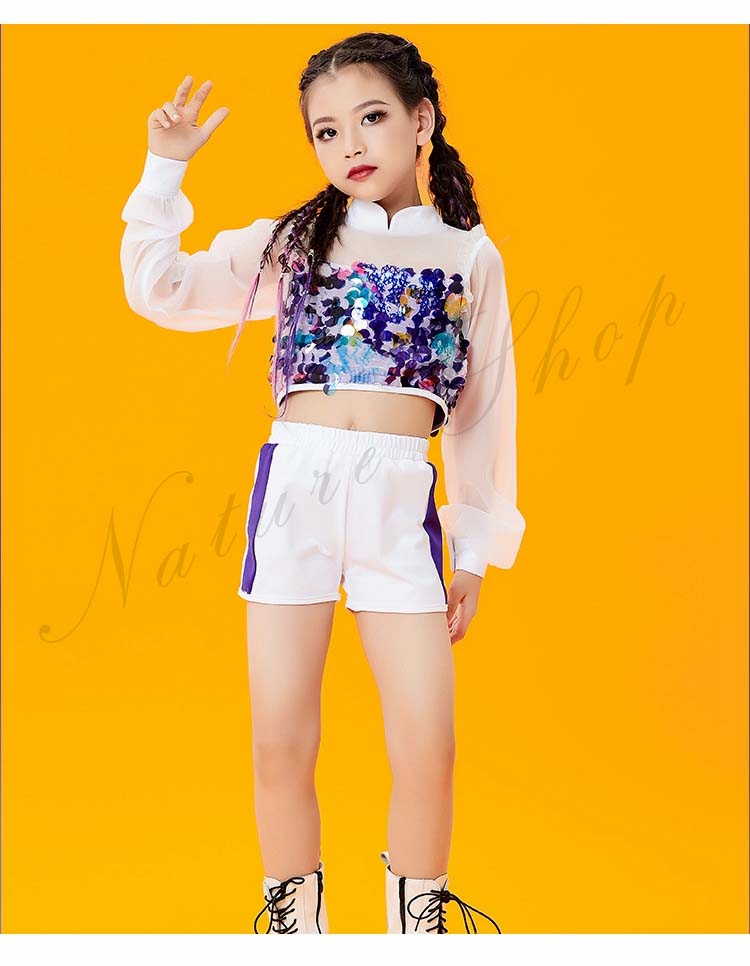 JAZZ 衣装 イベント 130 140 HIPHOP 150 子供服 ストリートダンス スパンコール&チュール きらきら セット選べる120 ダンスウェア 白紫青 衣装 発表会 チアリング 女の子