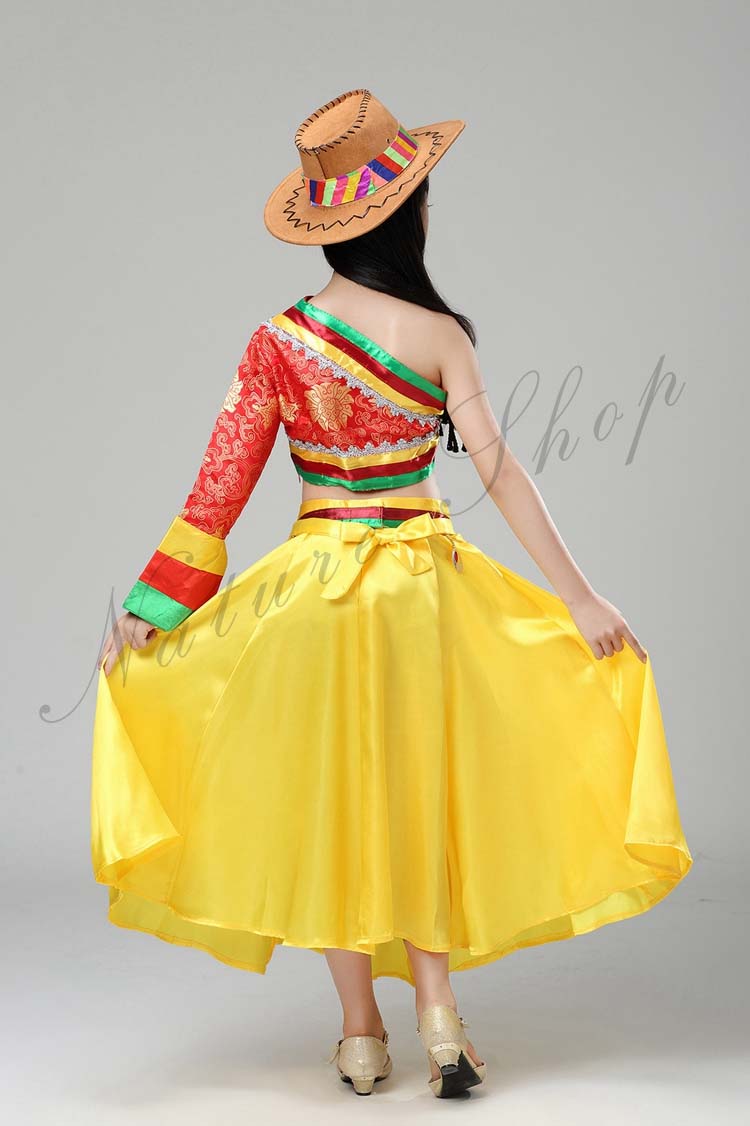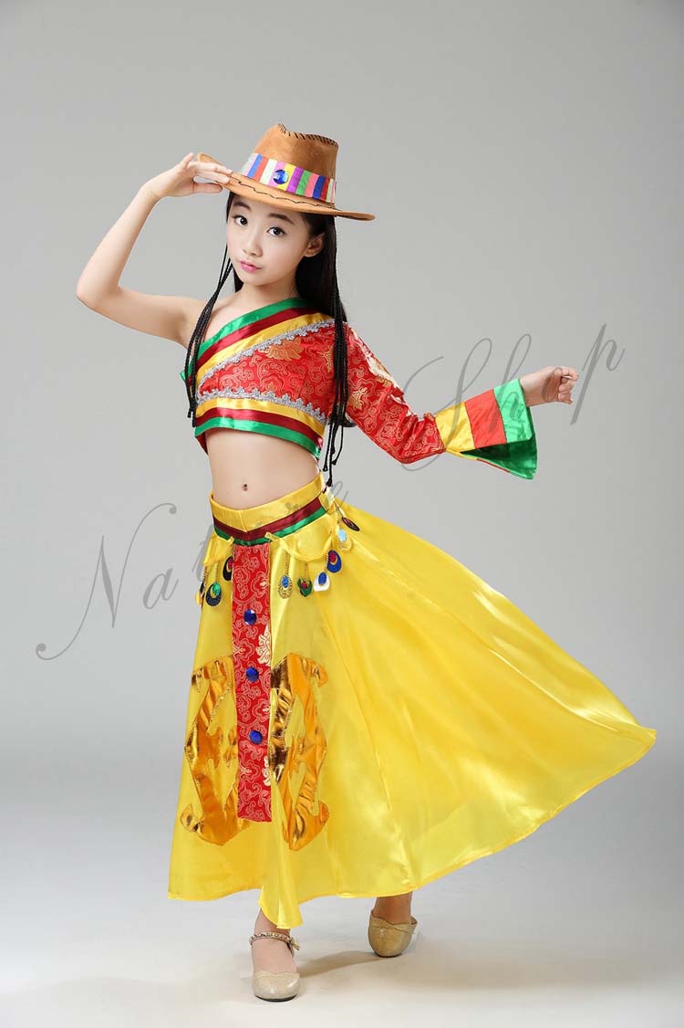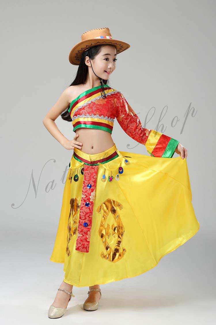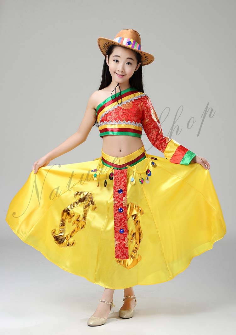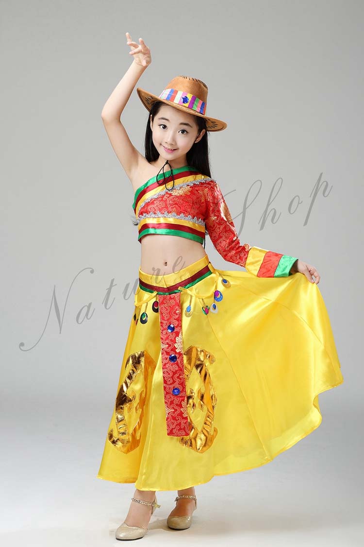 ステージ服 へそ出しブラウス+フレアスカート 中国民族舞踊ダンス衣装 三七五学園祭イベント舞台衣装 幼稚園小学校演出衣装 帽子あり三点セット 民族衣装 110-160cm子供ダンス衣装