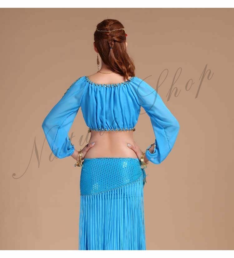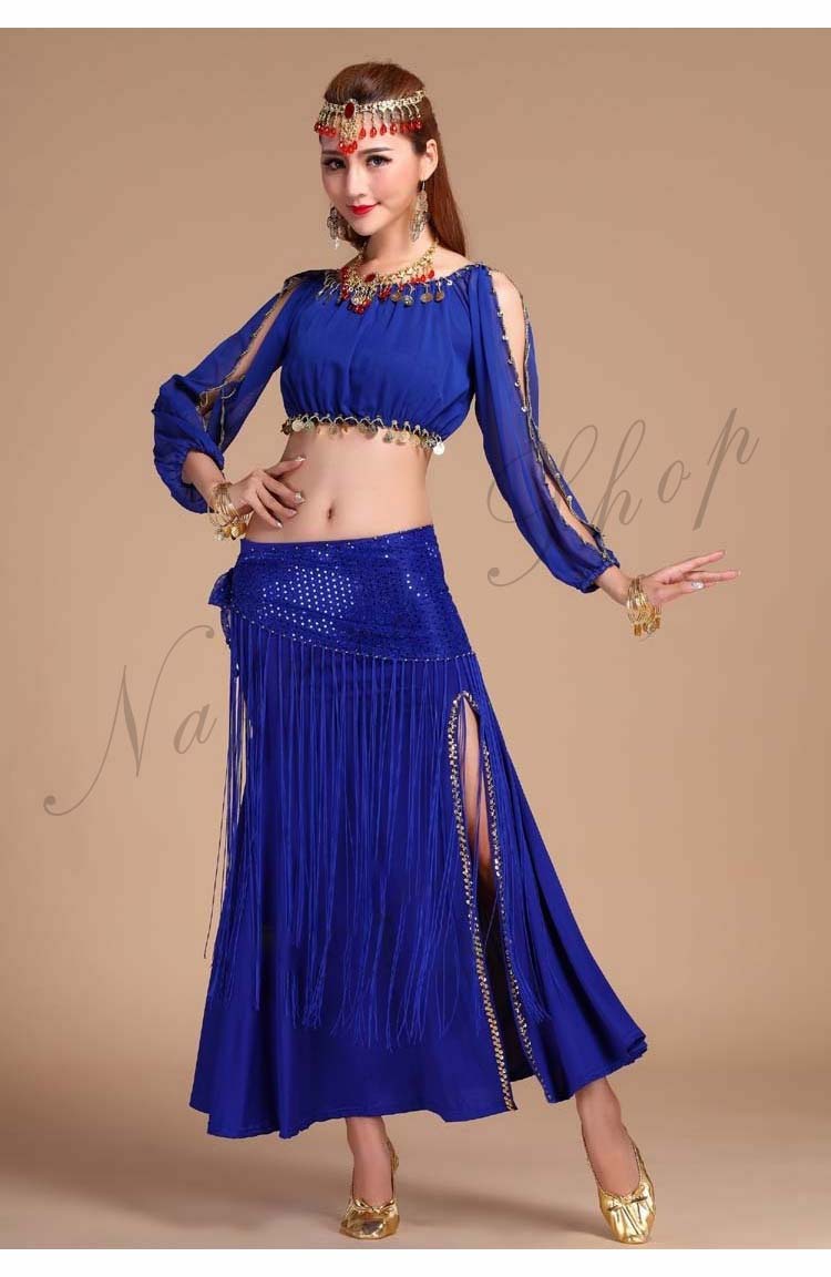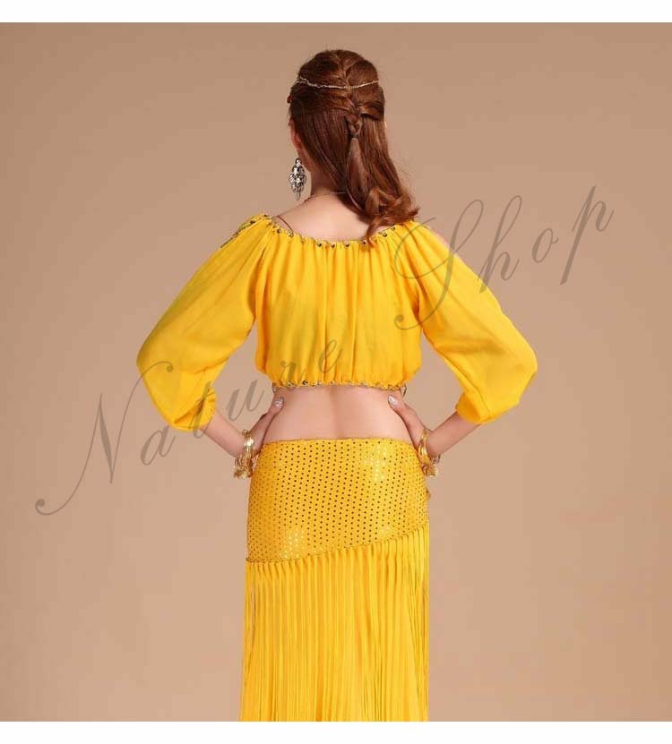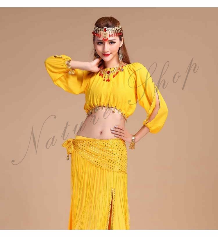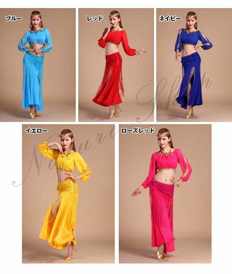 イベントパーティードレス セクシー舞台ダンス衣装 へそ出し長袖ブラウス+スリットタイトスカート3点セット 社交ダンス公演ウエア 団体衣装 フリンジヒップスカーフ 新入荷