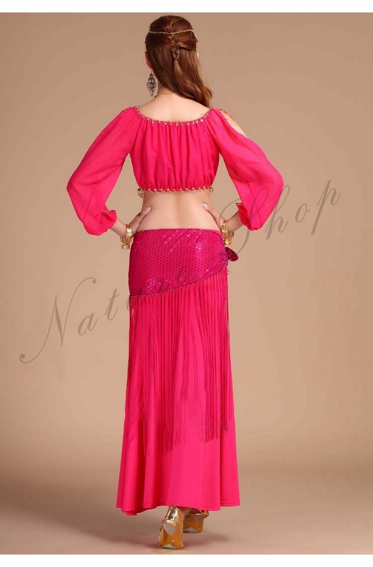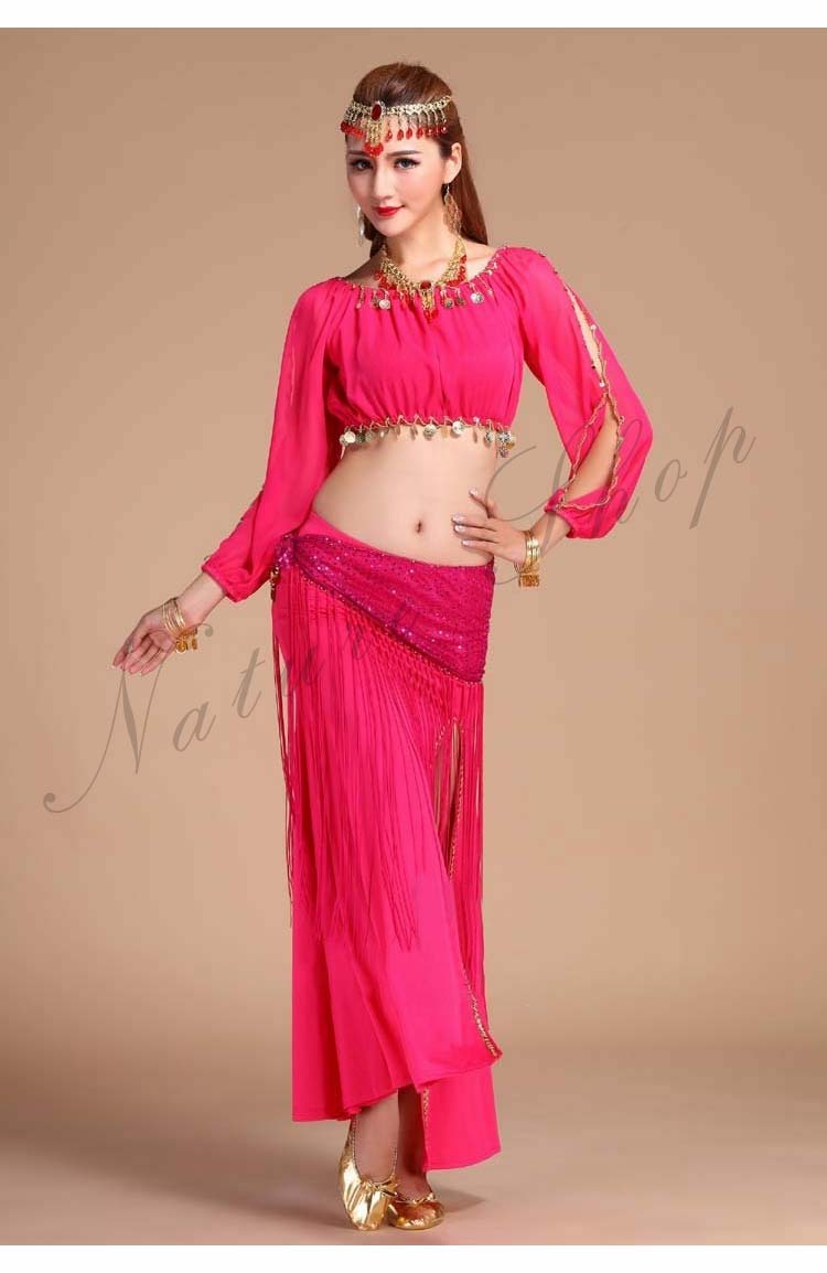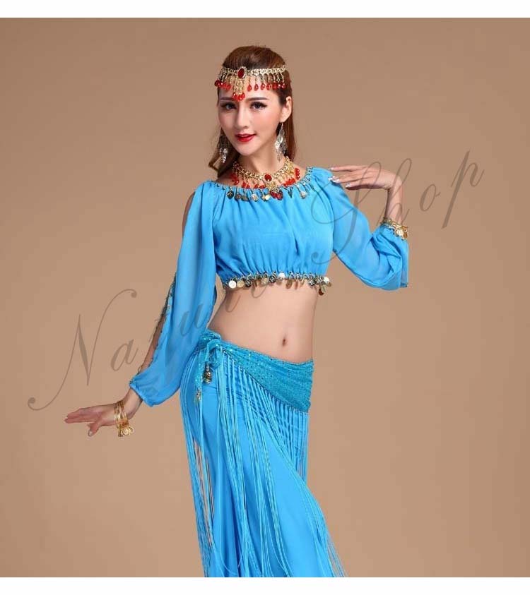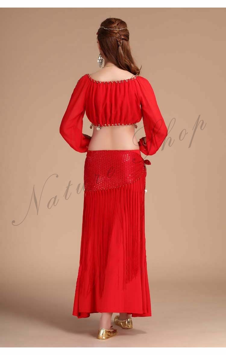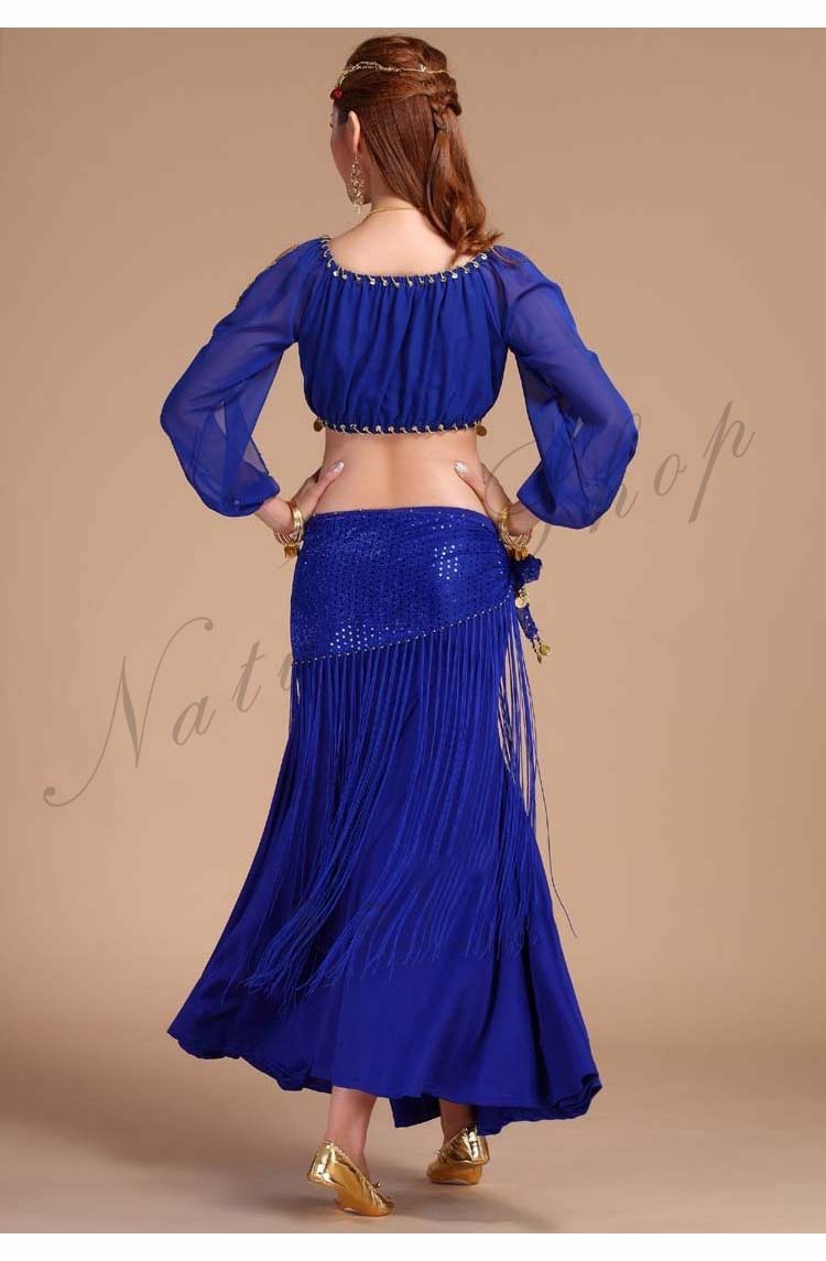 イベントパーティードレス セクシー舞台ダンス衣装 へそ出し長袖ブラウス+スリットタイトスカート3点セット 社交ダンス公演ウエア 団体衣装 フリンジヒップスカーフ 新入荷