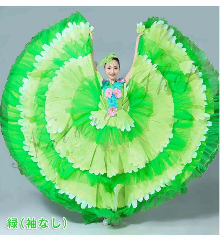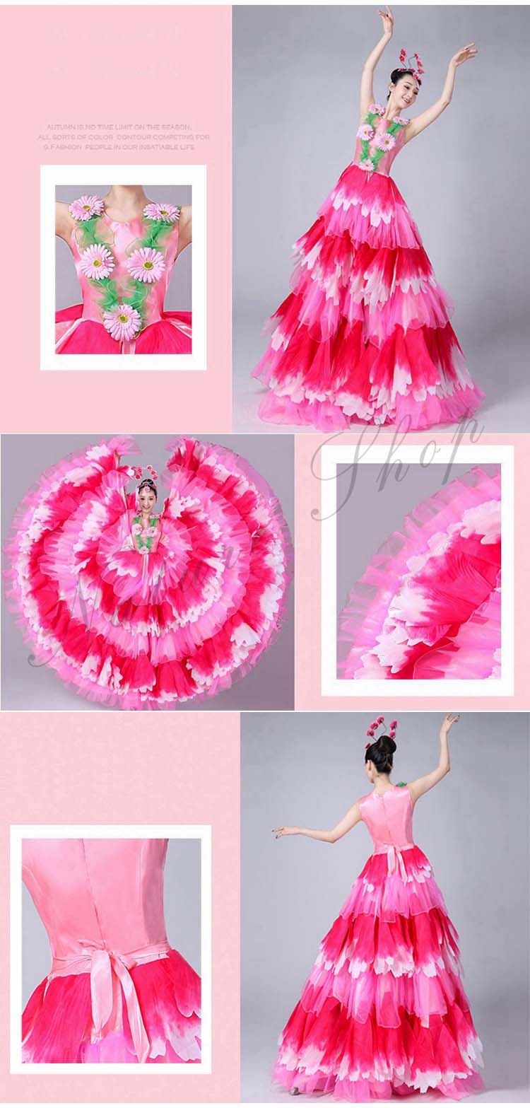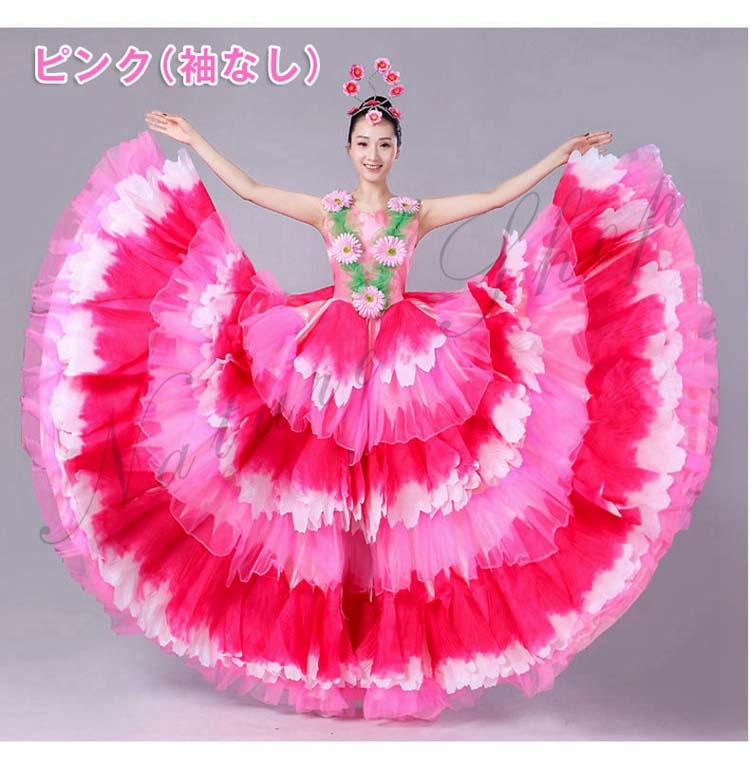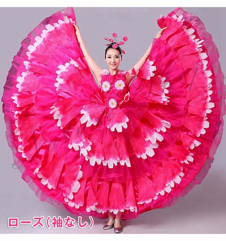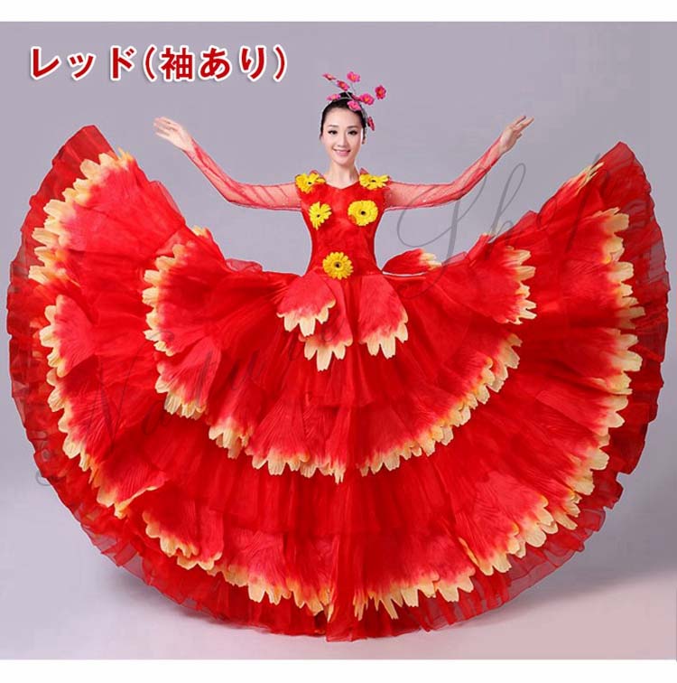ロングワンピース 牡丹 裾フリル 舞台ステージ衣装 民族風ダンス衣装 モダンドレス 髪飾り付 ワルツ レッスン着 ラテンドレス ダンス練習着 社交ダンス衣装 衣装 裾ワタリ360°