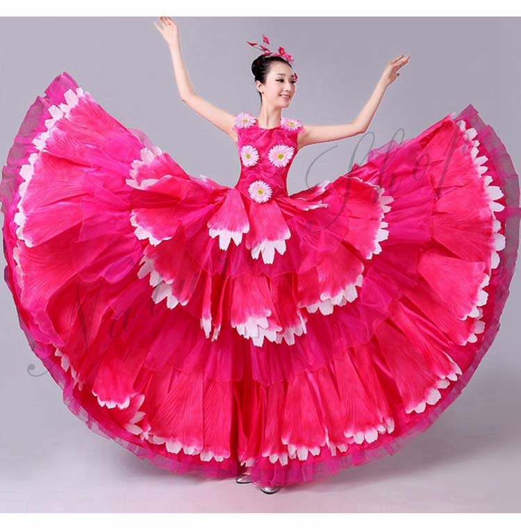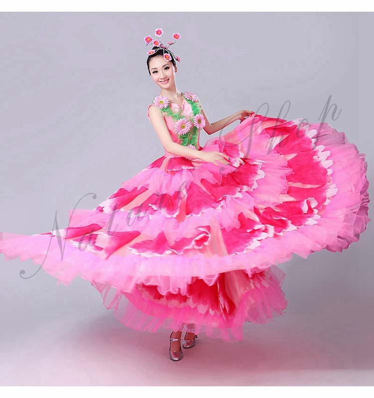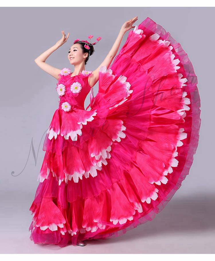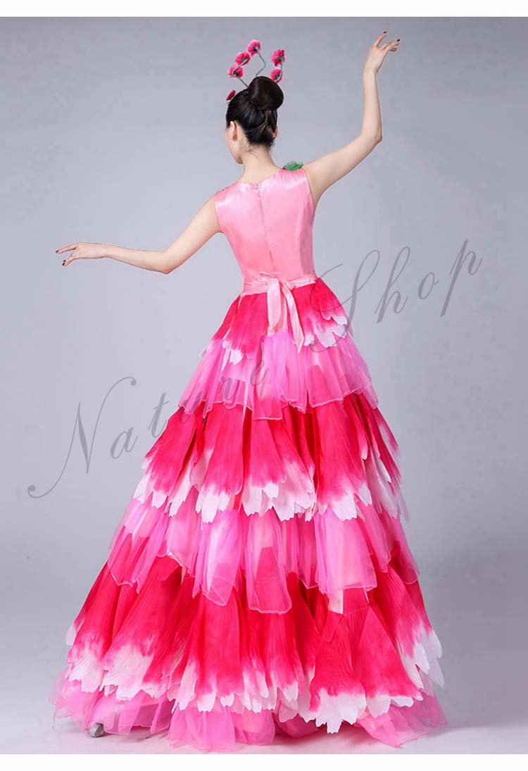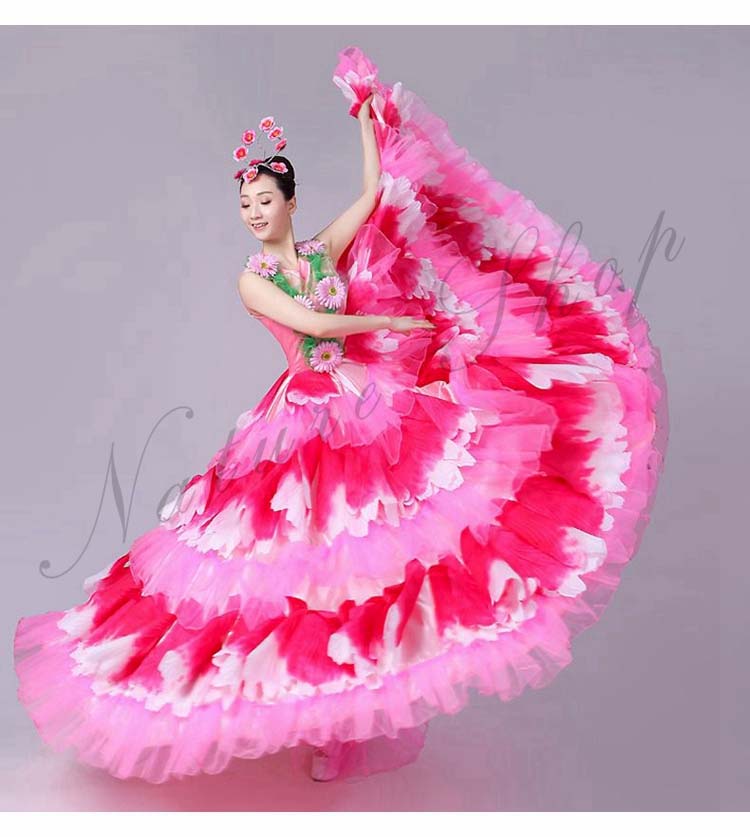 ロングワンピース 牡丹 裾フリル 舞台ステージ衣装 民族風ダンス衣装 モダンドレス 髪飾り付 ワルツ レッスン着 ラテンドレス ダンス練習着 社交ダンス衣装 衣装 裾ワタリ360°