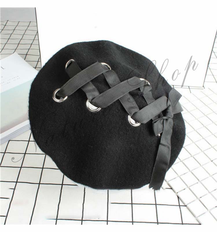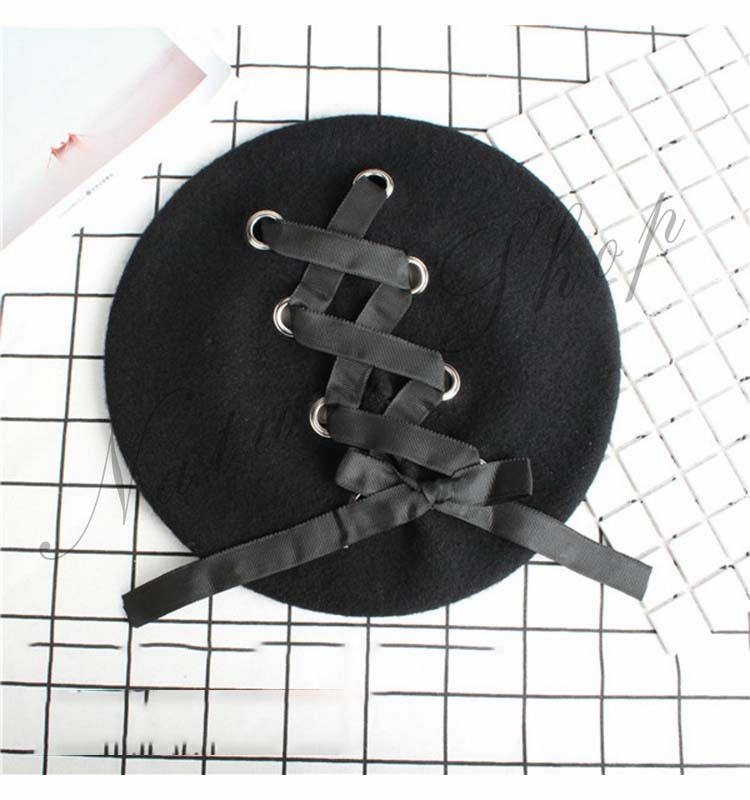 ベレー帽 ブラック レディース メンズ 男女兼用 ユニセックス ゴスロリ パンク ロック 帽子 フリル リボン 靴ひもデザイン お姫様 ゴシック ゆったり 運動会 旅行 ギフト