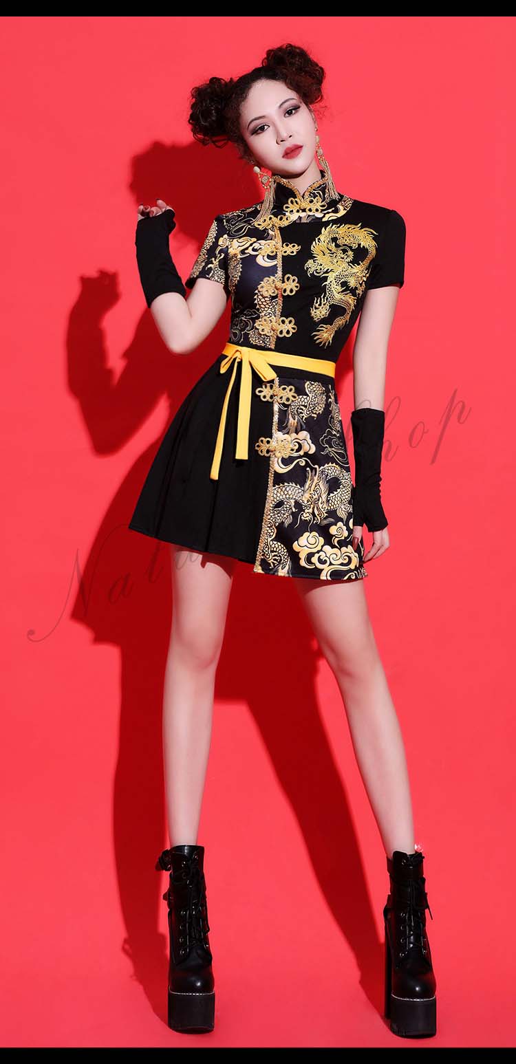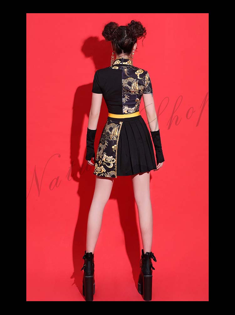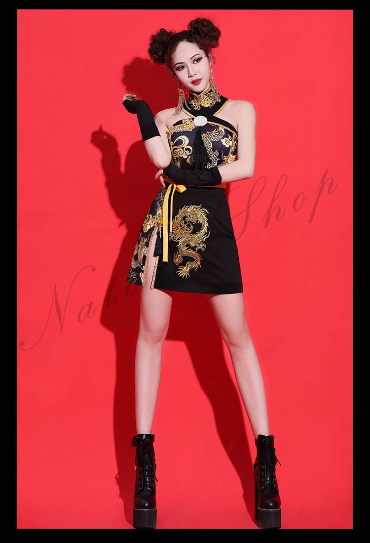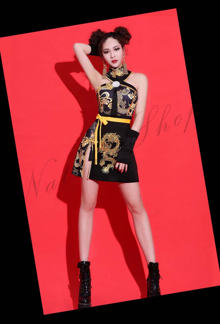 ダンス衣装 レディース 3点セット ワンピース ヒップホップ チャイナ風 ストリート系 HIHOP ファッション 派手 セクシー ハイネック ダンス 衣装