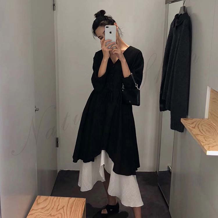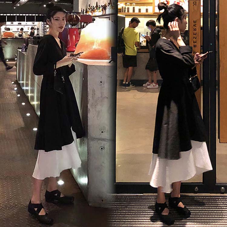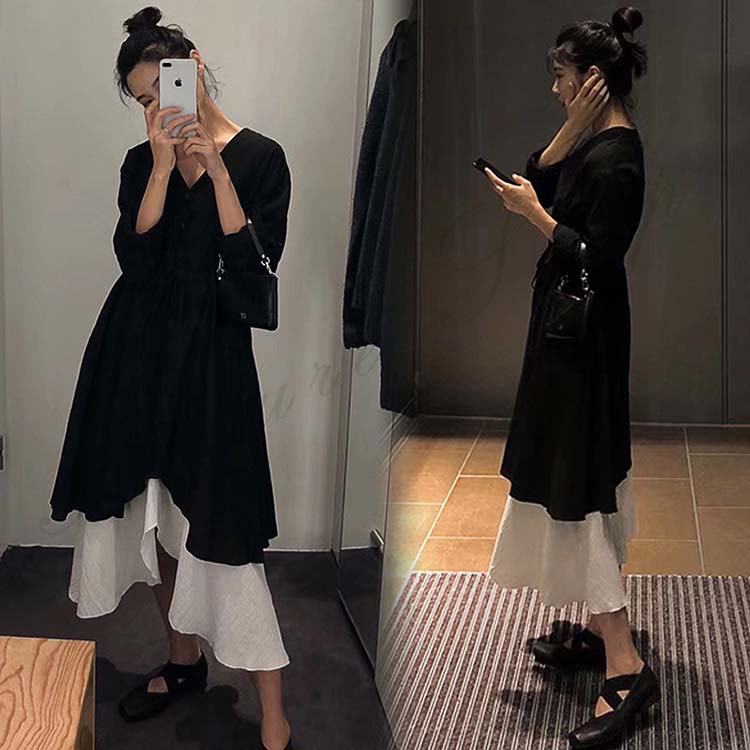 ワンピース 秋冬 長袖 おしゃれ キャミソール ロング ロングブラウス 綿麻 七分袖 マタニティウエア 2点セット
