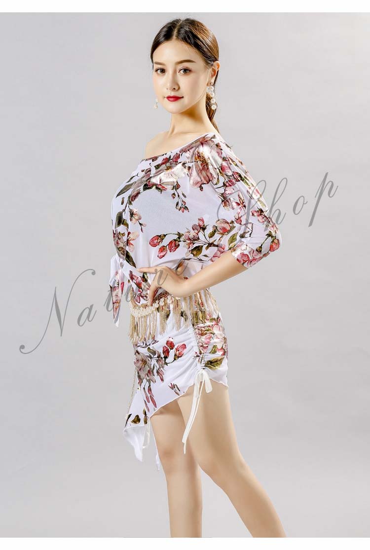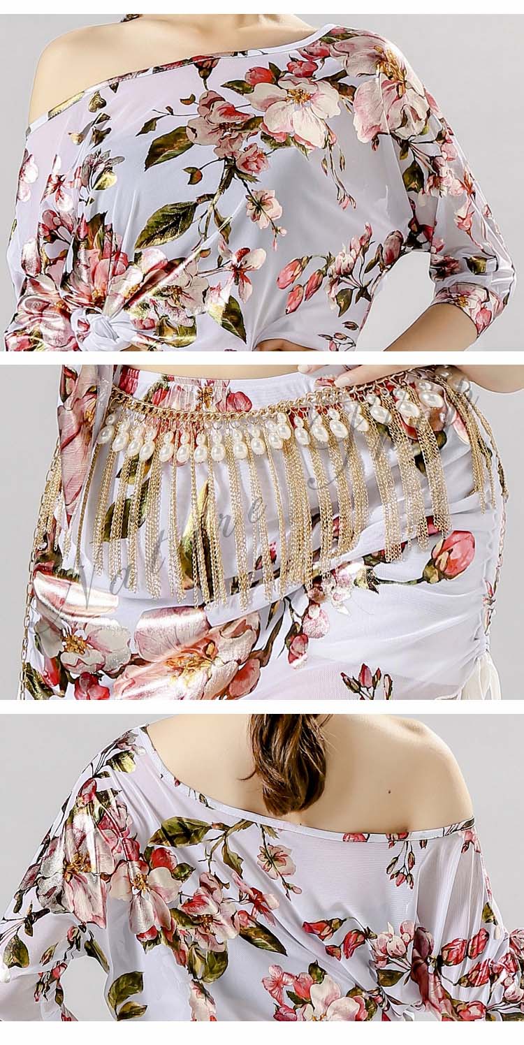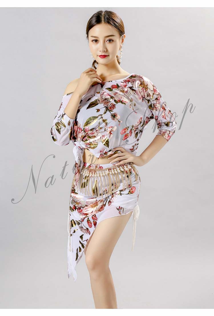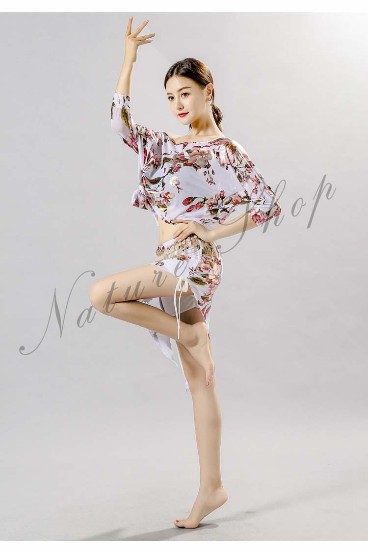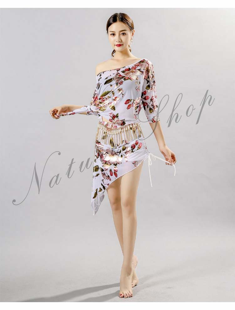 ベリーダンス 衣装 レッスン着2点セット 練習着 レディース社交ダンス衣装 花柄総柄スカーフ ゆったり トップス 半袖 Tシャツ 上下セット スカート セクシー ダンス衣装 大人気