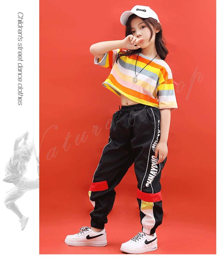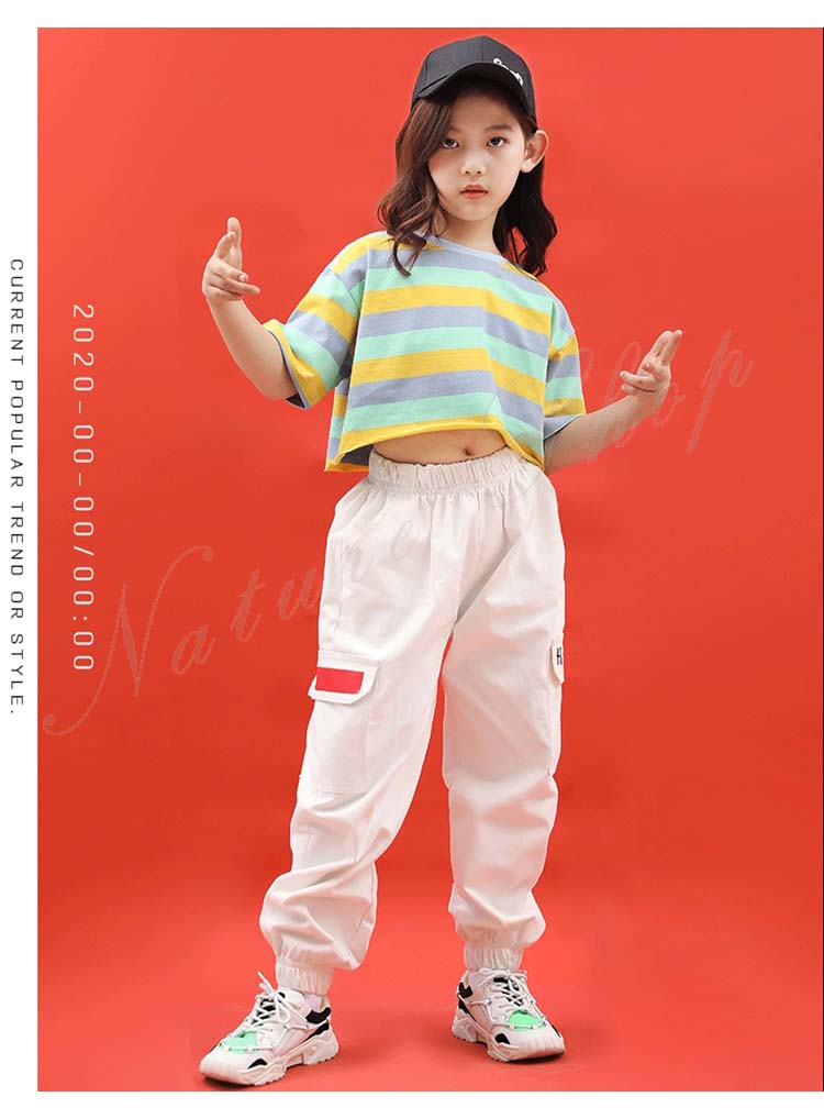 キッズダンス衣装 ダンス衣装 キッズ 半袖 Tシャツ ショートTシャツ へそ出し ロング丈 パンツ ストライプ柄 混色 ゆったり ヒップホップ 衣装 ファッション ダンス レッスン