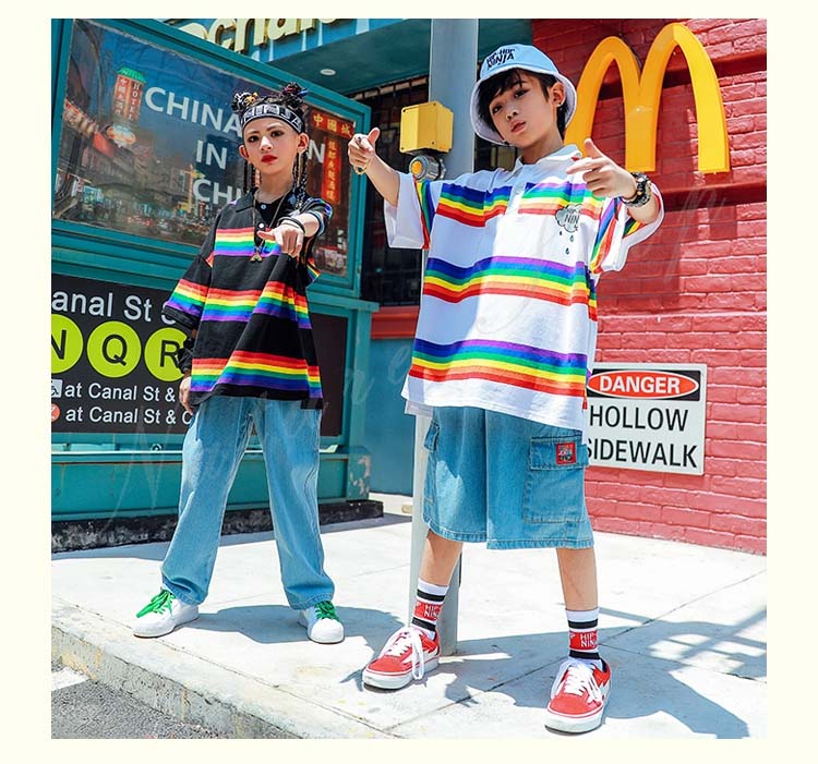 ヒップホップ 衣装 ファッション キッズダンス衣装 ダンス衣装 キッズ 半袖 ポロシャツ 虹柄 ボーダー柄 ジーンズ デニム 長ズボン 半ズボン 子供服 子ども服