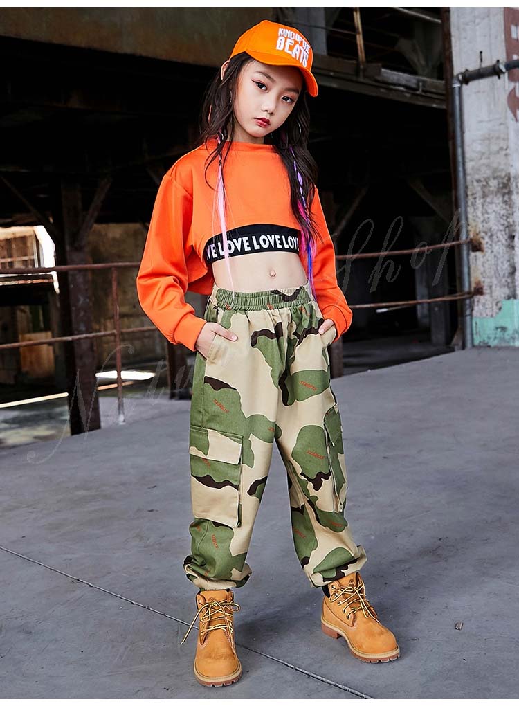 ダンスウェア レディース おしゃれ 子供 ジュニア ダンス衣装 パンツ トップス ダンス 衣装 ヒップホップ 長袖 パーかー へそ出し ロング丈ズボン 迷彩 舞台 演出 練習 カジュアル