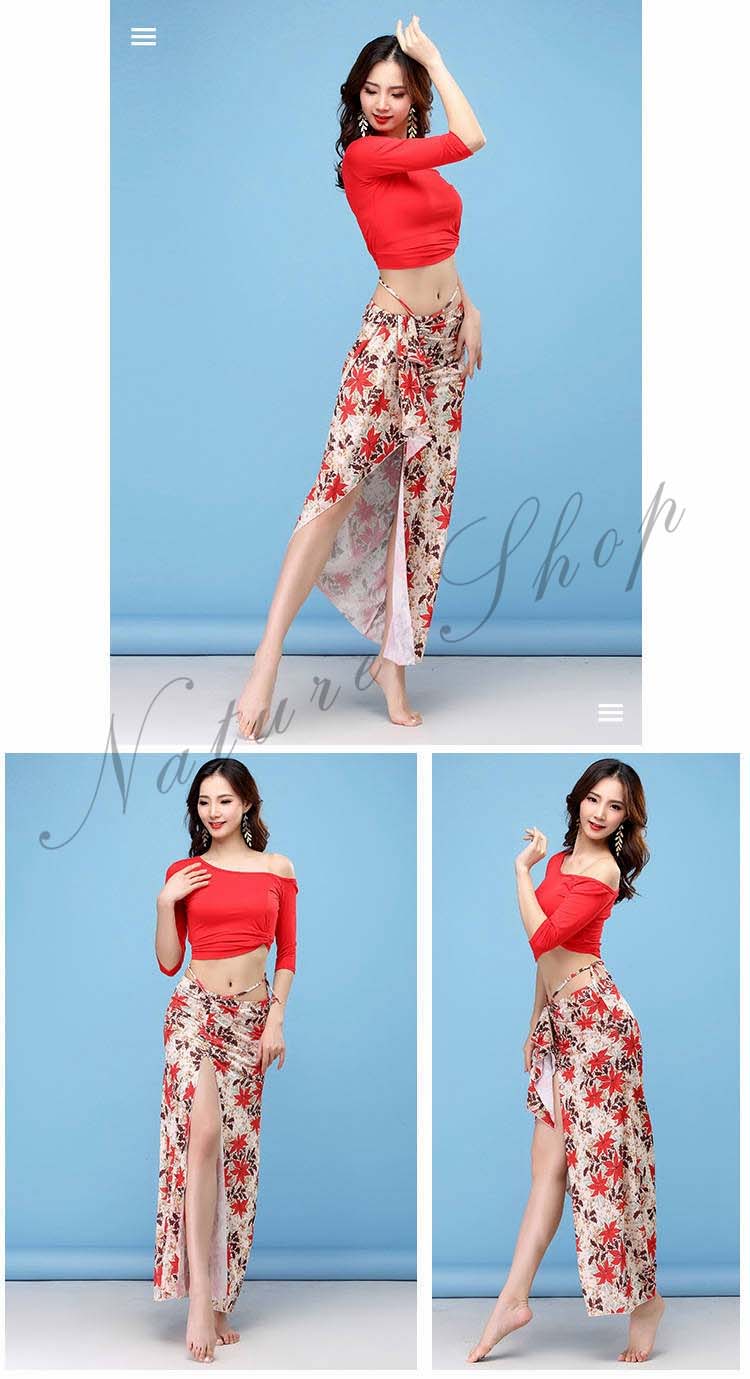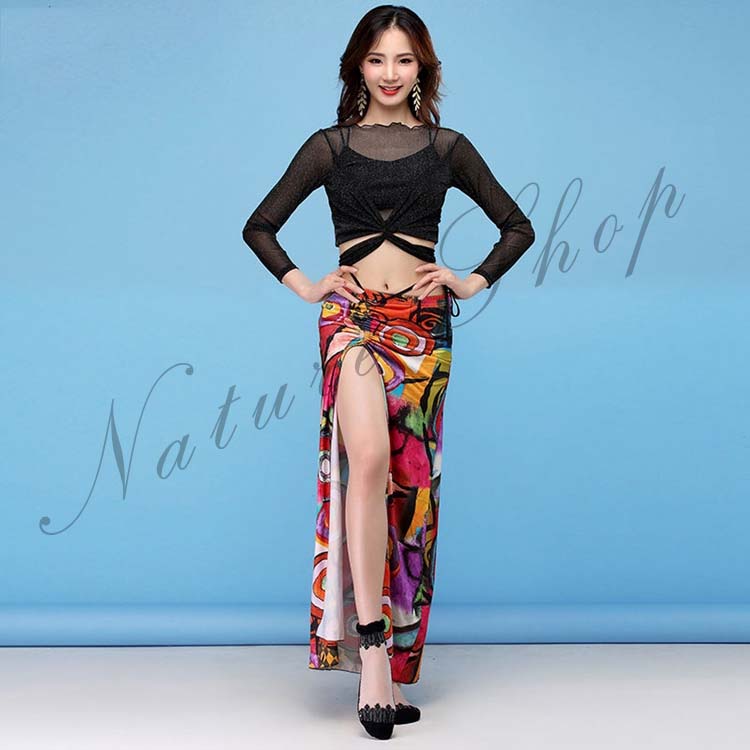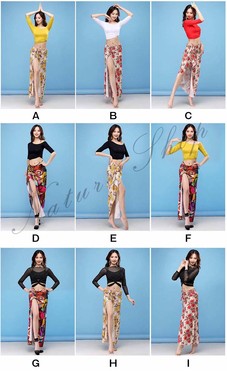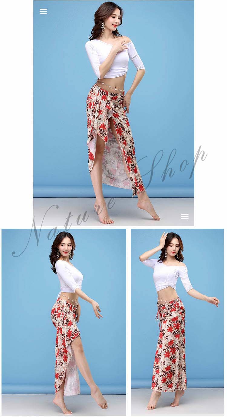 ベリーダンス トップス ロング スカート スリット ダンス コスチューム 練習着 5分丈 ショート シースルー プリント 衣装 ヒップスカート セット