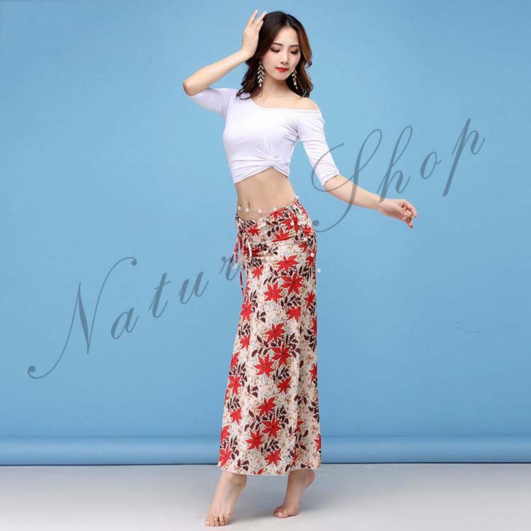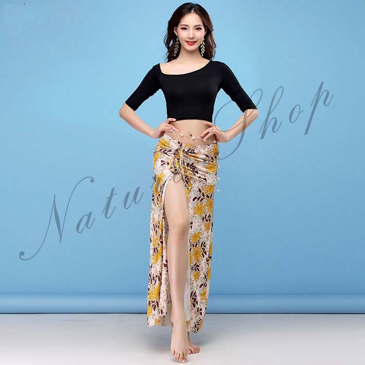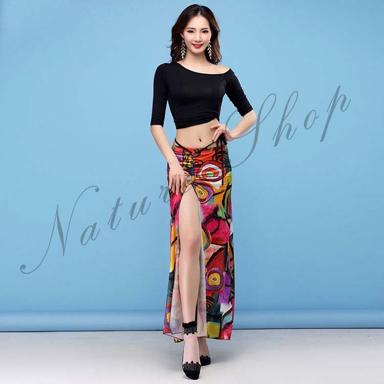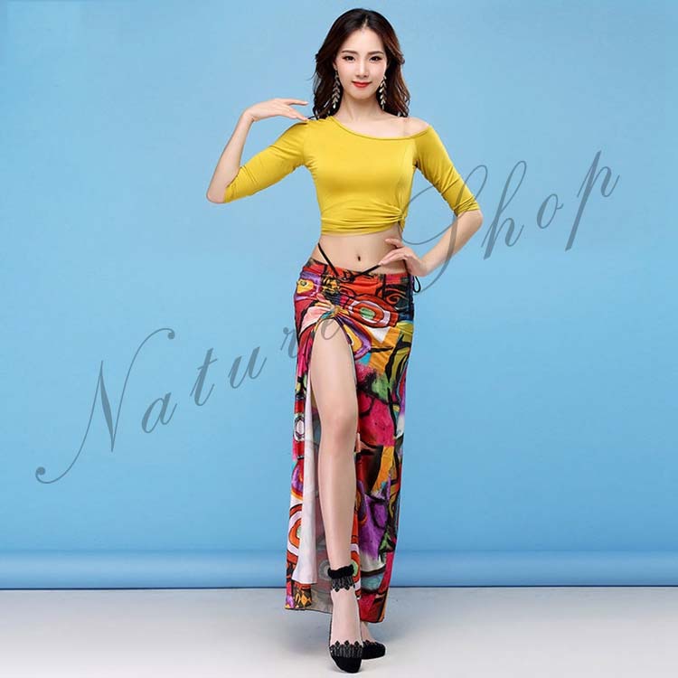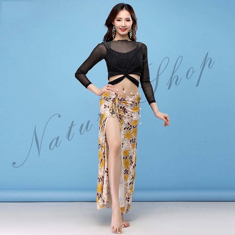 ベリーダンス トップス ロング スカート スリット ダンス コスチューム 練習着 5分丈 ショート シースルー プリント 衣装 ヒップスカート セット