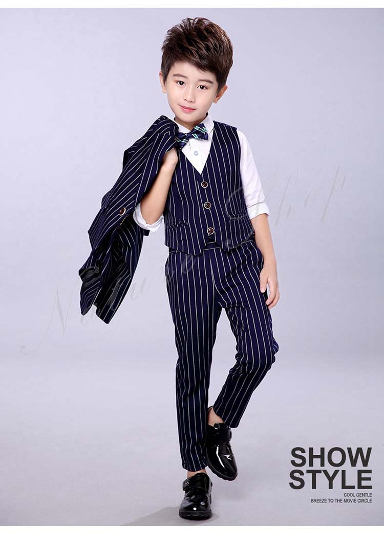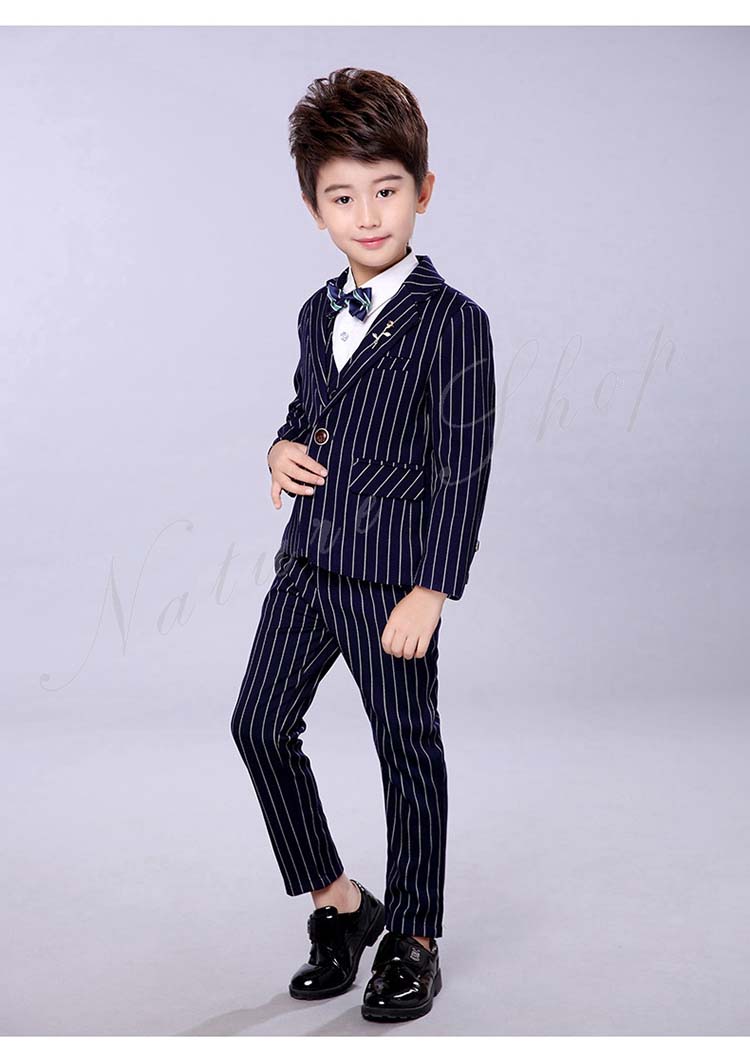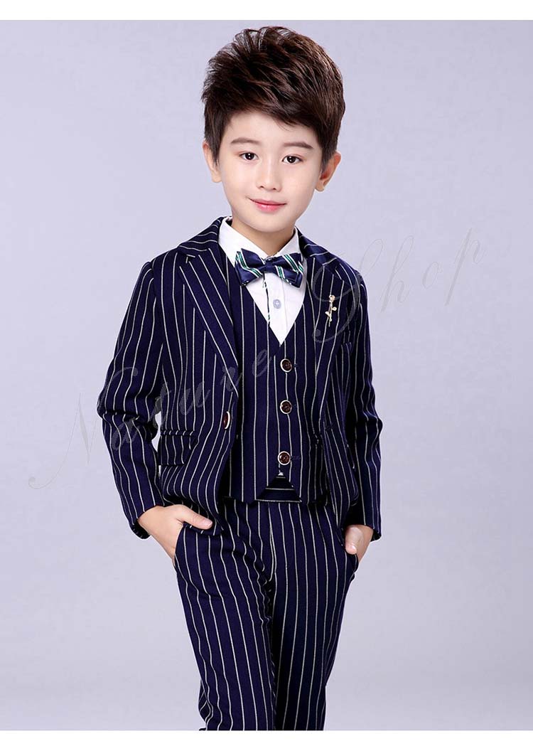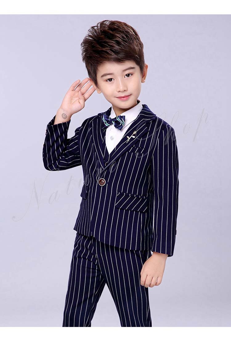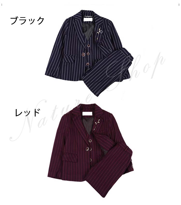 子供服 フォーマル 男の子 セットアップ 上下セット 長ズボン ロング丈パンツ スーツベスト スーツジャケット ストライプ柄 蝶ネクタイ プローチ 入学式 卒業式 発表会