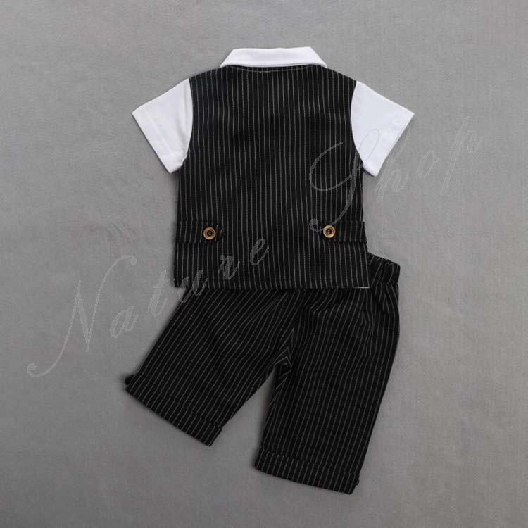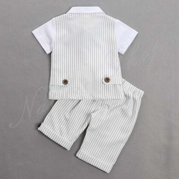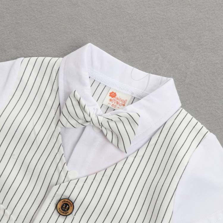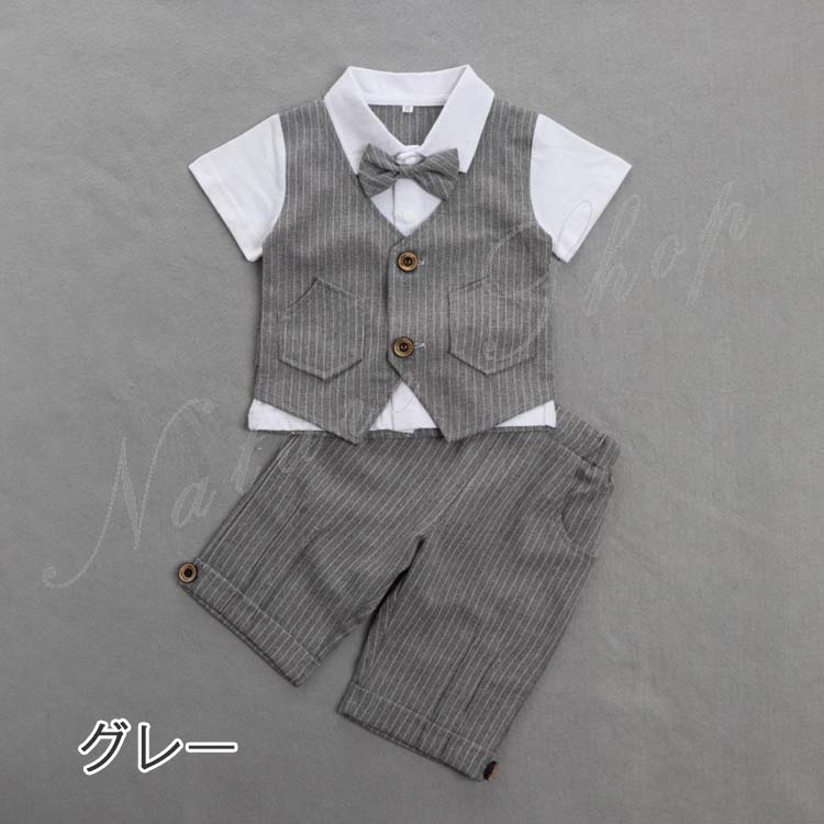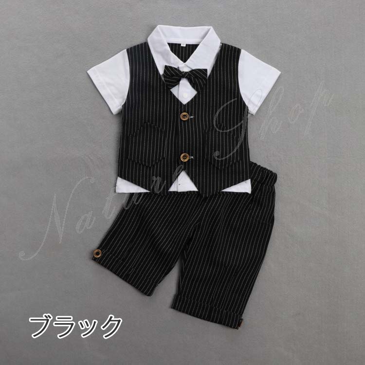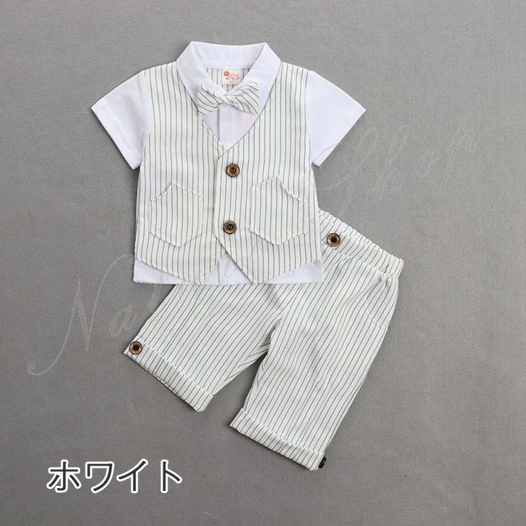 ベビー服 セットアップ 夏 半袖 トップス ストライプ柄 蝶ネクタイ飾り 偽ベスト 短パン ショートパンツ 上下 2点セット 紳士 カジュアル 5colors 子供 スーツ 結婚式 親族
