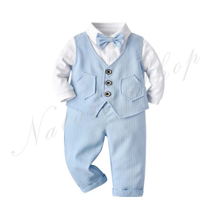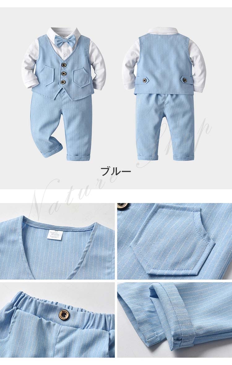 子供 スーツ 結婚式 親族 表彰式 フォーマルスーツ 男の子 おしゃれ こども シャツ ワイシャツ 長袖 蝶ネクタイ付き ベスト 長ズボン ストライプ柄 ベビー服 2色選べる 紳士